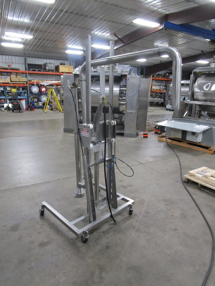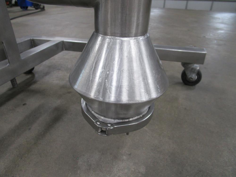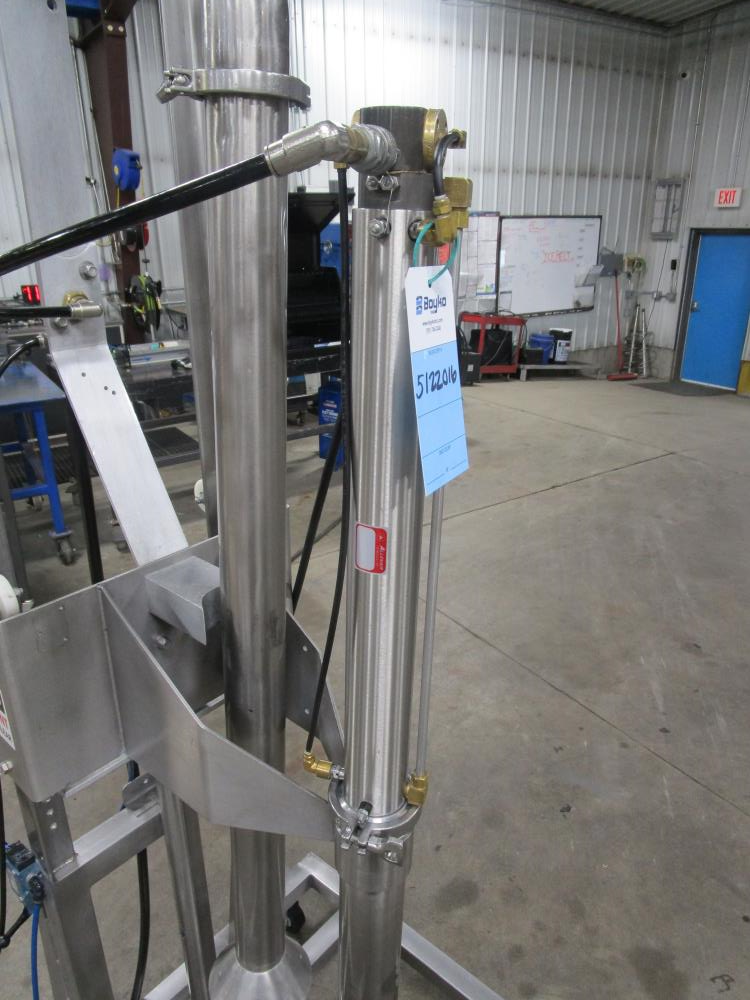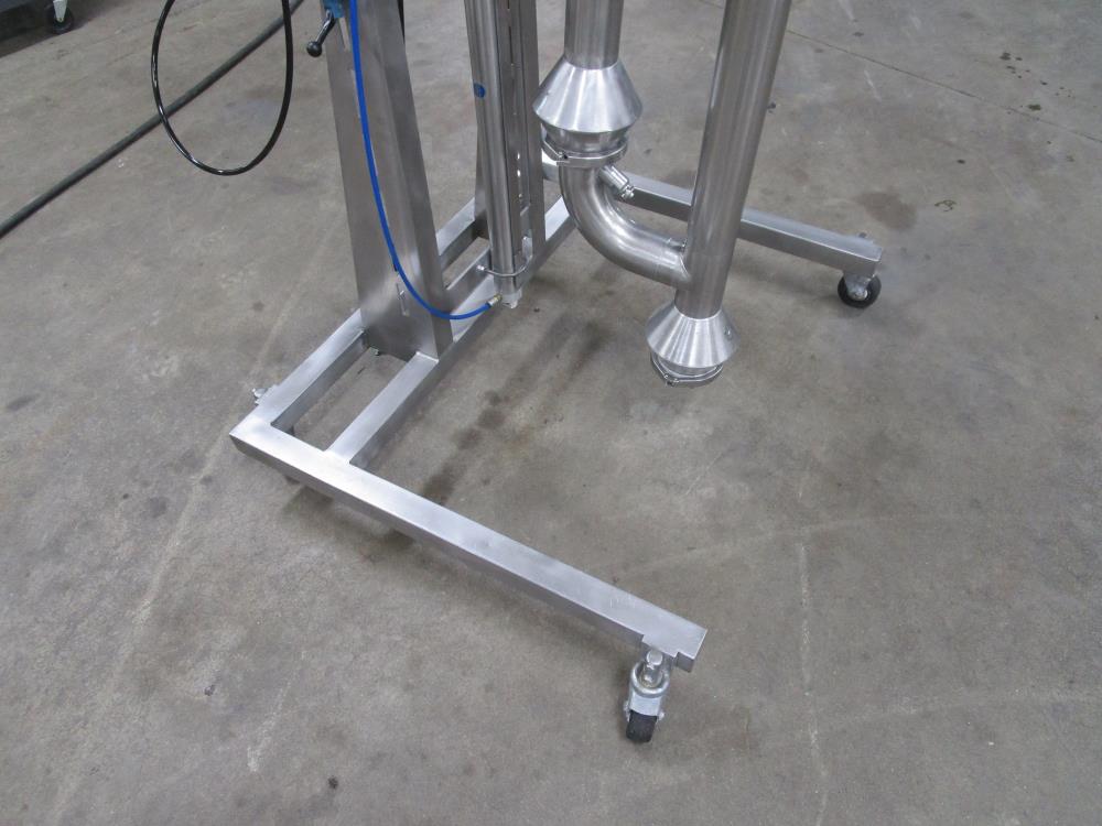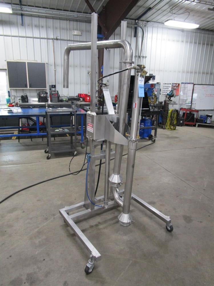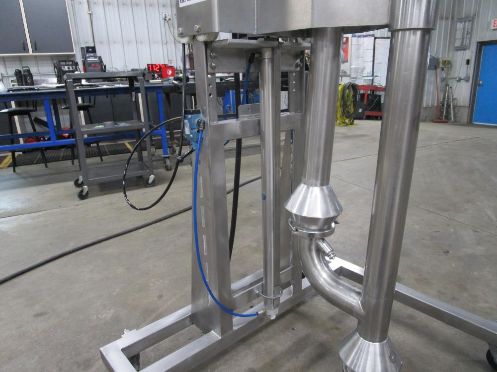 Food Makers Equipment hopper topper transfer pump. SN UE11584. Infeed 4 in. diameter, 7 in. to 36 in. clearance. Discharge 3 in. diameter, 62 in. to 92 in. clearance. Adjustable cylinder height. Pneumatic Allenair cylinder. SS frame, on casters