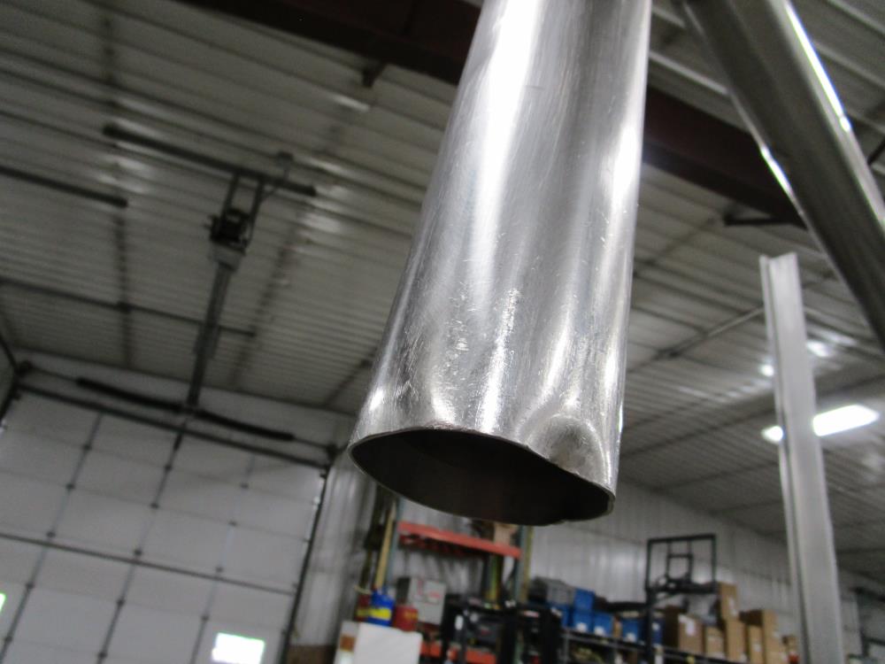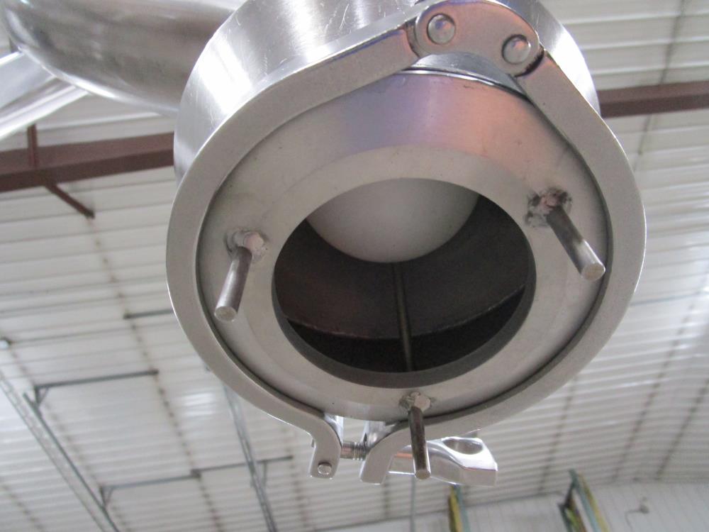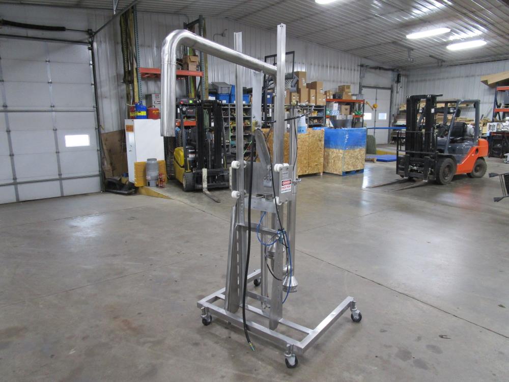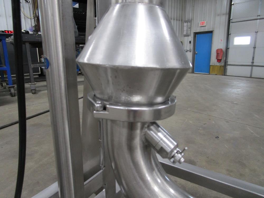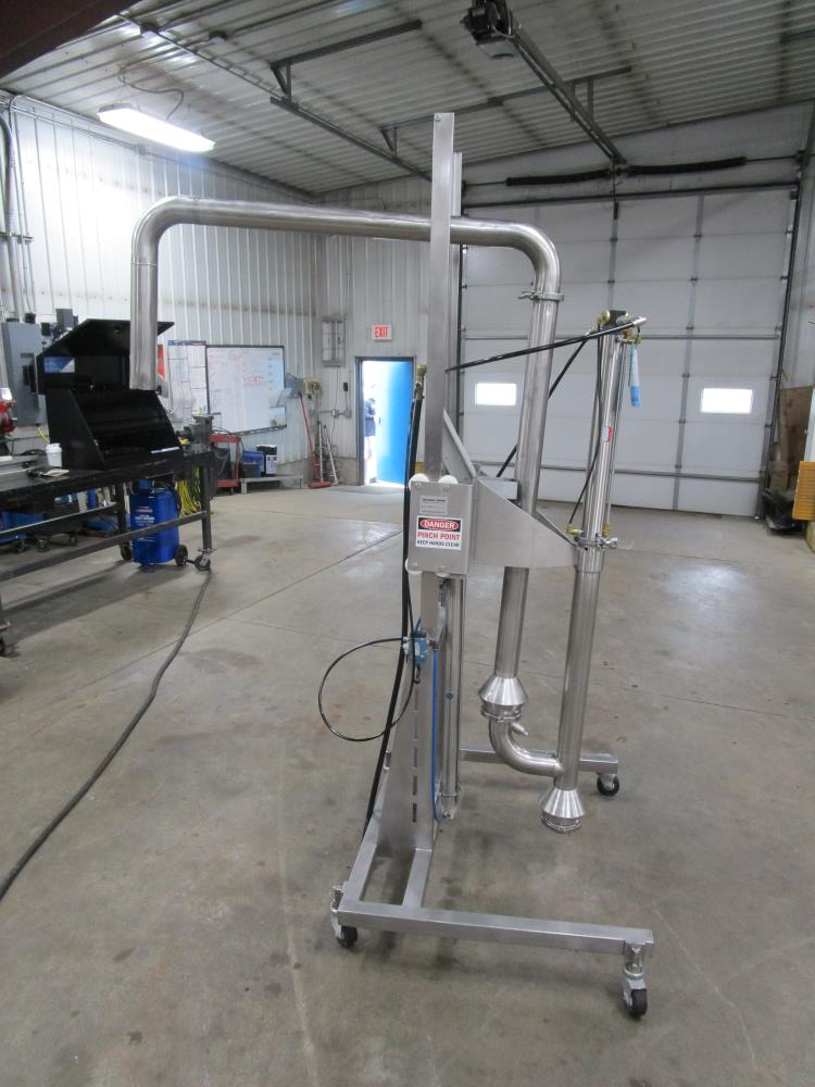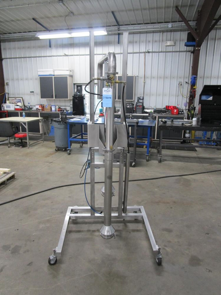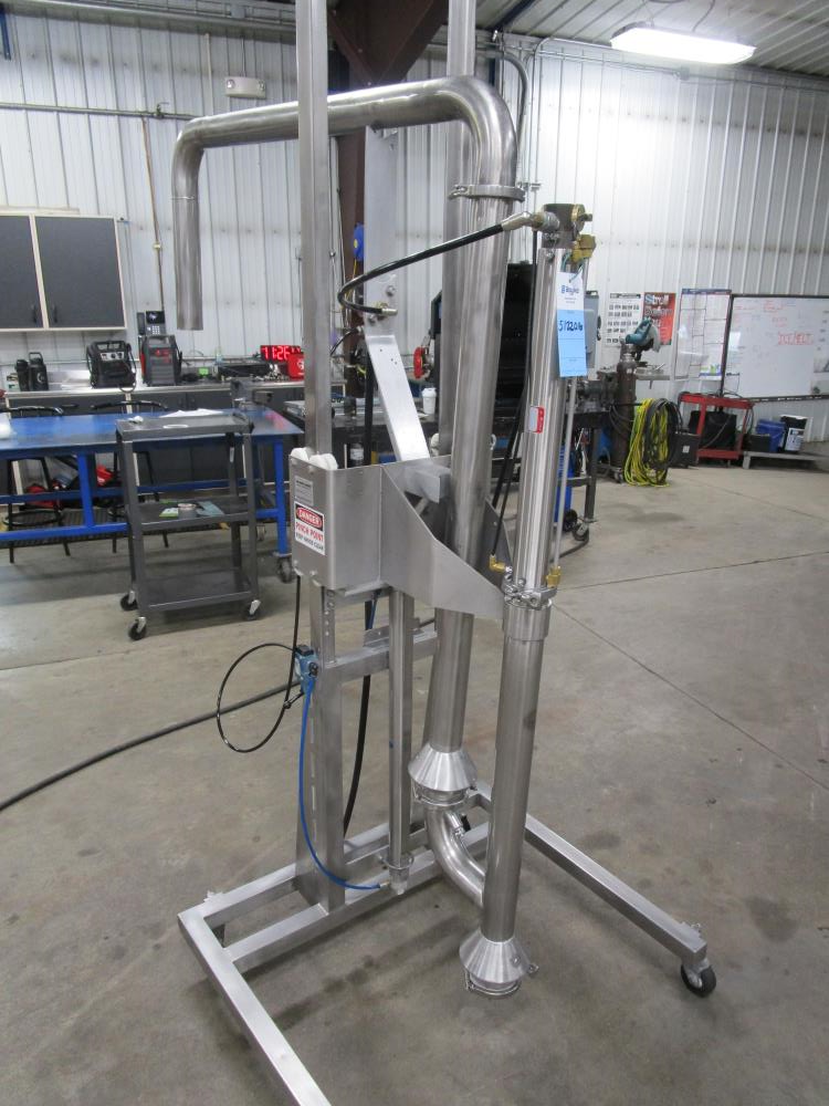 Food Makers Equipment hopper topper transfer pump. SN UE11584. Infeed 4 in. diameter, 7 in. to 36 in. clearance. Discharge 3 in. diameter, 62 in. to 92 in. clearance. Adjustable cylinder height. Pneumatic Allenair cylinder. SS frame, on casters