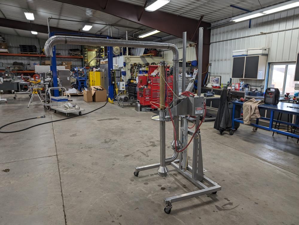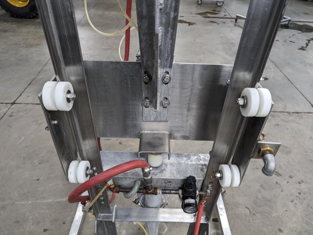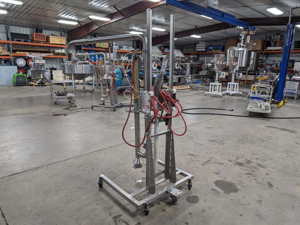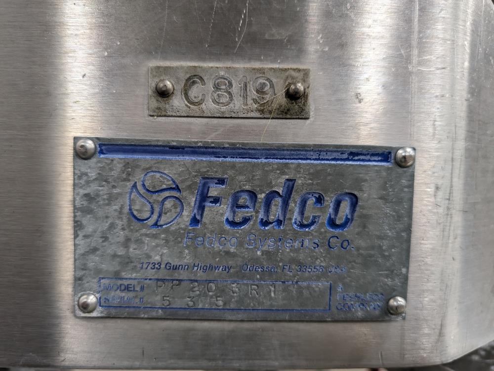 Fedco PP20-3R1 Mobile Bowl Pump, SN: 535. 4 in. dia. infeed, 3 in. dia. discharge. 9 in. tall height (when completely down), 72 in. discharge height. 13 in. dia. top plate. SS frame, on casters, Pneumatic raise and lower. Overall Dimensions: 40 in. long x 36 in. wide x 89.5 in. tall. (Without discharge pipe mounted)