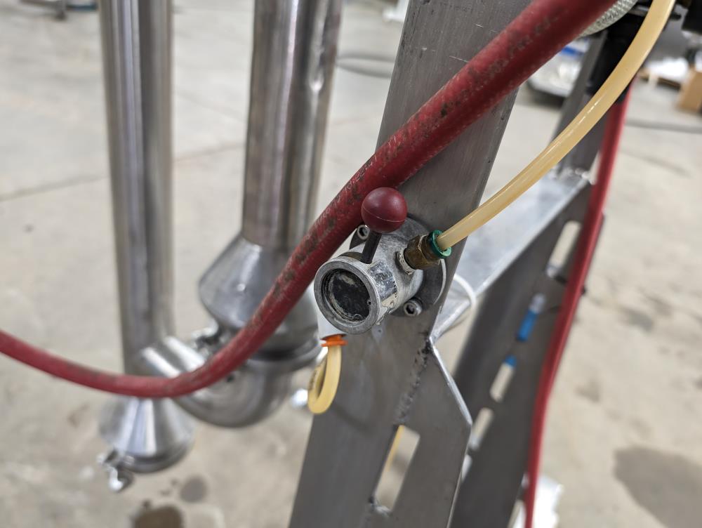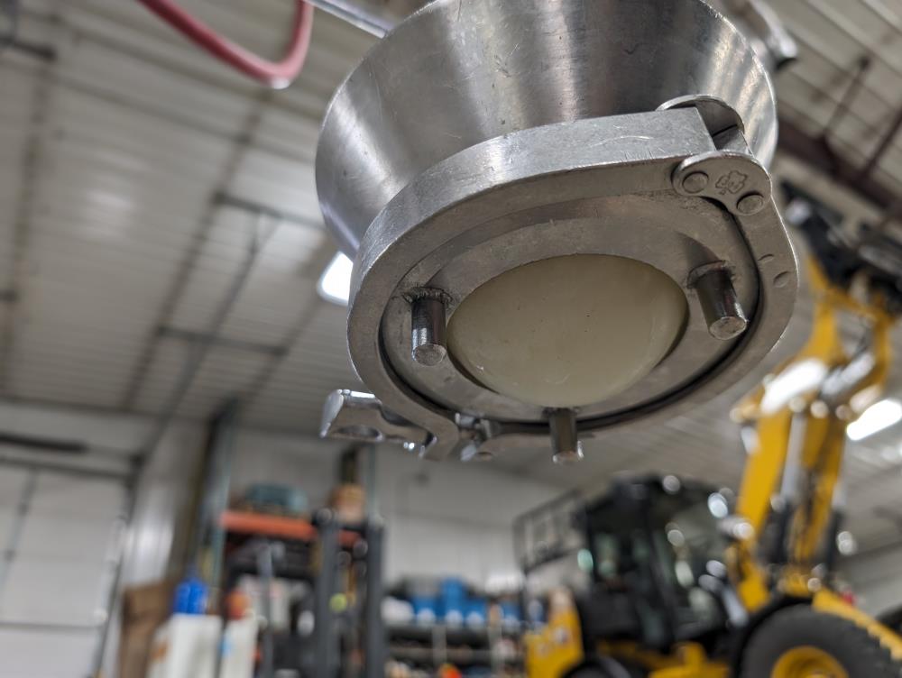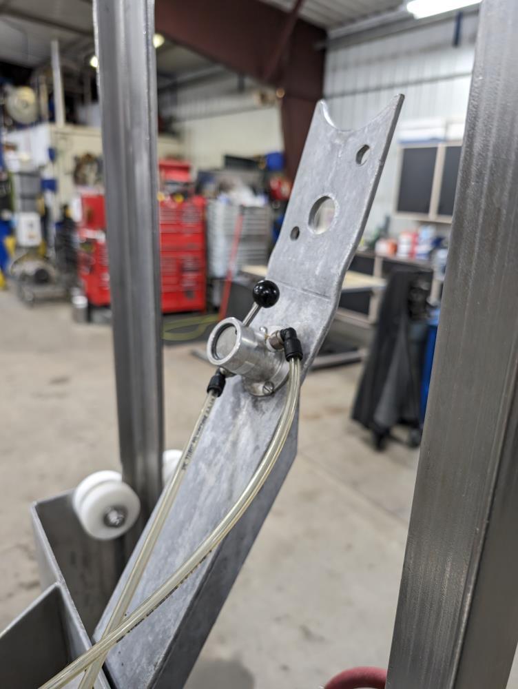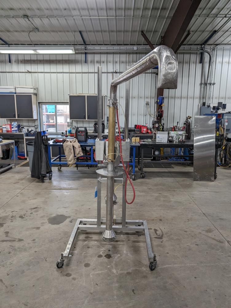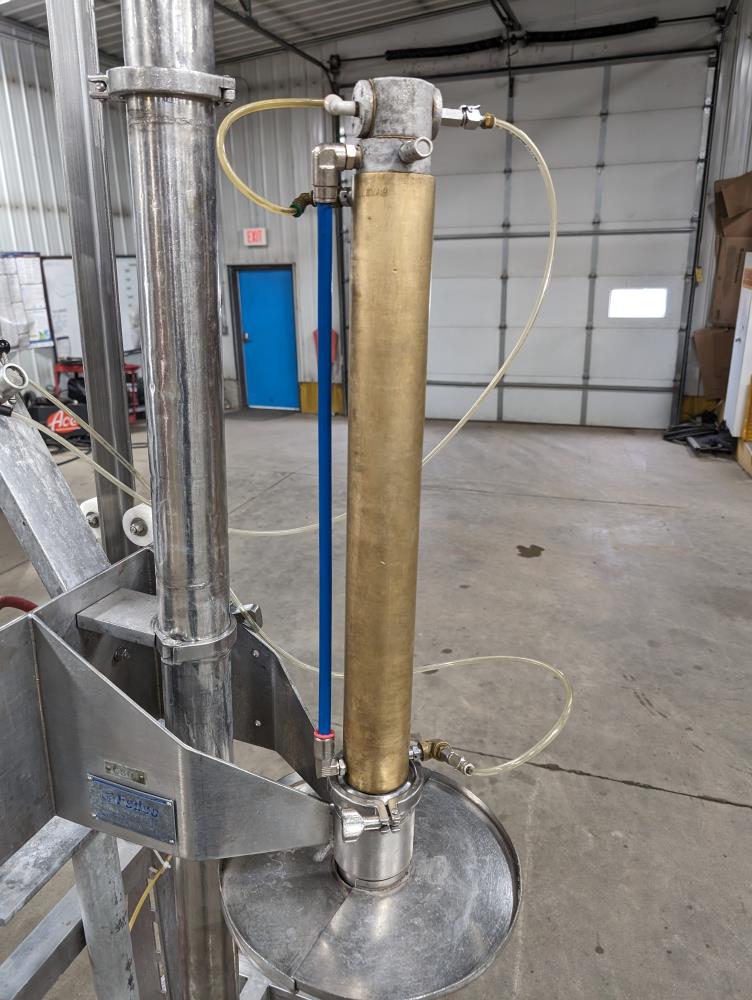 Fedco PP20-3R1 Mobile Bowl Pump, SN: 535. 4 in. dia. infeed, 3 in. dia. discharge. 9 in. tall height (when completely down), 72 in. discharge height. 13 in. dia. top plate. SS frame, on casters, Pneumatic raise and lower. Overall Dimensions: 40 in. long x 36 in. wide x 89.5 in. tall. (Without discharge pipe mounted)
