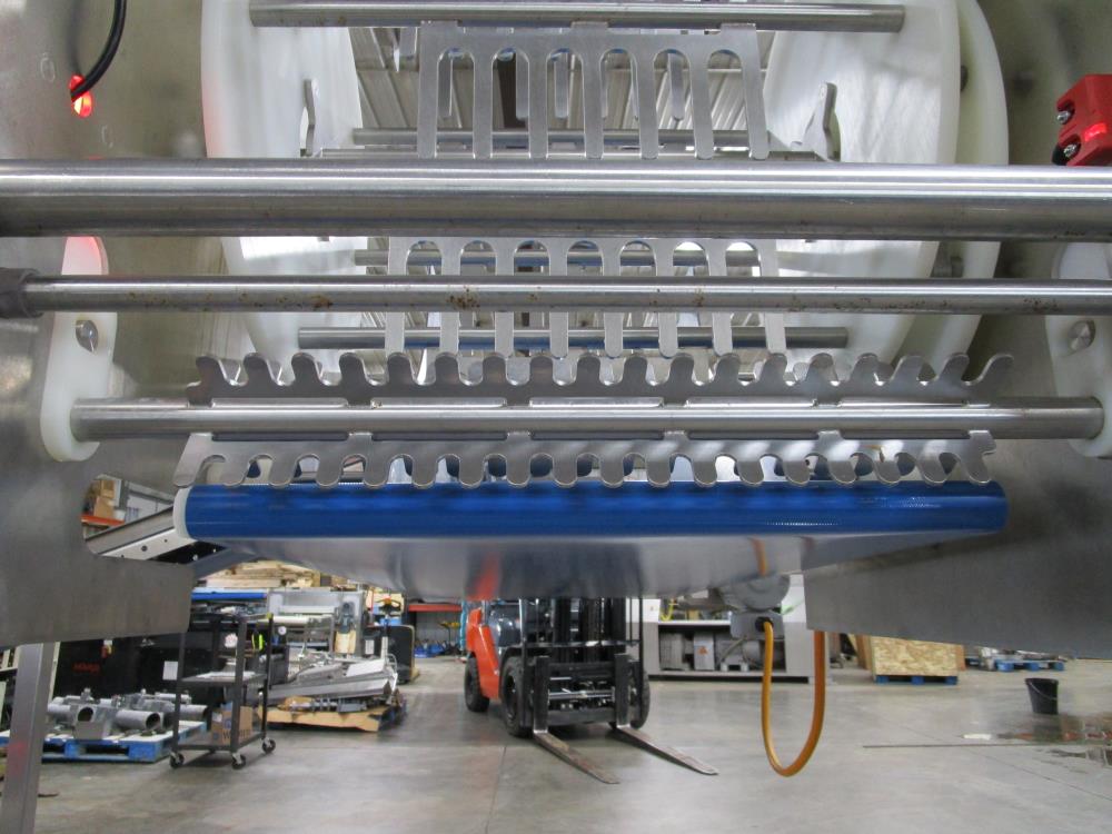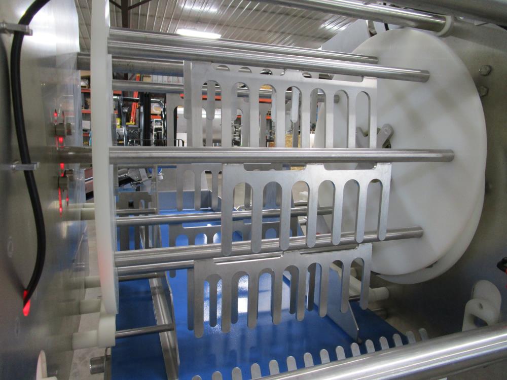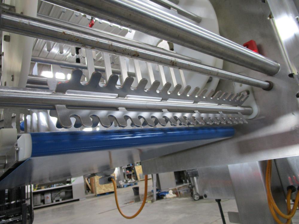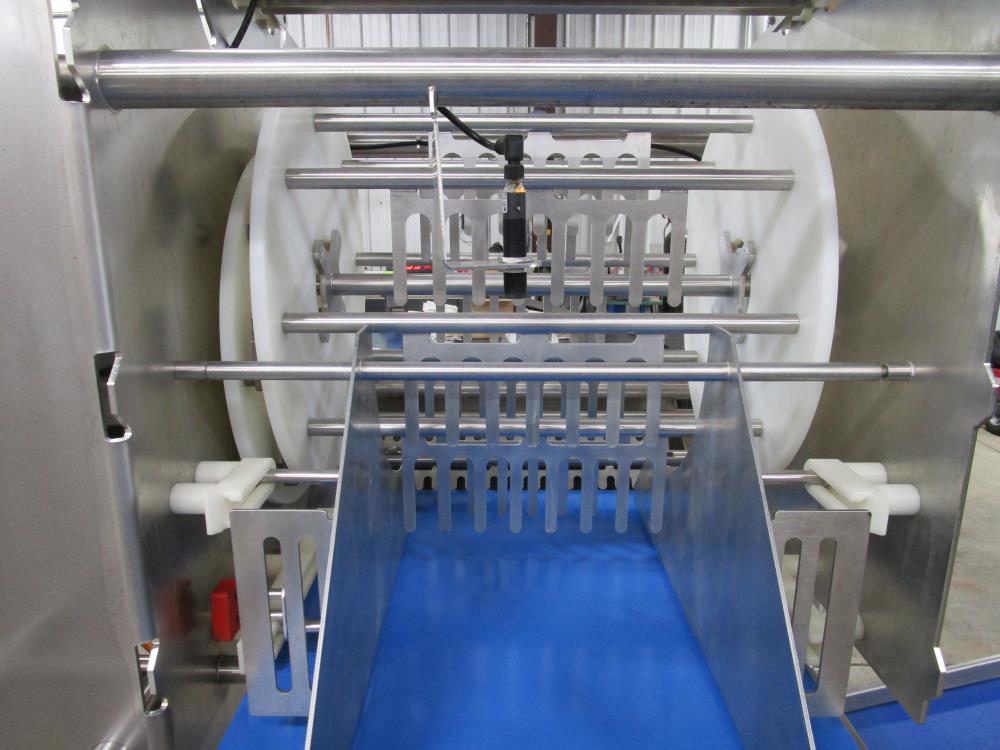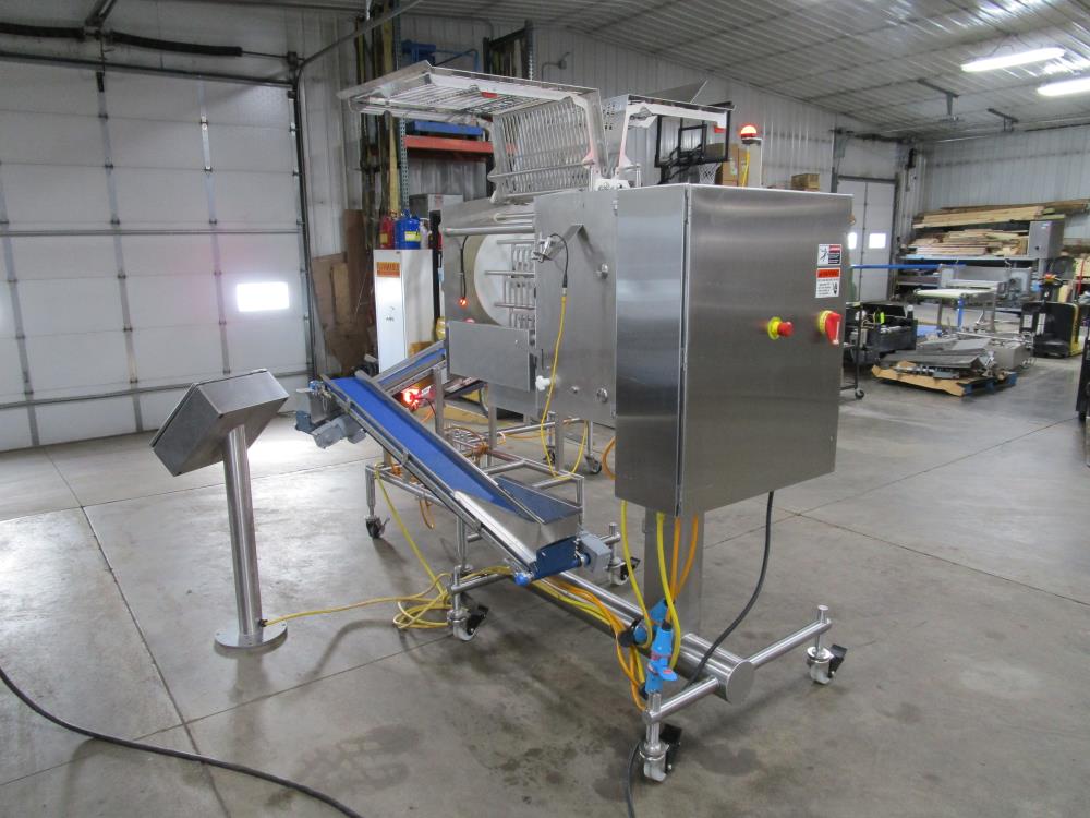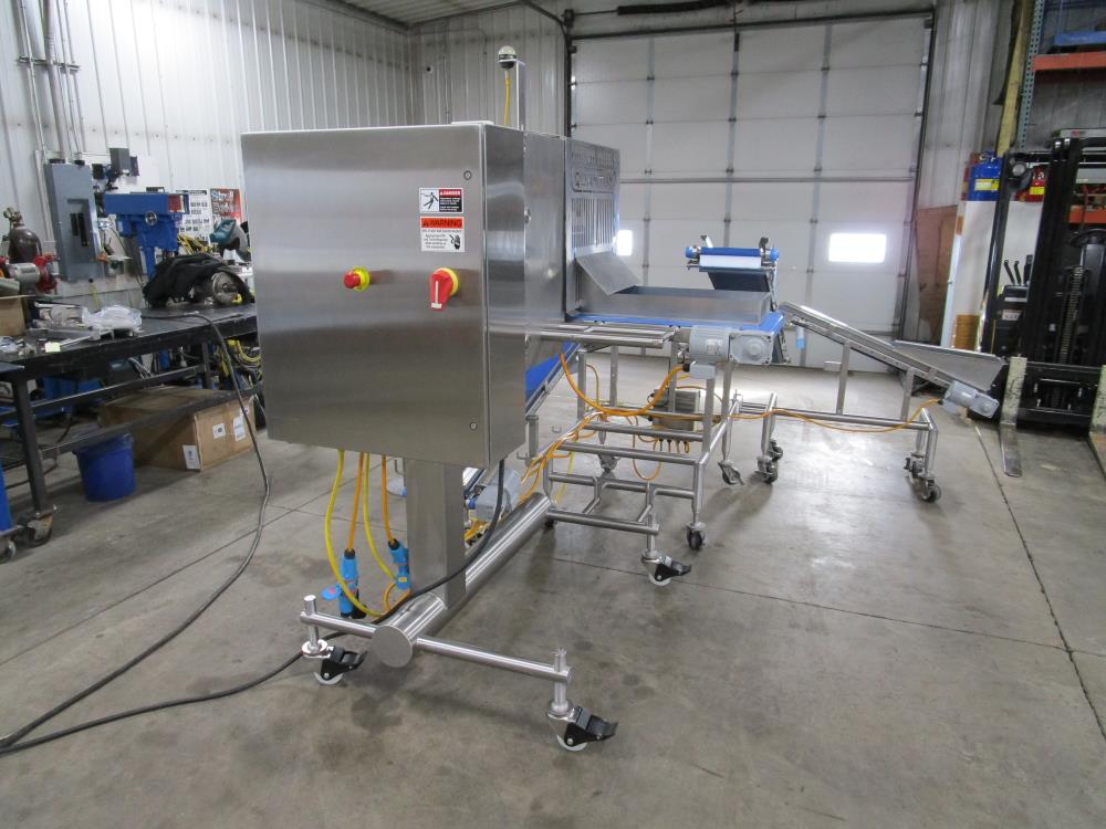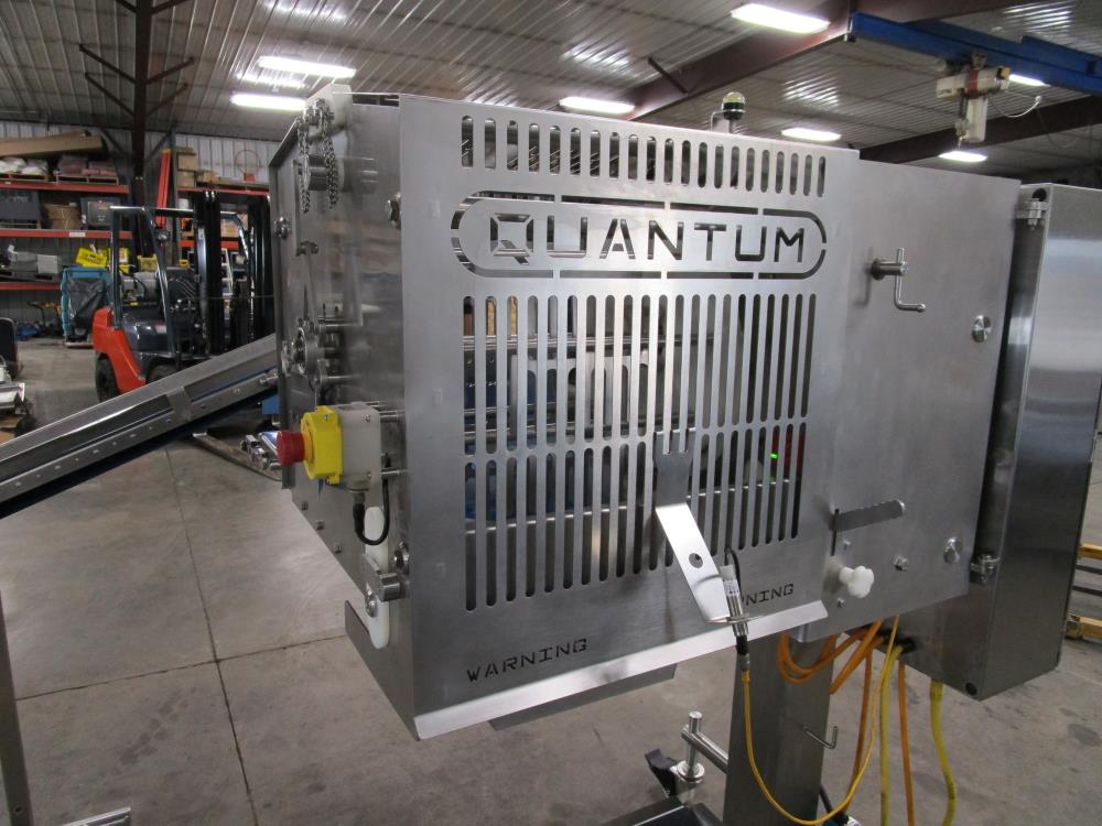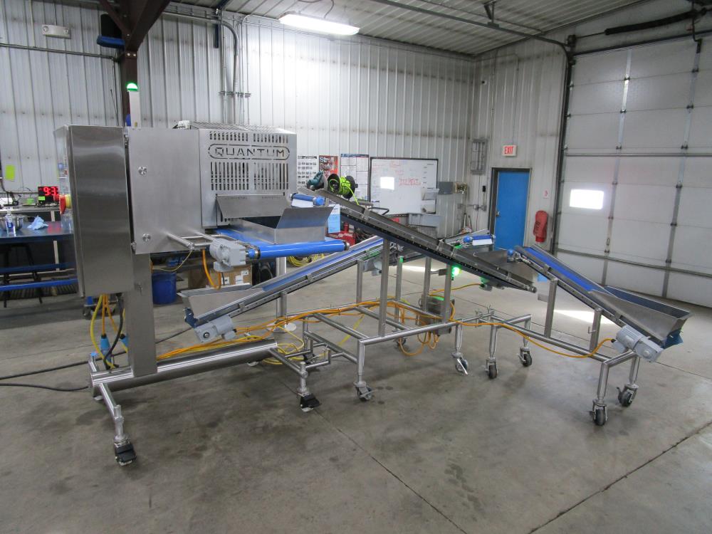 Quantum waterfall topping applicator with recirculation conveyors. Topping applicator Model TC5, SN TC5160002. Waterfall style applicator with 8 rakes. Each rake finger has ½ inch wide blades with 1 inch spacing. Rakes are offset. The total rake width is 12 inches wide. The product conveyor is 48 inches long x 20 inches wide x 48 inches tall. Hopper capacity is approximately 40 pounds. The discharge chute is 42 inches tall. Adjustable rake height and adjustable flinger height. Includes operated strong arm stand with NEW Allen Bradley PanelView Plus hmi. SS control panel on the machine which has an Allen Bradley MicroLogix 1400 plc and (5) Allen Bradley PowerFlex 525 vfd’s for the rake and conveyors. Photo eye for sensing incoming products. SS frame with locking casters. Electrical requirements, 1 phase, 220-240-volt, 60 hz. Overall dimensions of topping applicator 60 inches long x 55 inches wide x 80 inches tall, 1053 lbs.