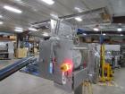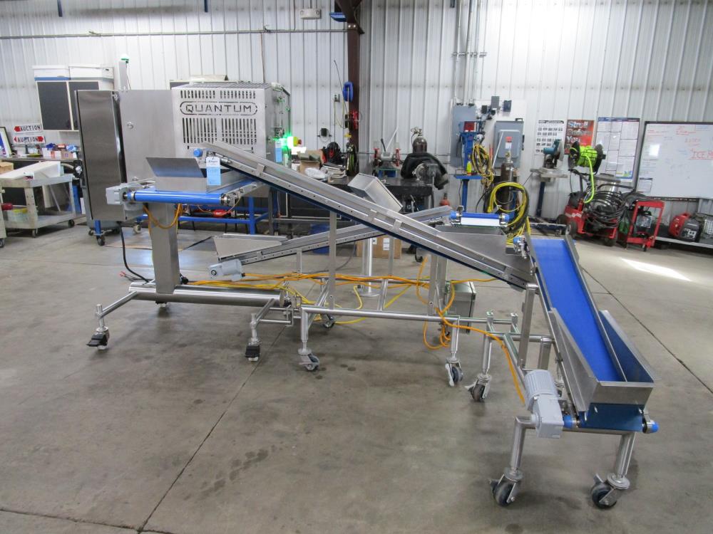 Included new product infeed conveyor. Model TF5, SN TF5160001. Incline conveyor with hopper, 48 inches long x 8.5 inches wide x 32 inch tall infeed x 40 inch tall discharge. SS frame, electric drive, on locking casters. Overall dimensions of new product conveyor 60 inches long x 20 inches wide x 42 inches tall, 141 lbs.