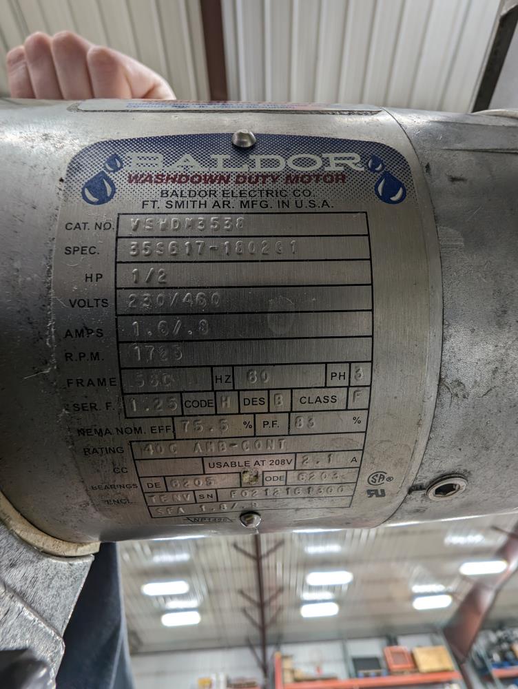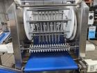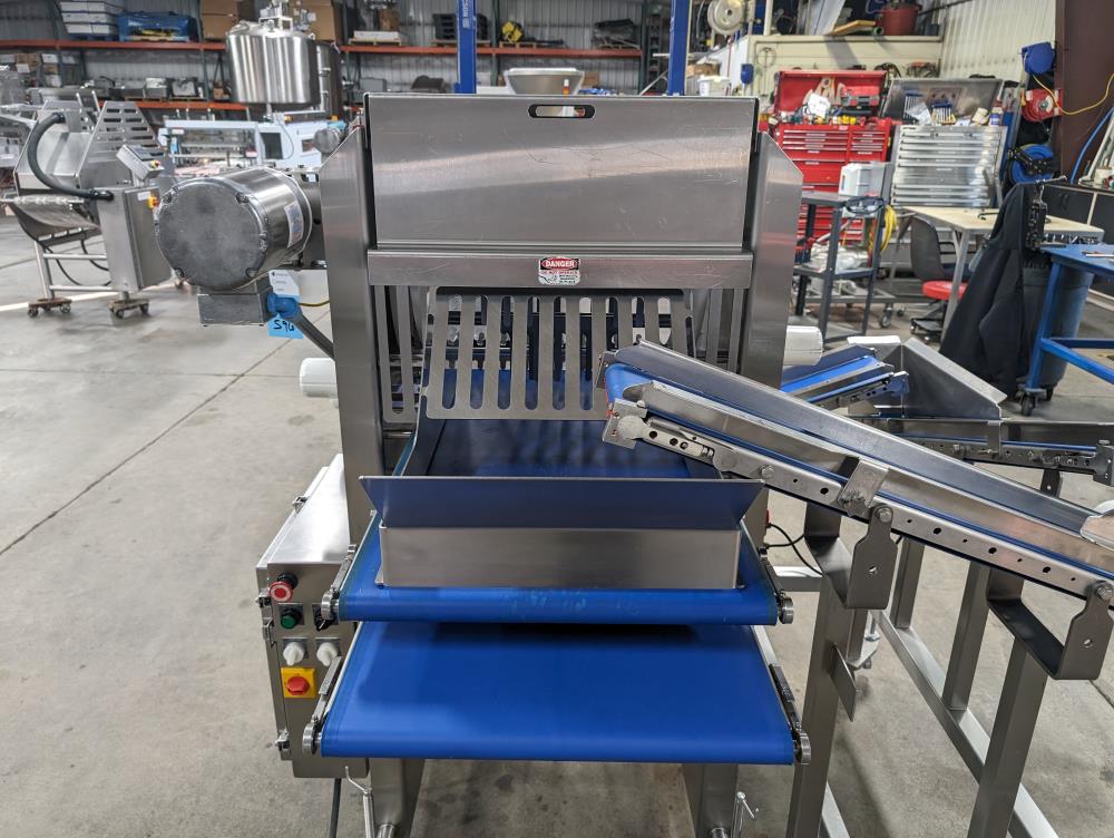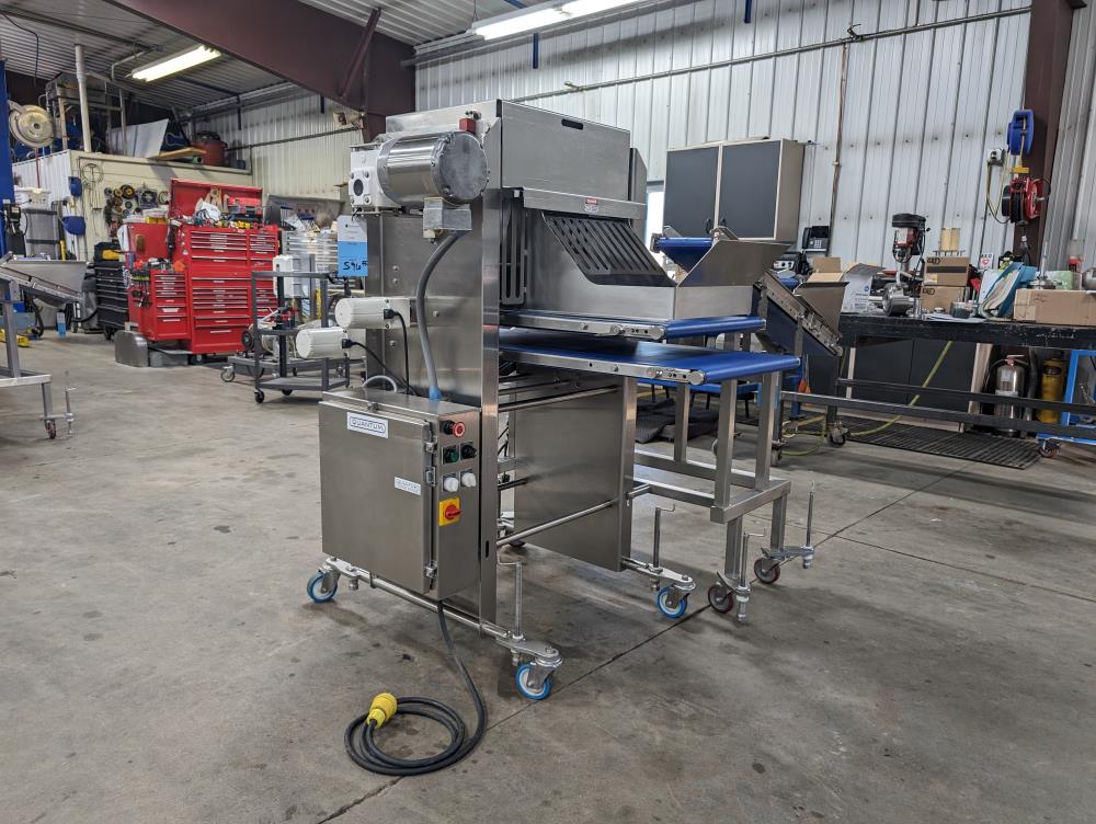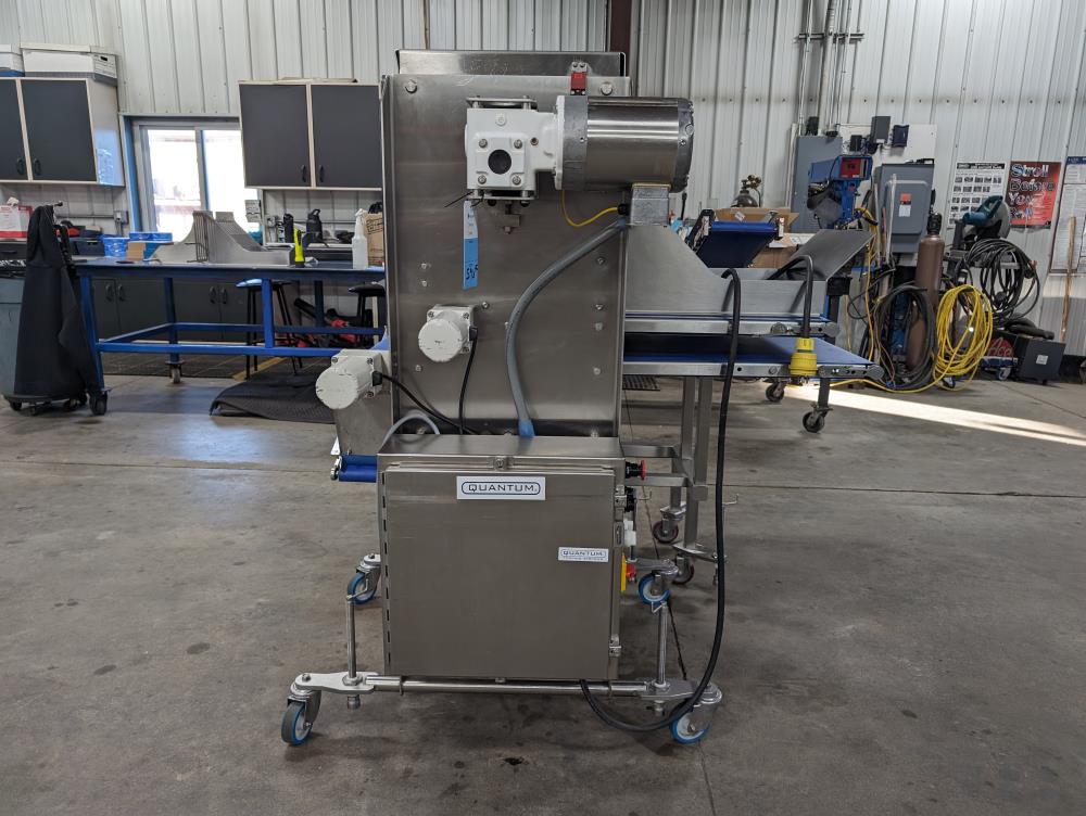 Quantum conveyorized topping applicator. Model TC3-18, SN TC300540301. Year 4/28/2003. Topping conveyor 36 in. long x 20 in. wide x 40 in. tall. Clearance 16 in. wide with guarding. SS waterfall rake 11 in. wide, ½ in. wide fingers with 1 in. spacing in-between. Feeder rake 17.5 in. wide, ½ in. wide fingers and spacing. Bottom crust conveyor 48 in. long x 20 in. wide x 36 in. tall. Servo driven conveyors. SS control cabinet, Allen Bradley plc, (5) ac speed controls. Controls include start, stop, product speed, and portion control. SS frame, on casters, adjustable legs. Electrical requirements 220 volt, 1 phase, 60 hz. OAD 55 in. long x 47 in. wide x 63 in. tall, 596 lbs.
