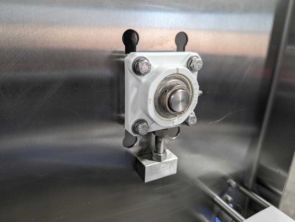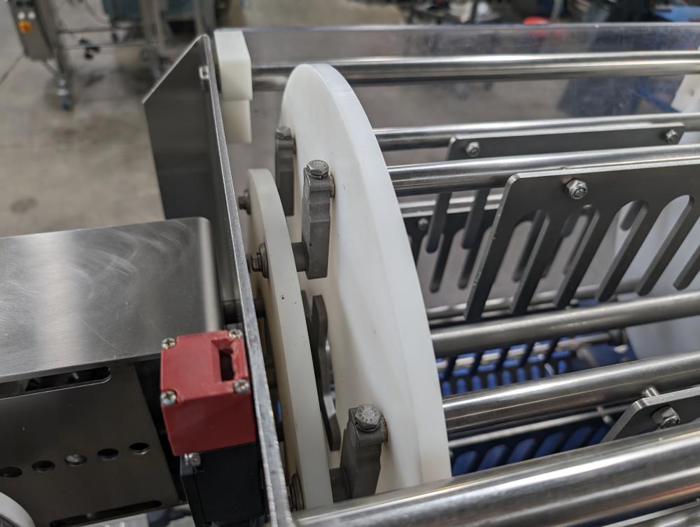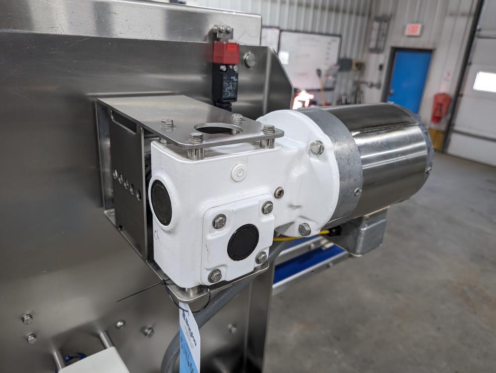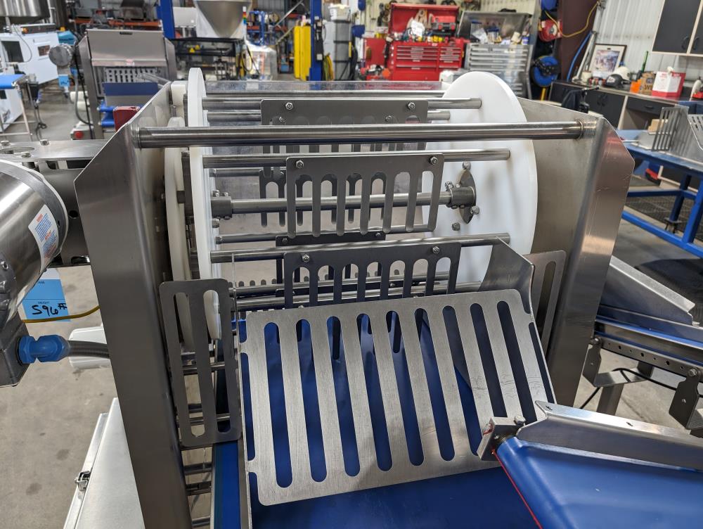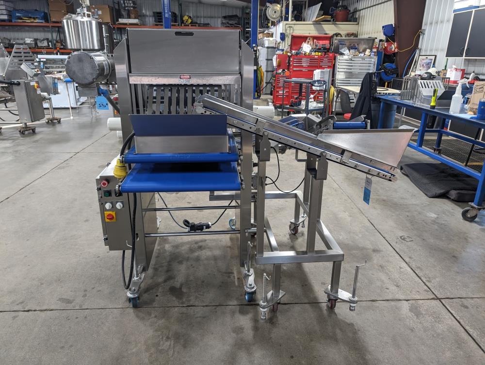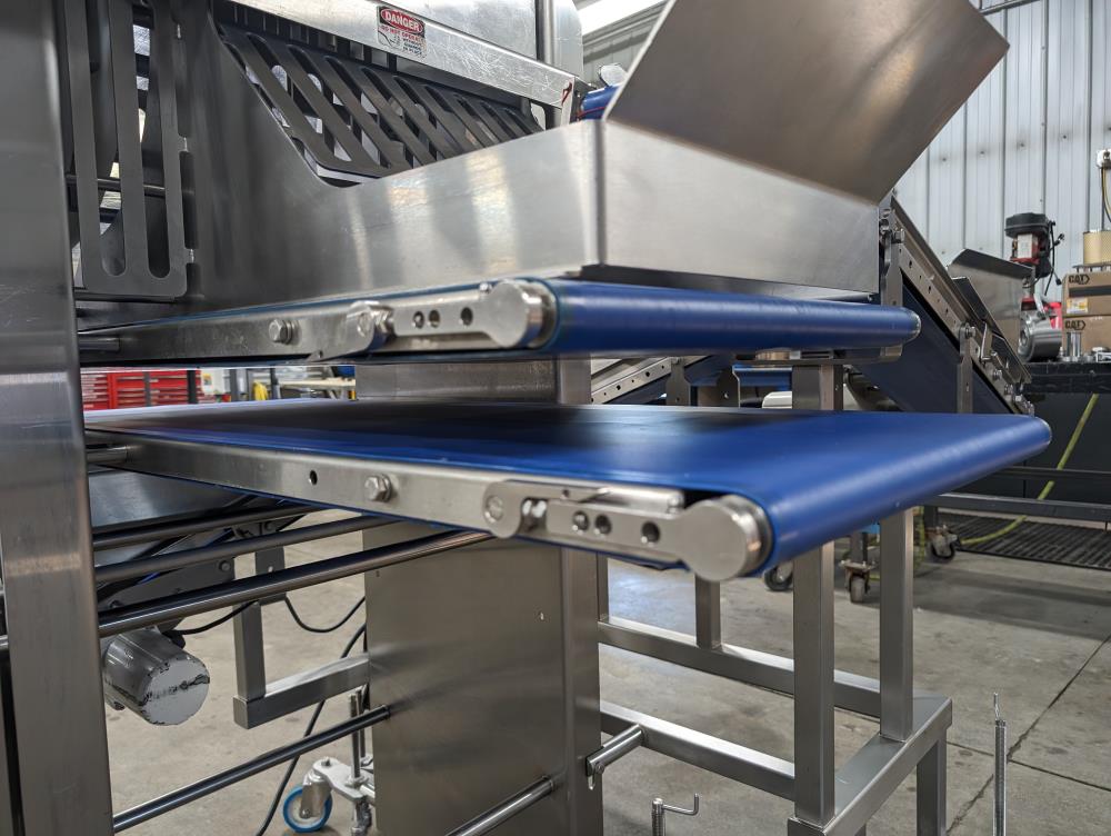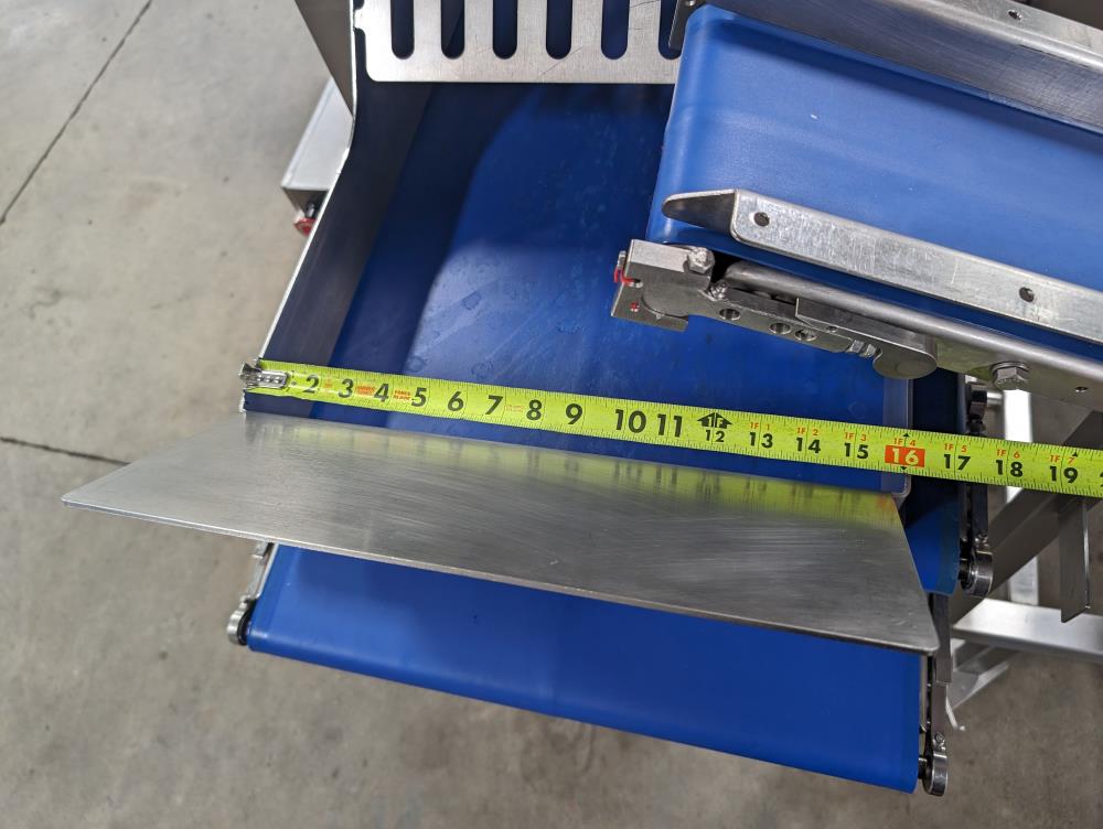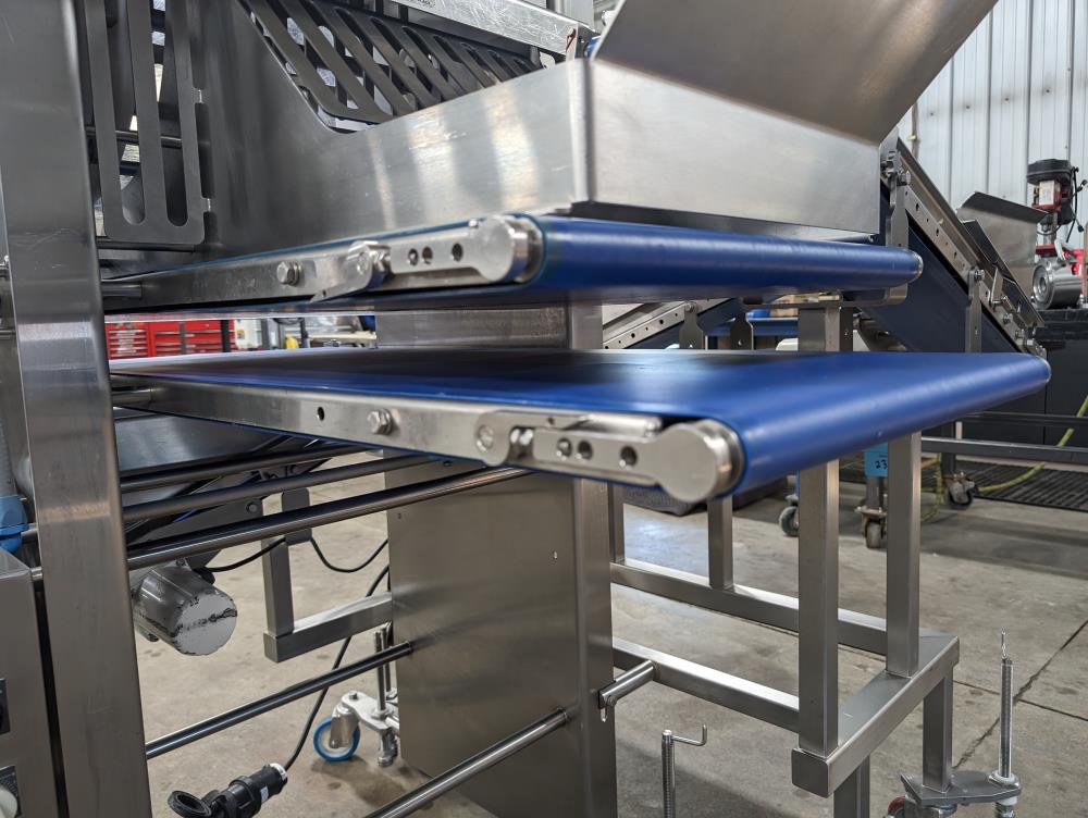 Quantum reclaim conveyor system. Model RC3, SN RC33650207. Year 09/11/2002. Conveyors 42 in. long x 6 in. wide. Electrical plugs into topping applicator. SS frame, on casters, adjustable legs. OAD 50 in. long x 54 in. wide x 51 in. tall, 236 lbs.