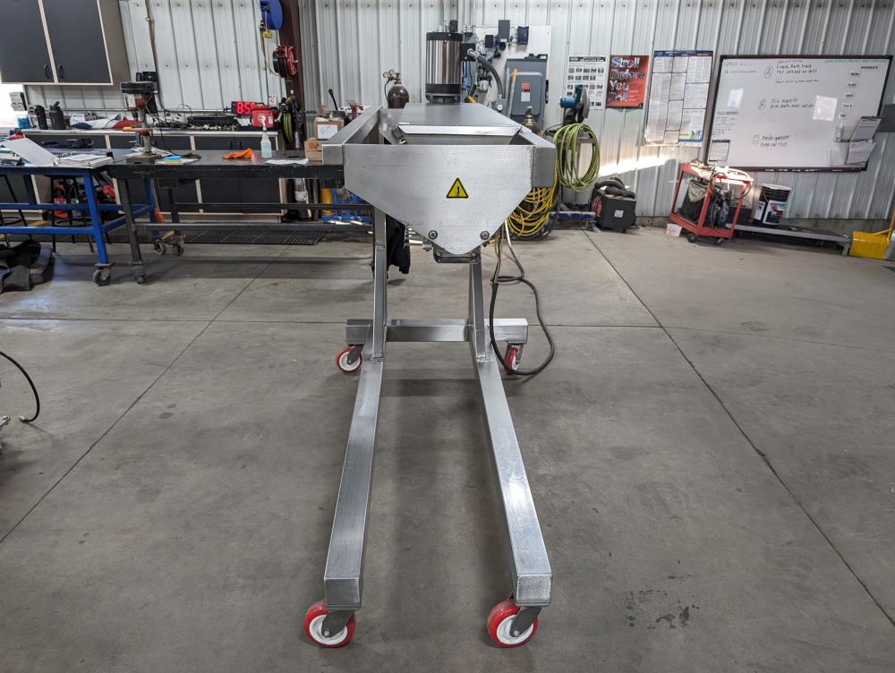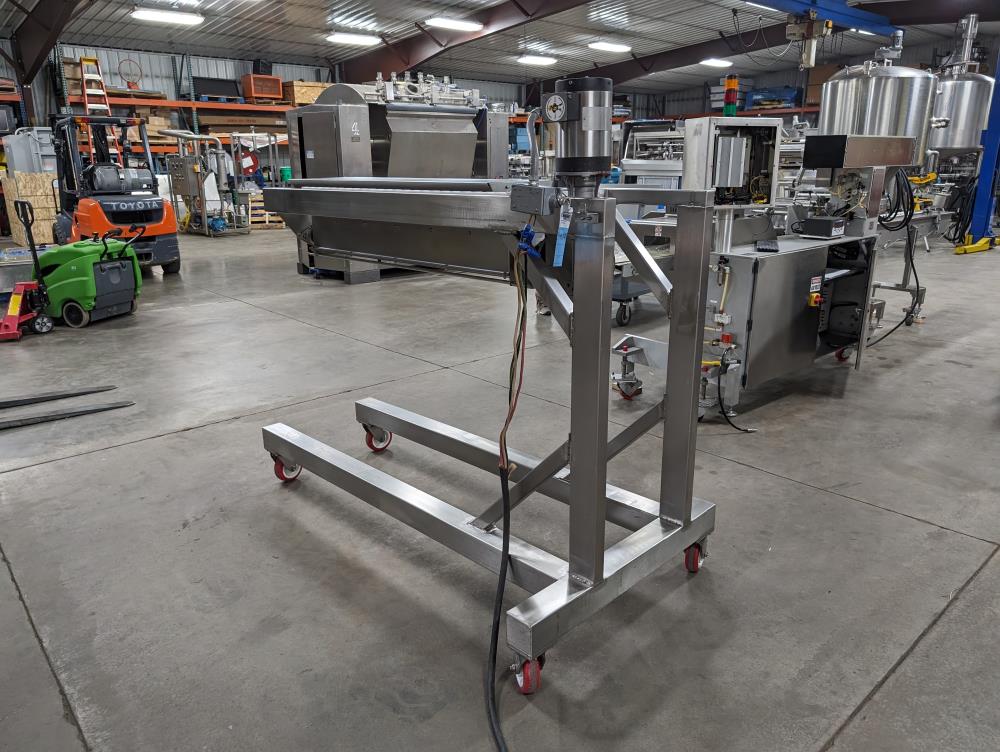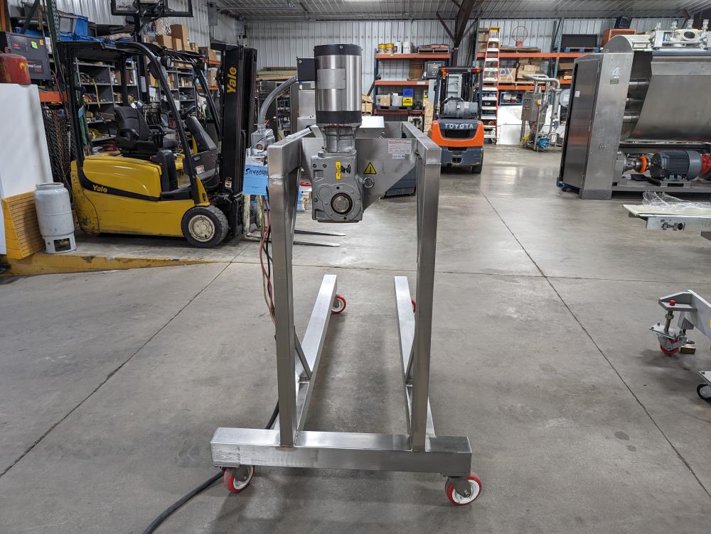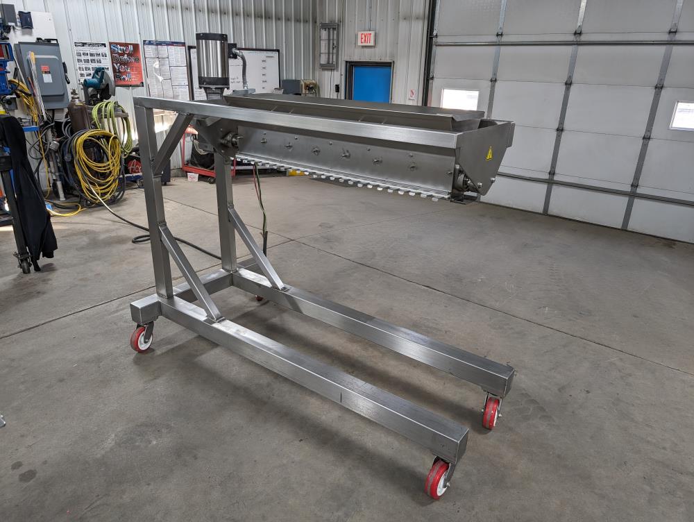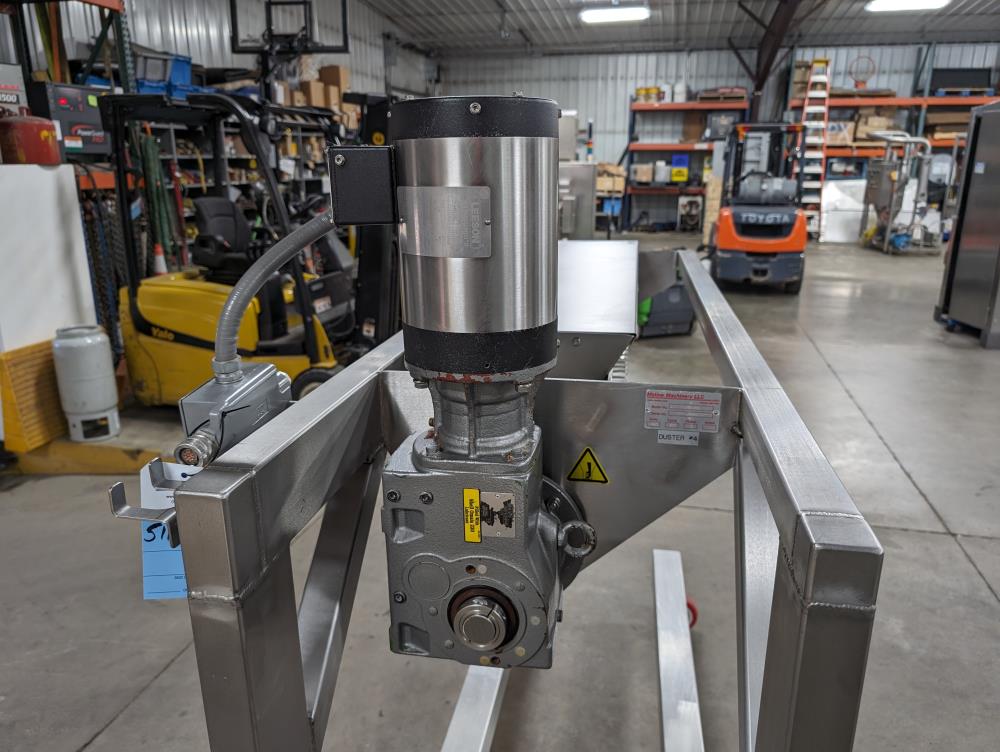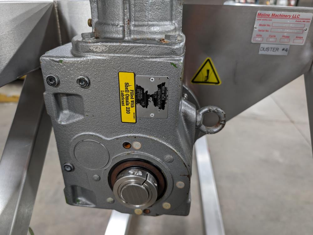 Moline portable flour duster. Model FDAF-48L, SN 07-J242209. All SS cosntruction. 48 in. long duster. SS hopper 48 in. long x 12 in. wide x 12 in. deep, with flow adjustments. 45 in. tall discharge. SS agitator with Leeson Washguard 1 hp drive. SS portable frame, on casters. Electrical requirements 480-volt, 3 phase, 60 hz.