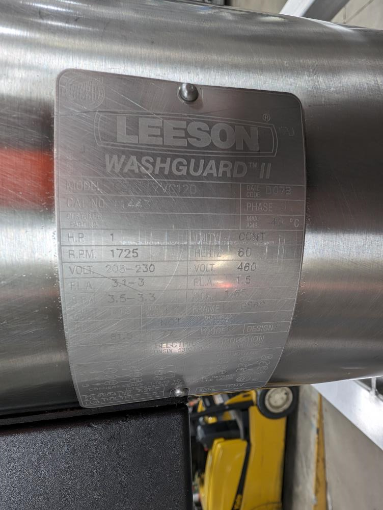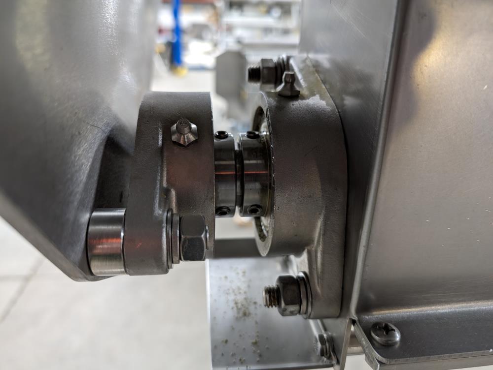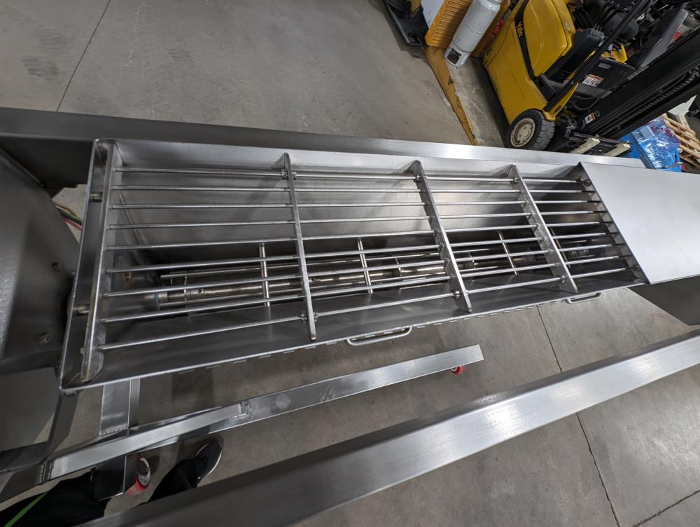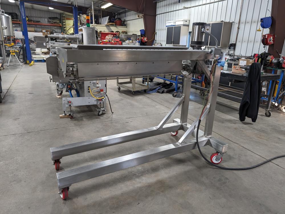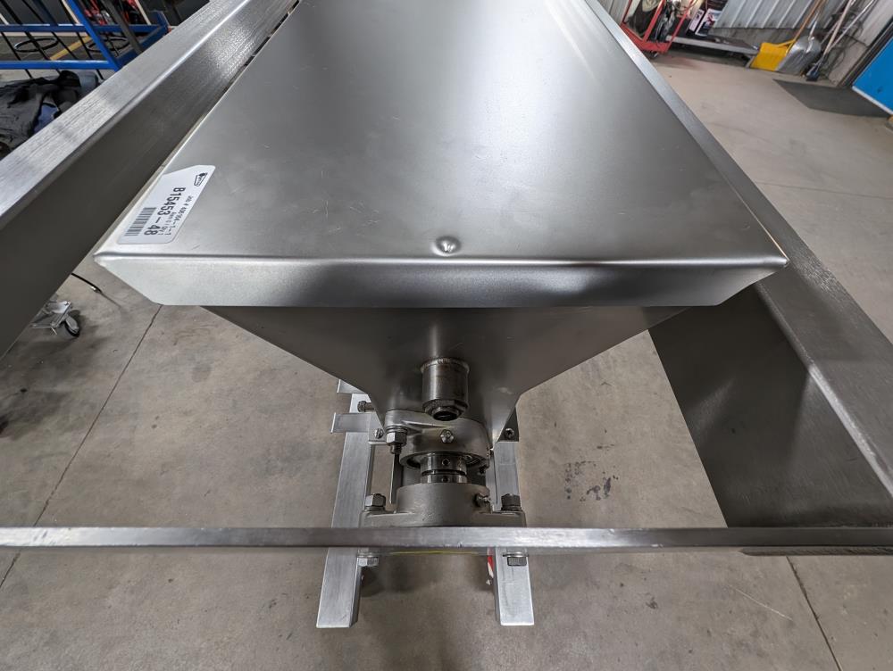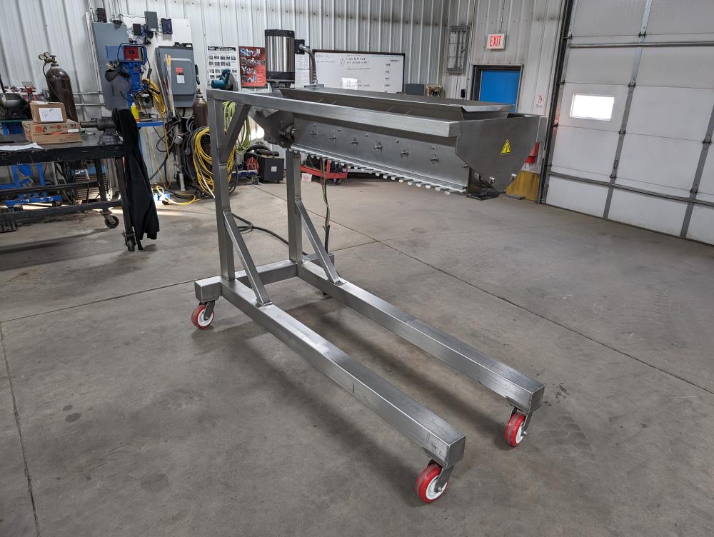 Moline portable flour duster. Model FDAF-48L, SN 07-J242209. All SS cosntruction. 48 in. long duster. SS hopper 48 in. long x 12 in. wide x 12 in. deep, with flow adjustments. 45 in. tall discharge. SS agitator with Leeson Washguard 1 hp drive. SS portable frame, on casters. Electrical requirements 480-volt, 3 phase, 60 hz.