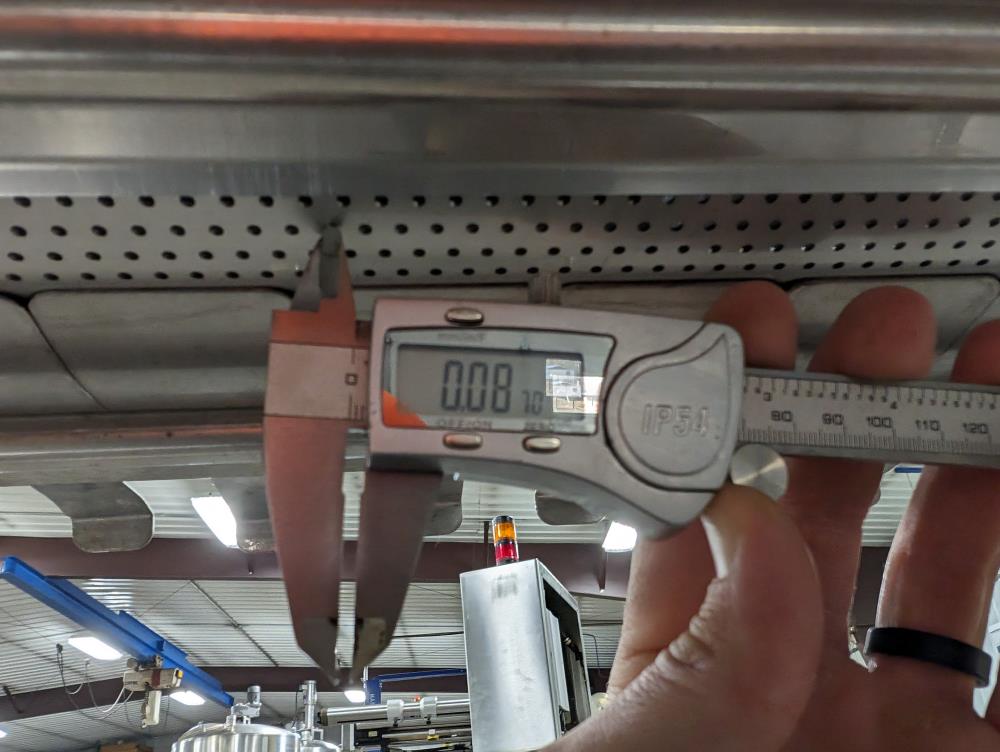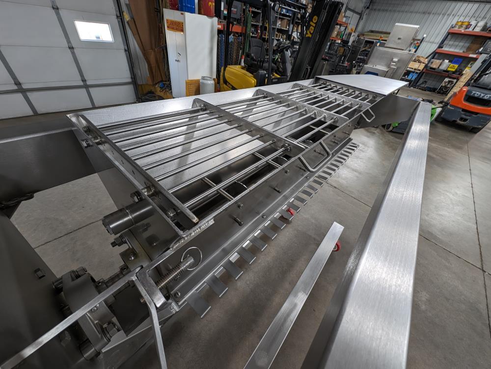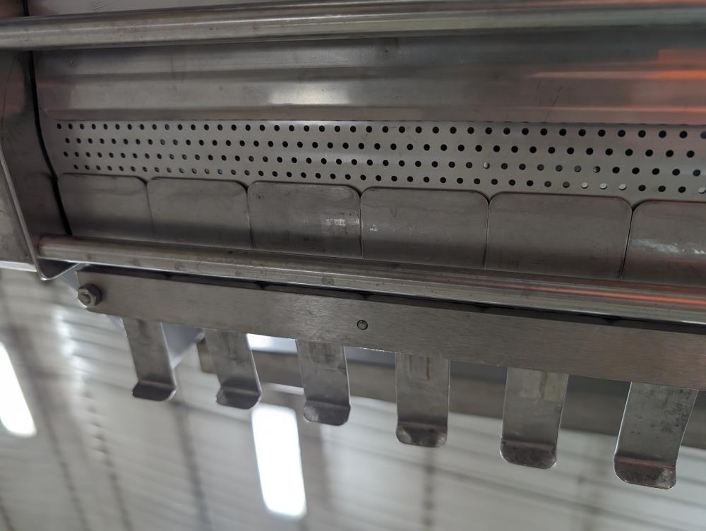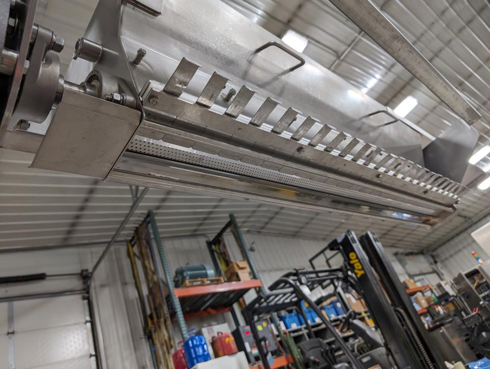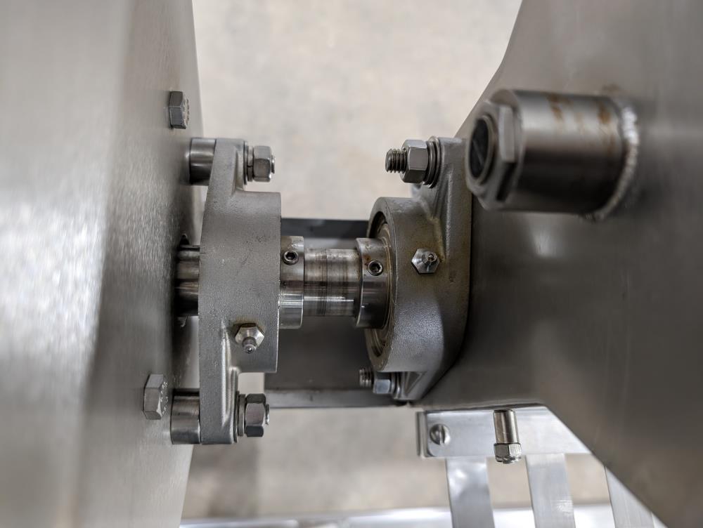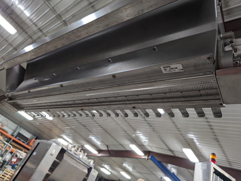 Moline portable flour duster. Model FDAF-48L, SN 07-J242209. All SS cosntruction. 48 in. long duster. SS hopper 48 in. long x 12 in. wide x 12 in. deep, with flow adjustments. 45 in. tall discharge. SS agitator with Leeson Washguard 1 hp drive. SS portable frame, on casters. Electrical requirements 480-volt, 3 phase, 60 hz.