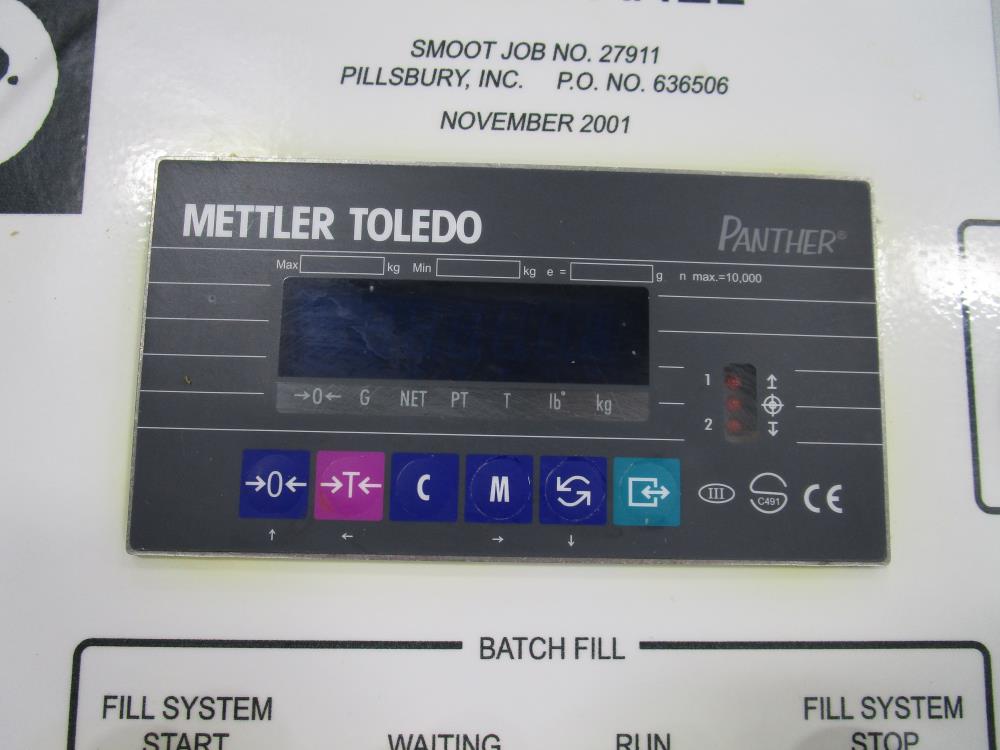 Smoot SS scaling hopper w/ Load Cells, Readout, and Control Panel.  Hopper - 37 in. dia. x 40 in. straight side x 24 in. cone bottom. 10 in. dia. discharge, 6 in. dia. inlets. 3 in. dia. diverting pipe. Pneumatic butterfly valve, Rice Lake load cells w/ Mettler Toldeo readout. Includes Smoot control panel.  Overall Dimensions: Hopper - 96 in. long x 45 in. wide x 46 in. tall (on pallet)