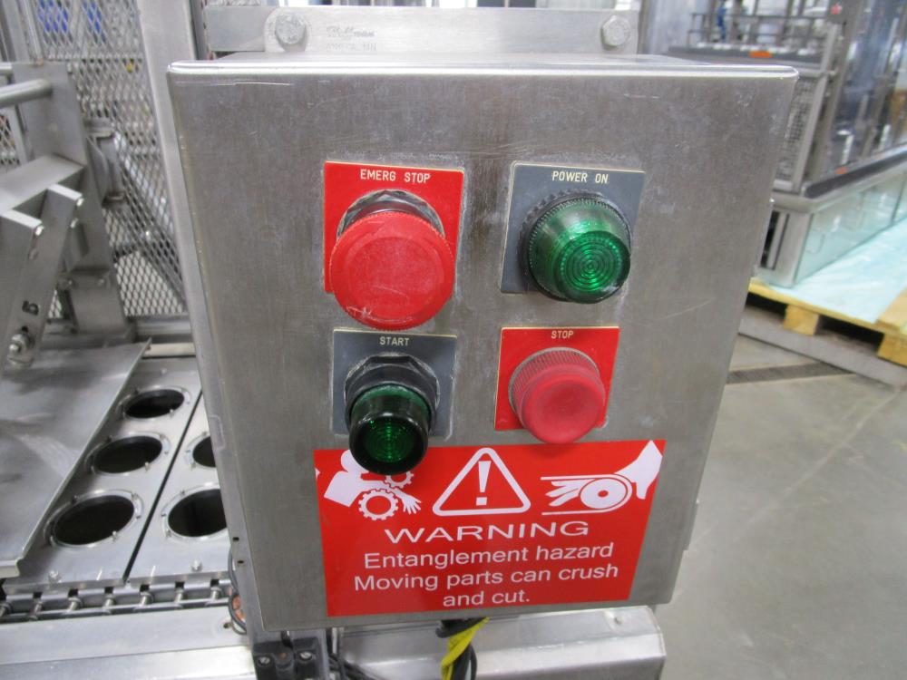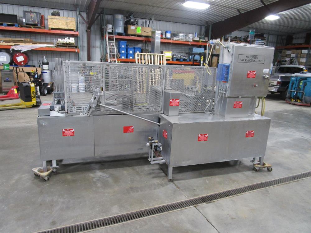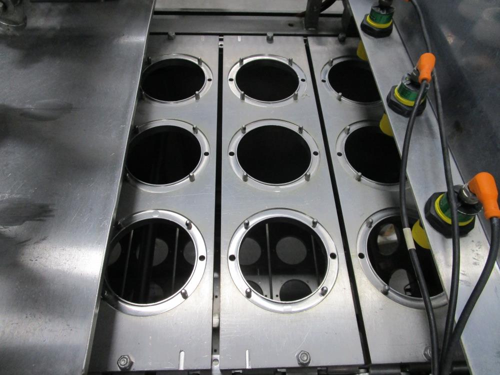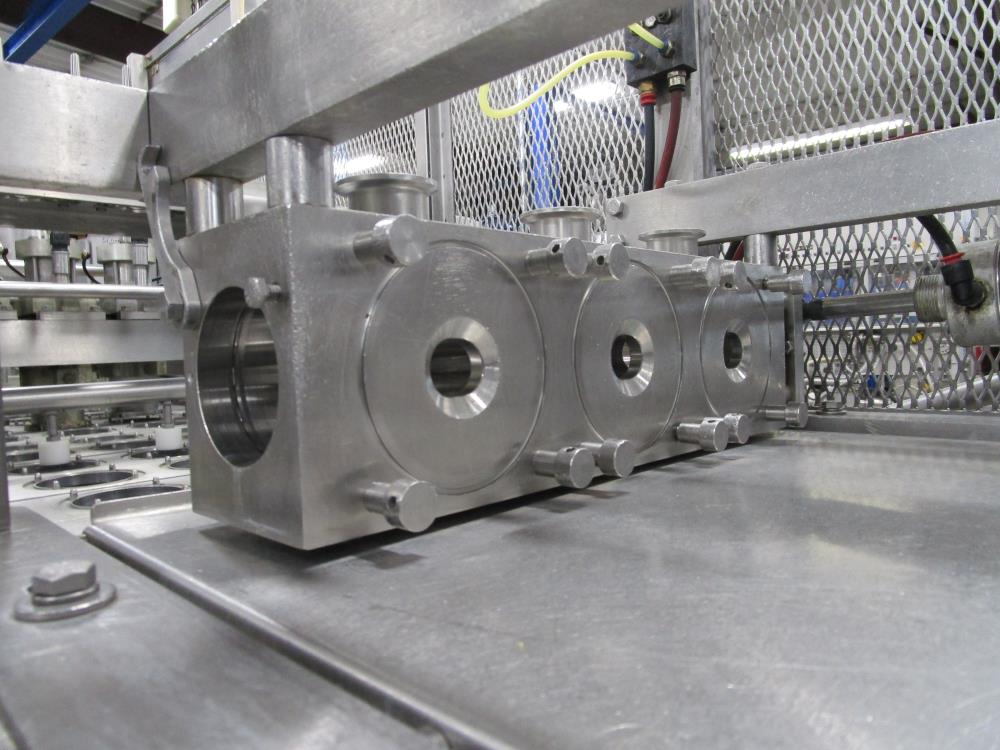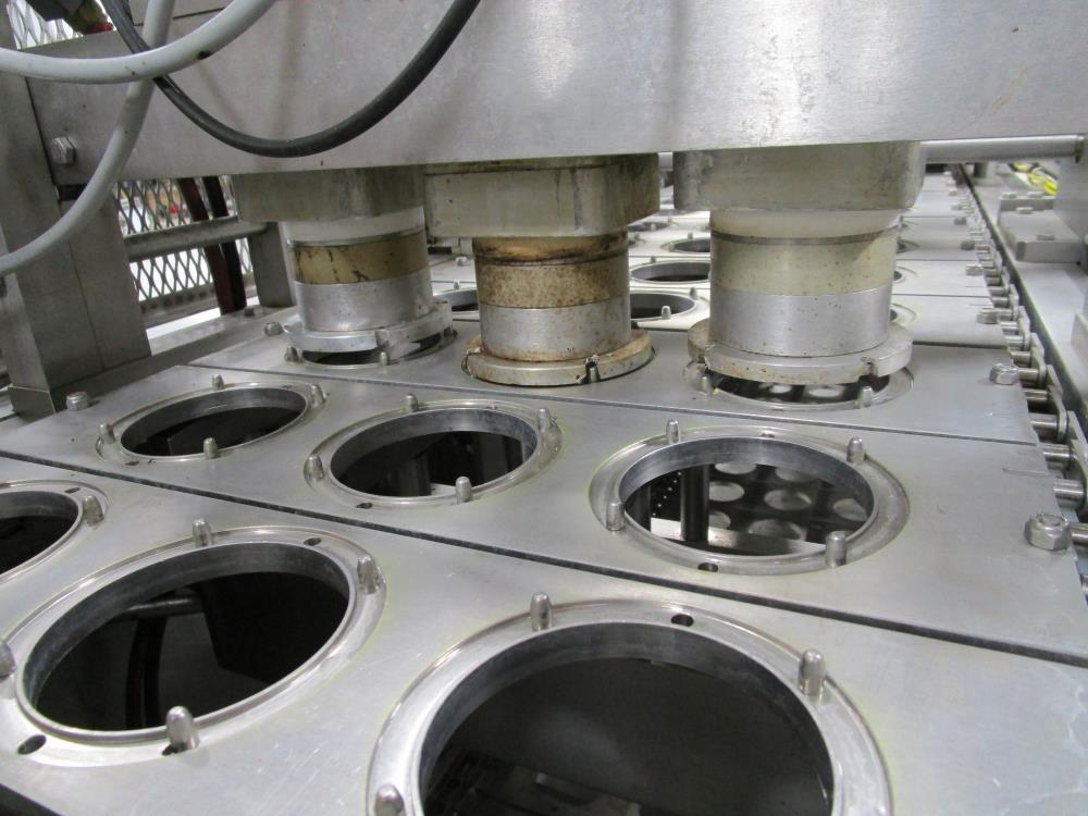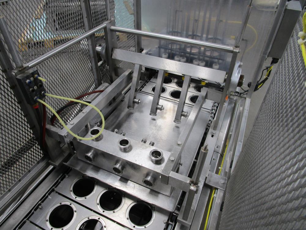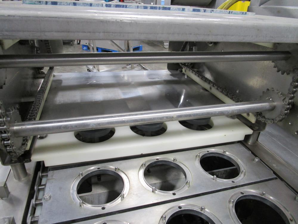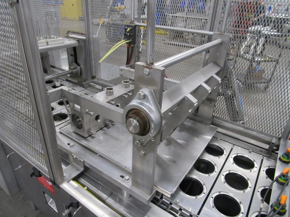 Modern Packaging Inc. 3 Lane Inline Cup Filler (Incomplete). Model: SL 1x3, SN: MP-585, 3 1/2 in. cup dia. Missing fill station, hopper, pistons, fittings and depositing cylinder. Allen Bradley Panelview 550 touchscreen controls, SS construction, 220V, 3 phase, 60 Hz. 12 cfm @ 100 PSI. Machine Footprint: 140 in. long x 59 in. wide x 86 in. tall.