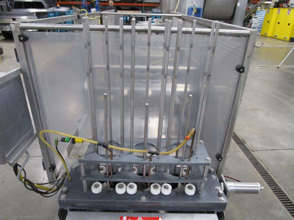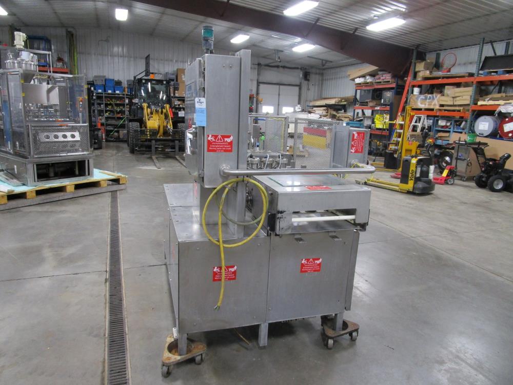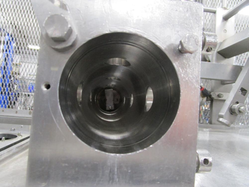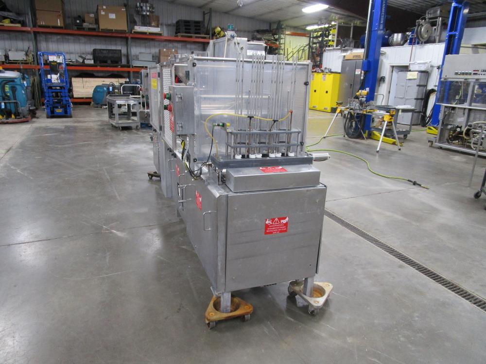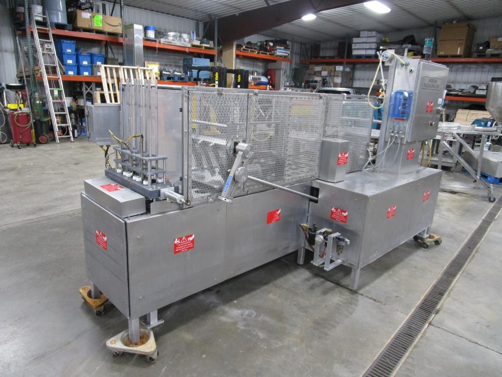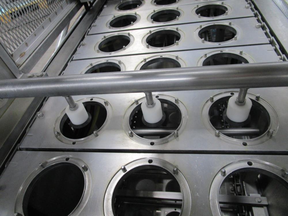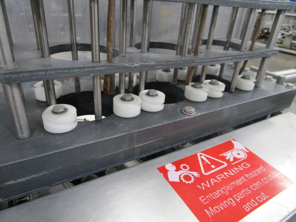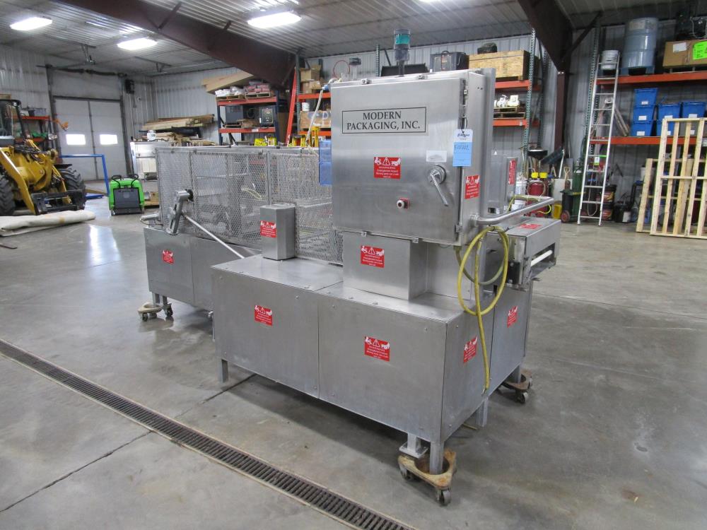 Modern Packaging Inc. 3 Lane Inline Cup Filler (Incomplete). Model: SL 1x3, SN: MP-585, 3 1/2 in. cup dia. Missing fill station, hopper, pistons, fittings and depositing cylinder. Allen Bradley Panelview 550 touchscreen controls, SS construction, 220V, 3 phase, 60 Hz. 12 cfm @ 100 PSI. Machine Footprint: 140 in. long x 59 in. wide x 86 in. tall.