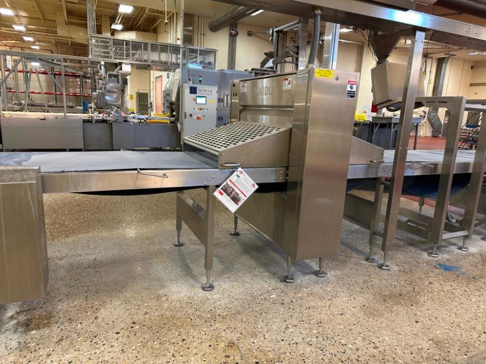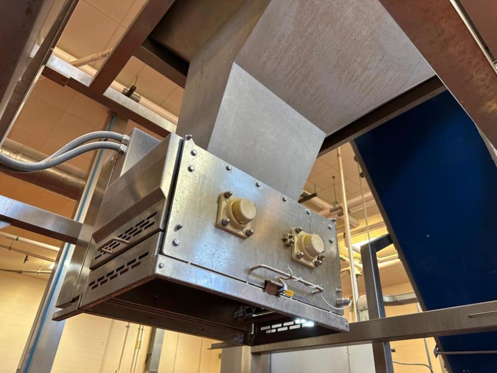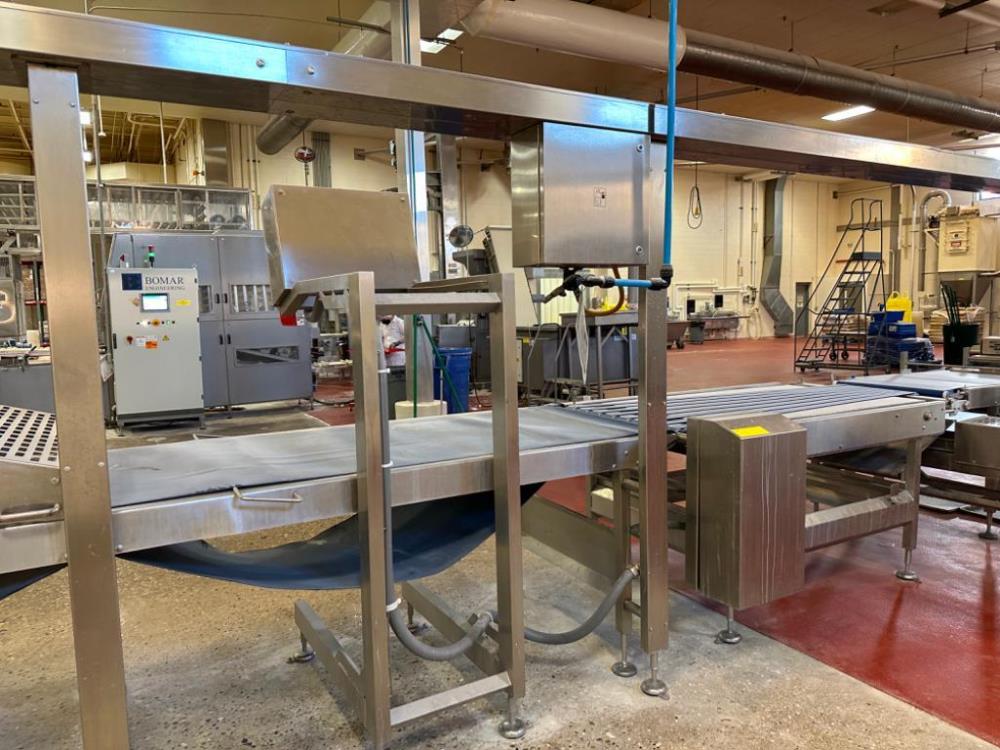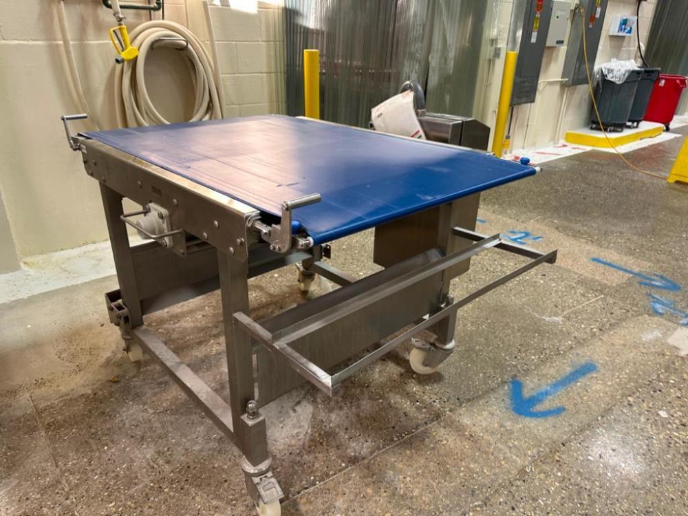 Cross scrap conveyor after slitter, 120 in. long x 9 in. wide with rotary guillotine