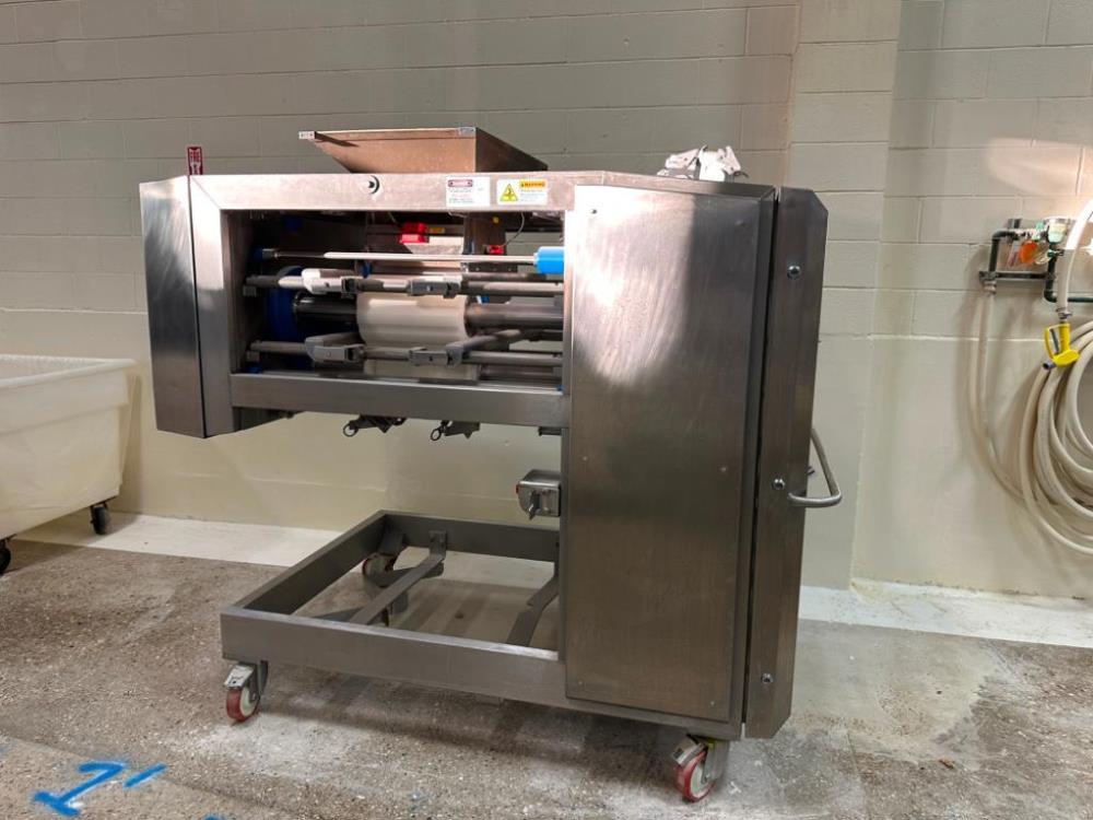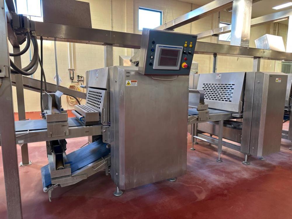 2013 Rondo sheeting line, Laminazione Astec D. Rondo makeup line consisting of a rotary chunker, 4-roll extruder, multi-roller, cross roller, sheeting stand, slitter, scrap return system, spreader belt, guillotine, reciprocator pan loader, conveyors, dusters, and control panel