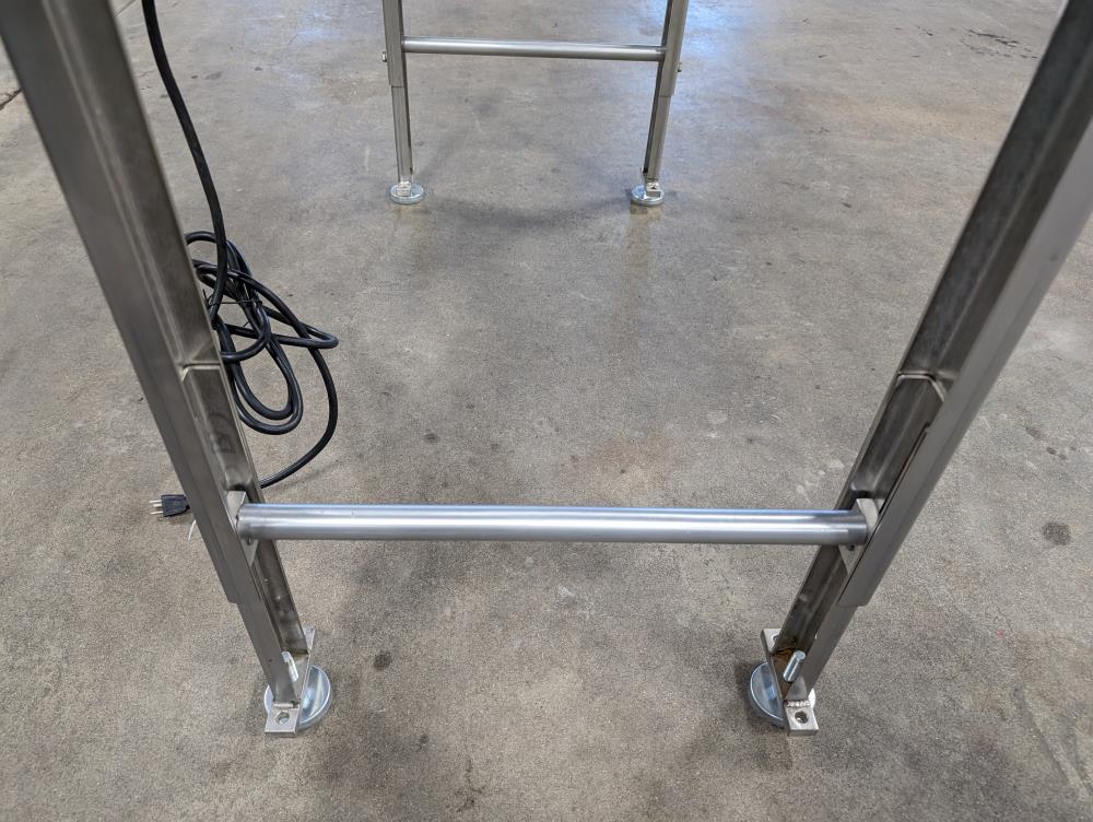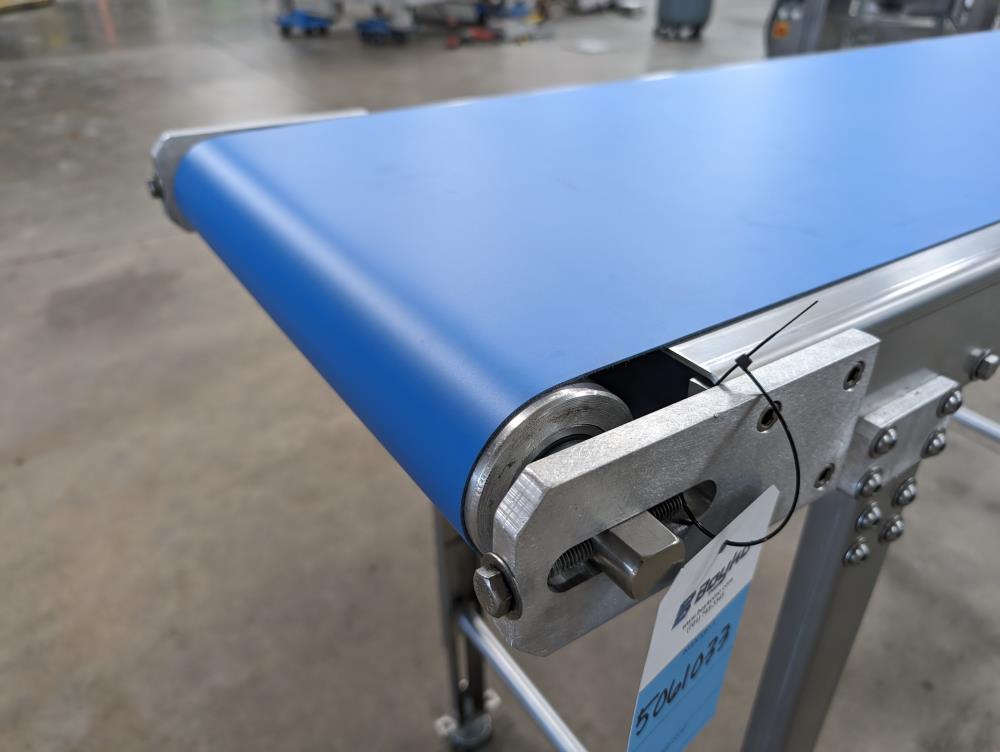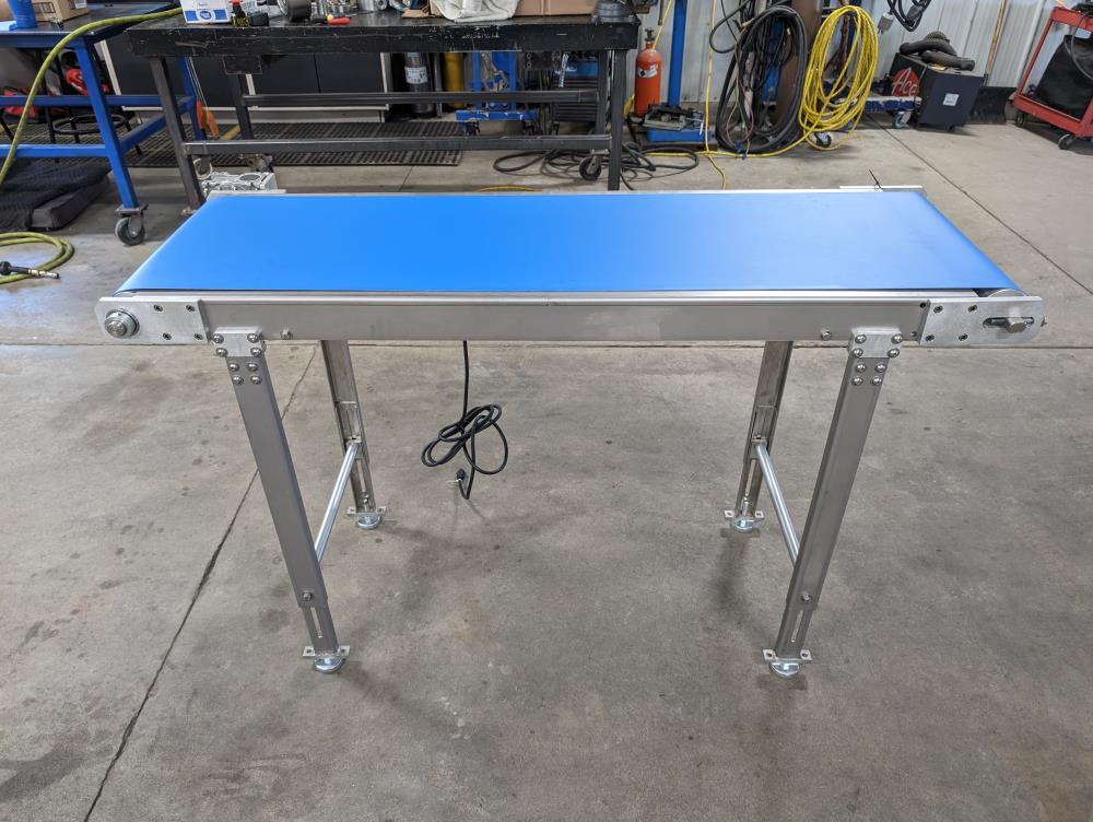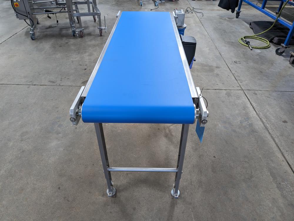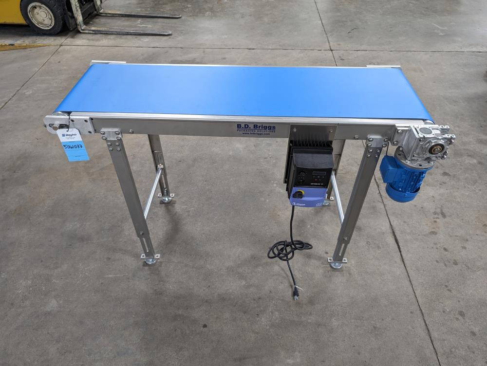 Custom belt conveyor built by BD Briggs. Blue sanitary belt 57 in. long x 16 in. wide x 36 in. tall (+/- 4 inches). Drive motor 0.25 kw, 230/460 volt with Invertek optidrive E3 vfd. Input 115 volt 1 phase, output 220 volt 3 phase. SS frame, adjustable height legs.