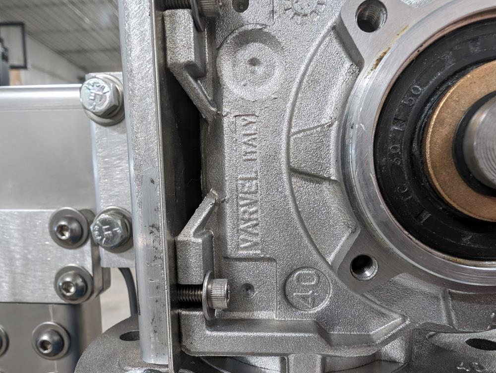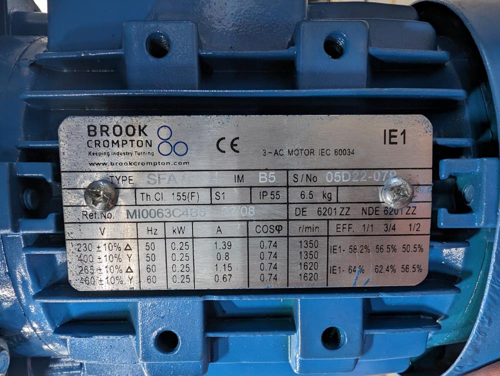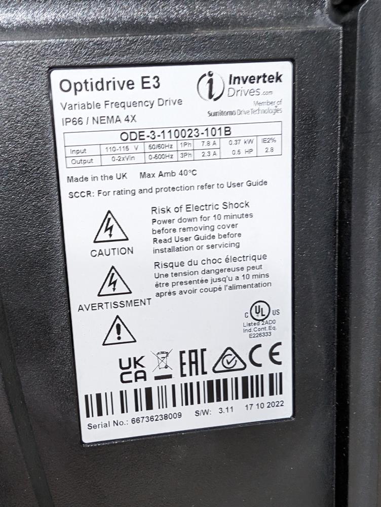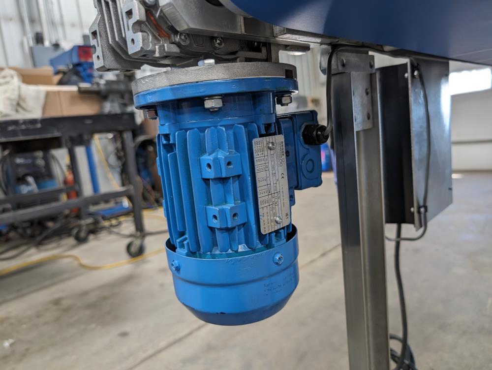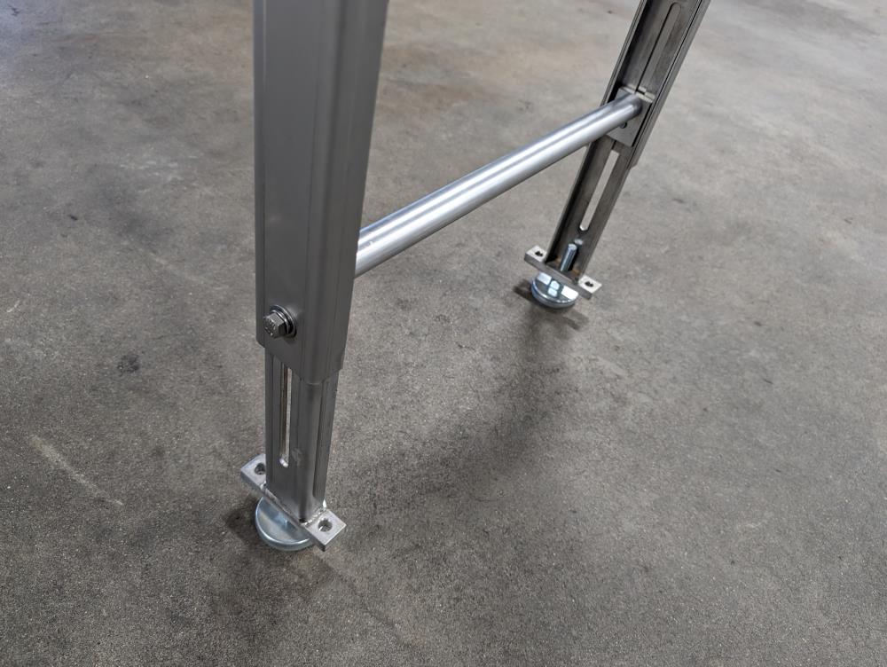 Custom belt conveyor built by BD Briggs. Blue sanitary belt 57 in. long x 16 in. wide x 36 in. tall (+/- 4 inches). Drive motor 0.25 kw, 230/460 volt with Invertek optidrive E3 vfd. Input 115 volt 1 phase, output 220 volt 3 phase. SS frame, adjustable height legs.