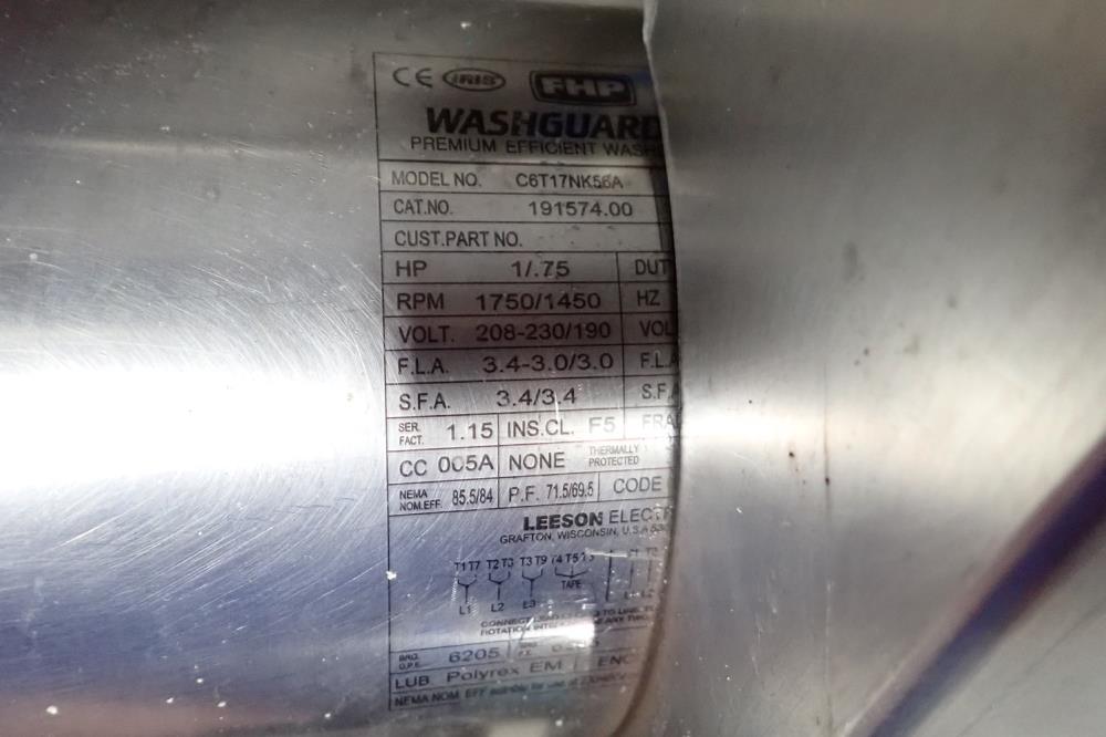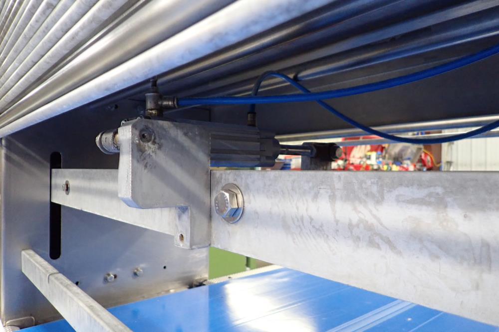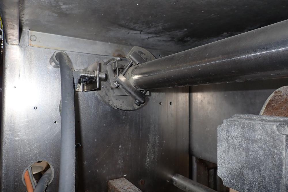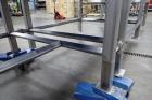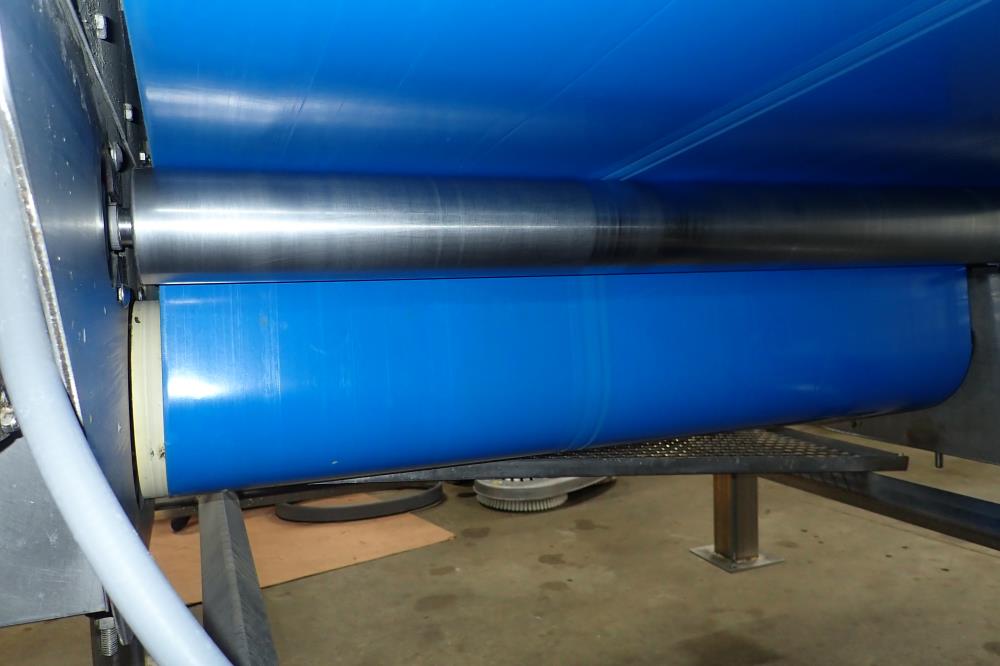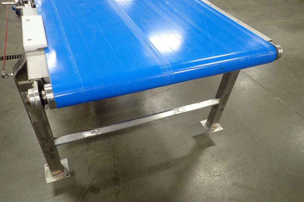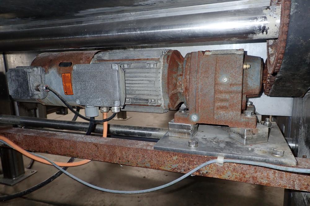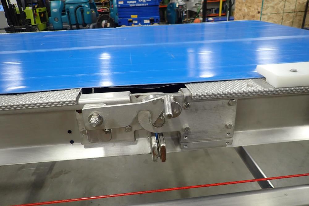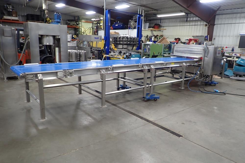 Rademaker makeup conveyor with guillotine. Blue sanitary belt 28.5 ft. long x 42 in. wide x 37 in. tall. Allen Bradley panelview plus control. Stationary guillotine, with pneumatic traveling blade, missing blade. 21.5 ft. of belt before the guillotine and 7 ft. of belt after the guillotine. SS wash guard motor for belt conveyor. SEW Eurodrive motor for guillotine. Safety on guillotine doors, and cable safety throughout the conveyor. SS tubular frame.