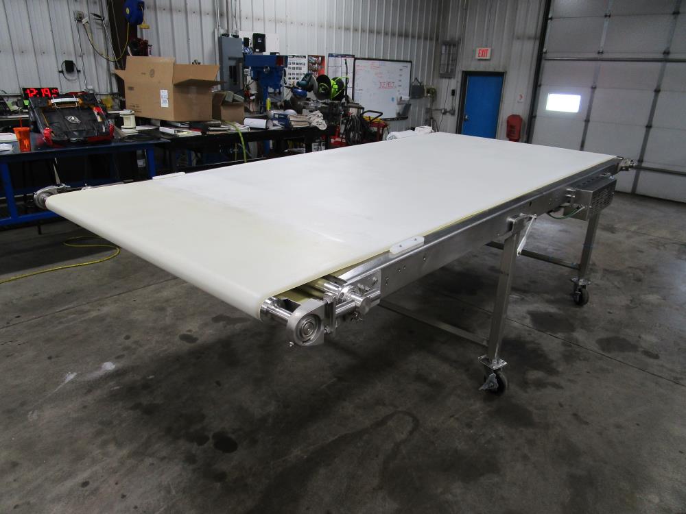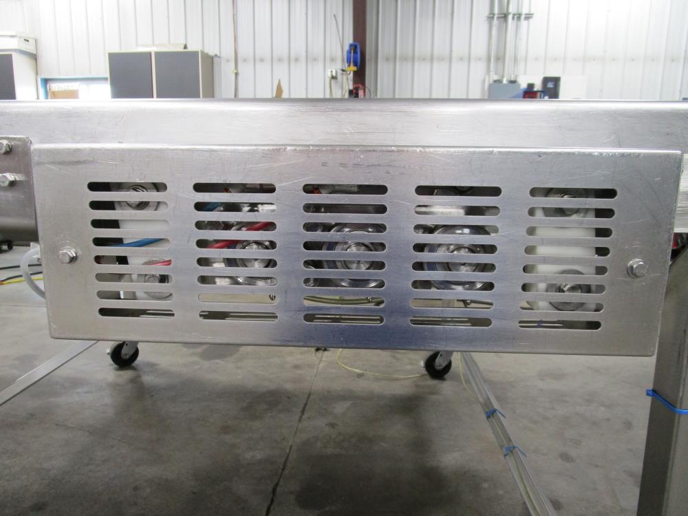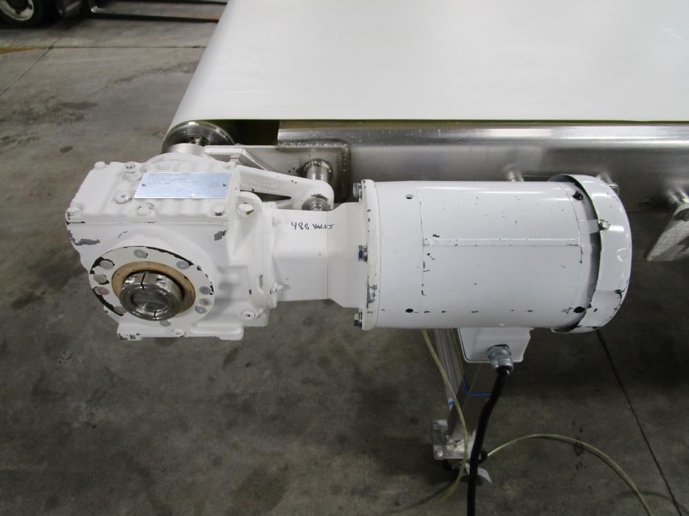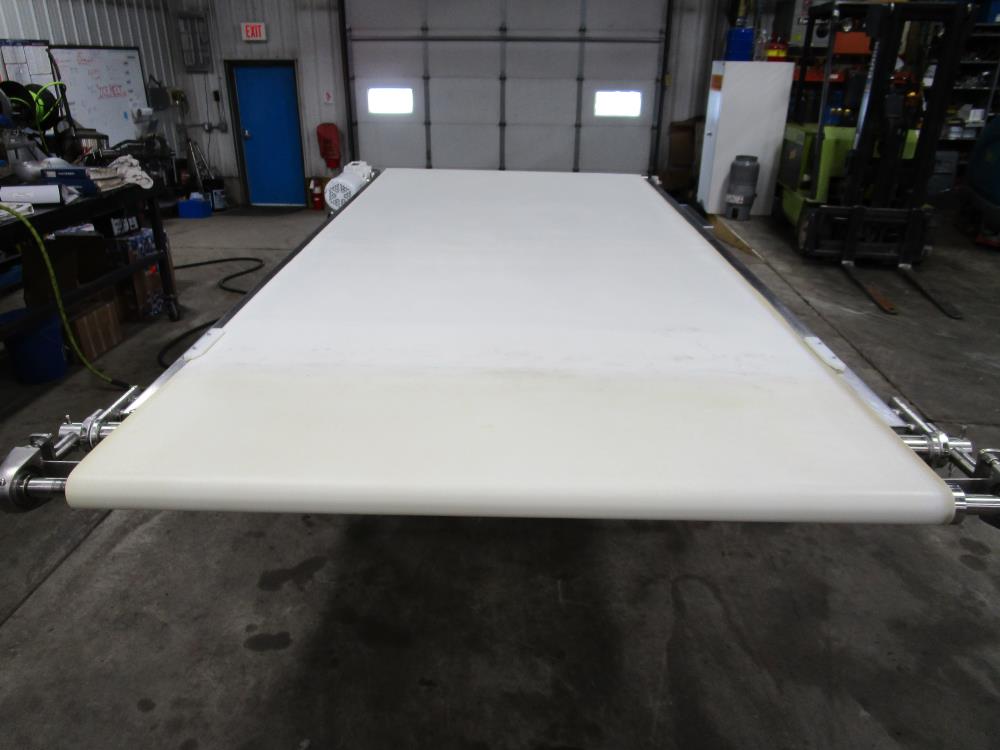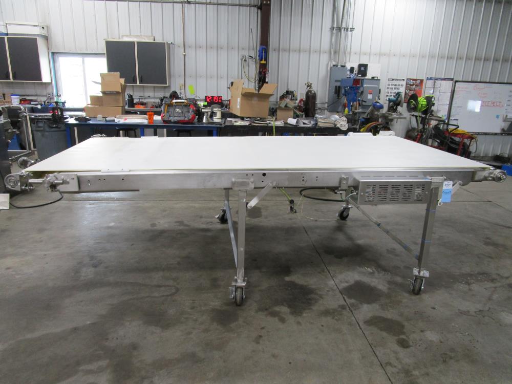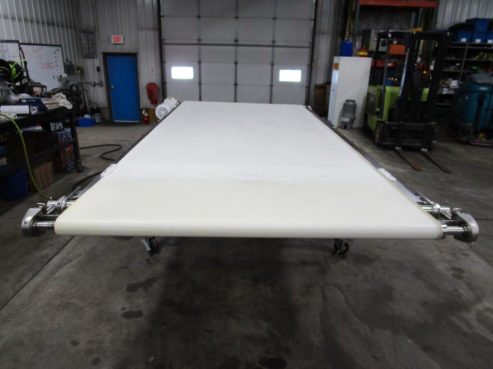 Moline belt conveyor. White vinyl belt 135 in. long x 60 in. wide x 40 in. tall. Pneumatic belt tracking. Baldor washdown duty motor, 1 hp, 230/460 volt. SS bearings. SS tubular frame, on casters. Currently wired for 480-volt, 3 phase.