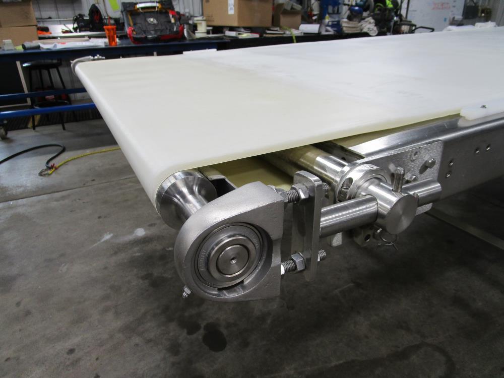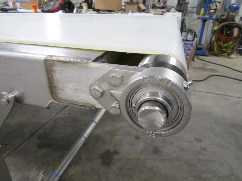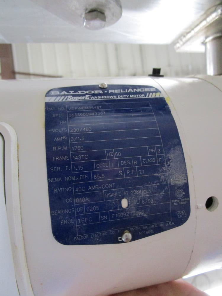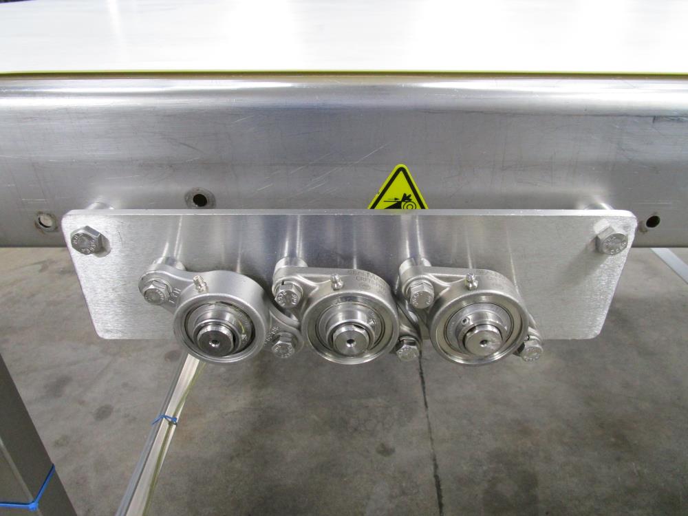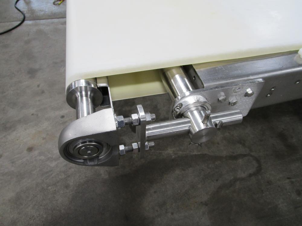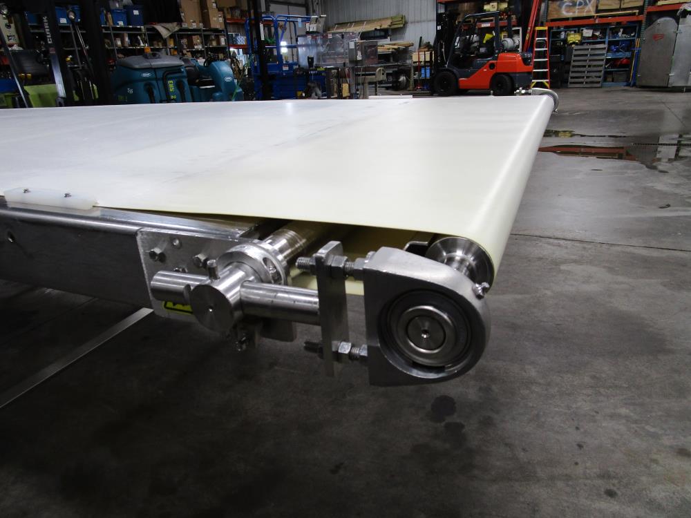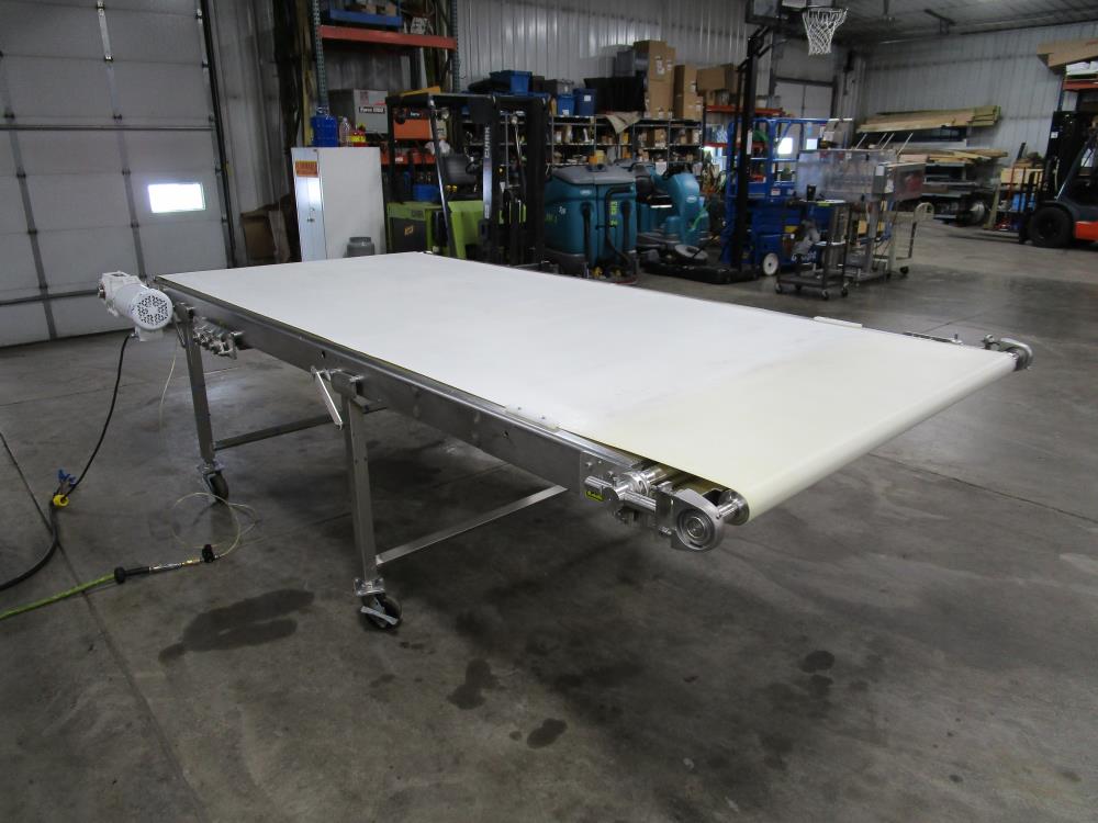 Moline belt conveyor. White vinyl belt 135 in. long x 60 in. wide x 40 in. tall. Pneumatic belt tracking. Baldor washdown duty motor, 1 hp, 230/460 volt. SS bearings. SS tubular frame, on casters. Currently wired for 480-volt, 3 phase.