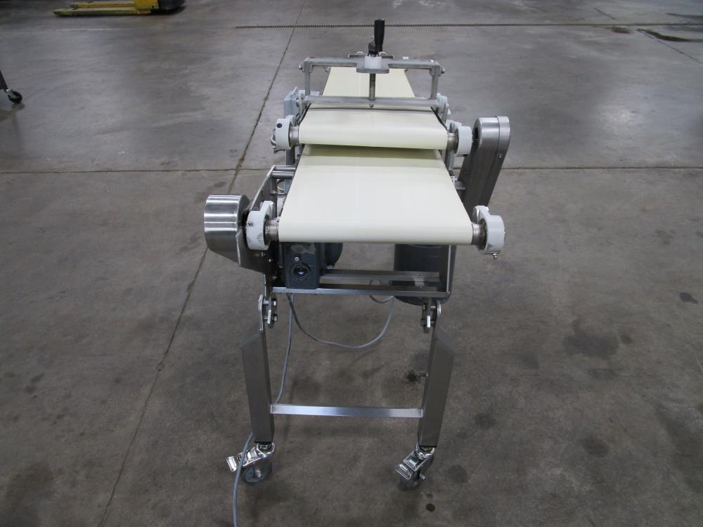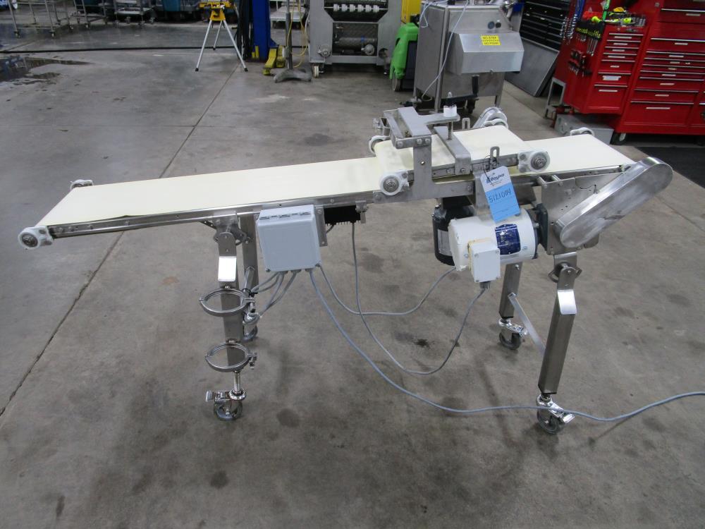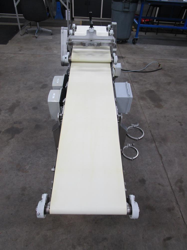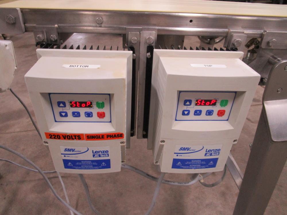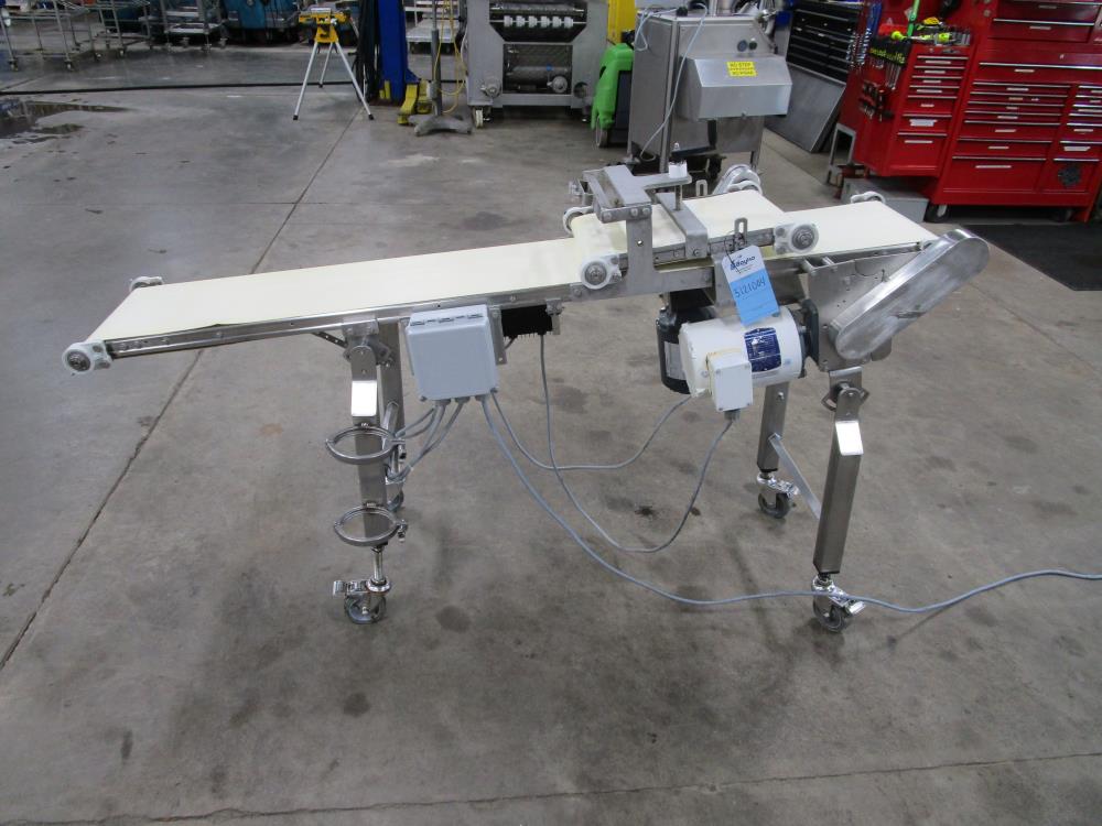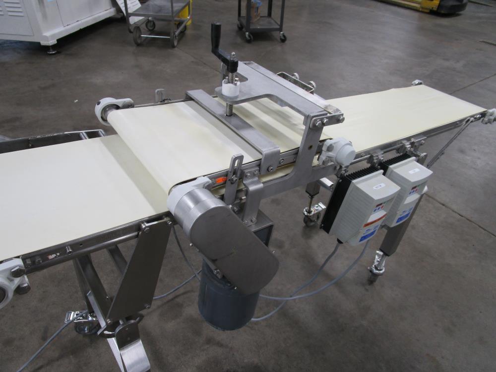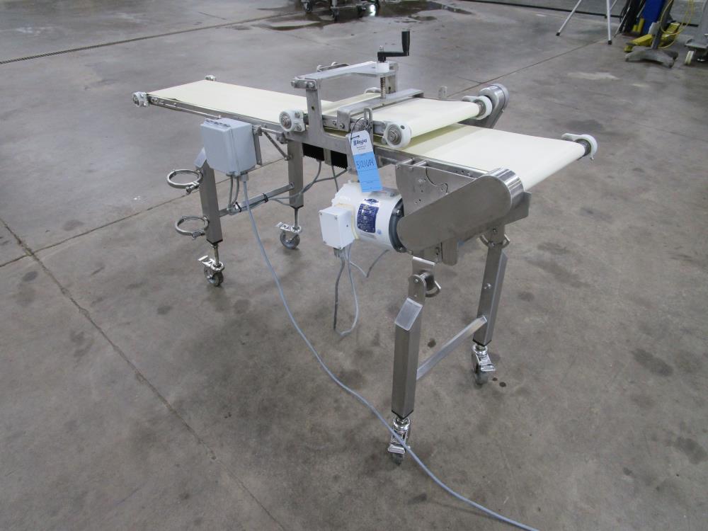 Dorner incline conveyor with flattener/moulder. White vinyl incline belt 72 in. long x 12 in. wide x 28 in. tall infeed x 37 in. tall discharge. Baldor ½ hp washdown motor for conveyor with AC Tech speed controller. Flattening conveyor 18 in. long x 12 in. wide, clearance from 0.25 inches to 2.5 inches tall, GE 0.25 hp washdown motor with AC Tech speed controller. SS frame, adjustable height legs, on locking casters. Electrical requirements 220-volt, 1 phase, 60 hz.