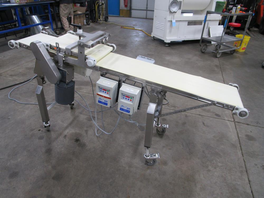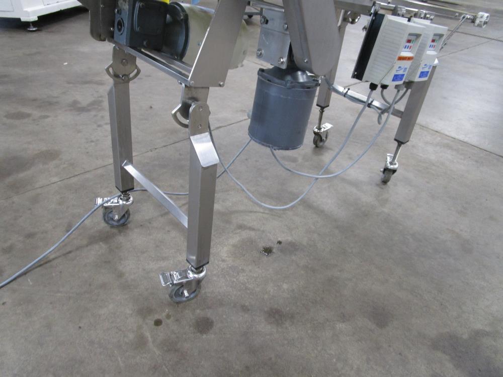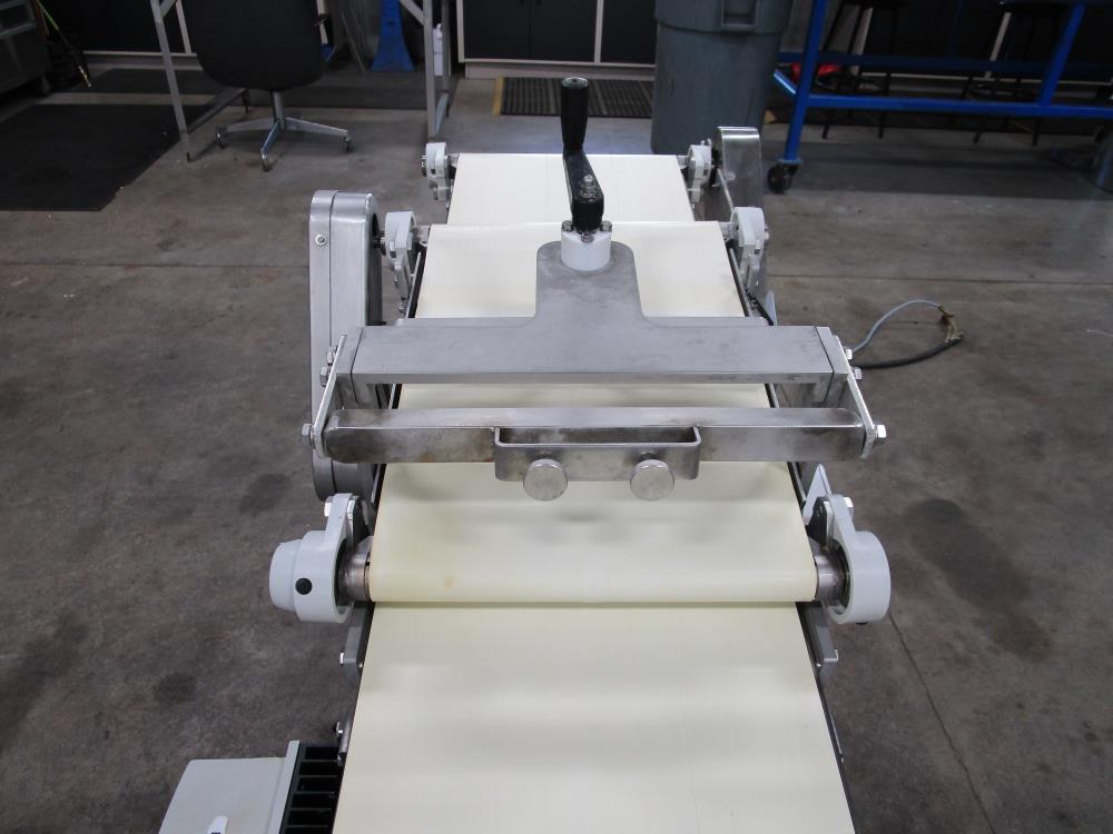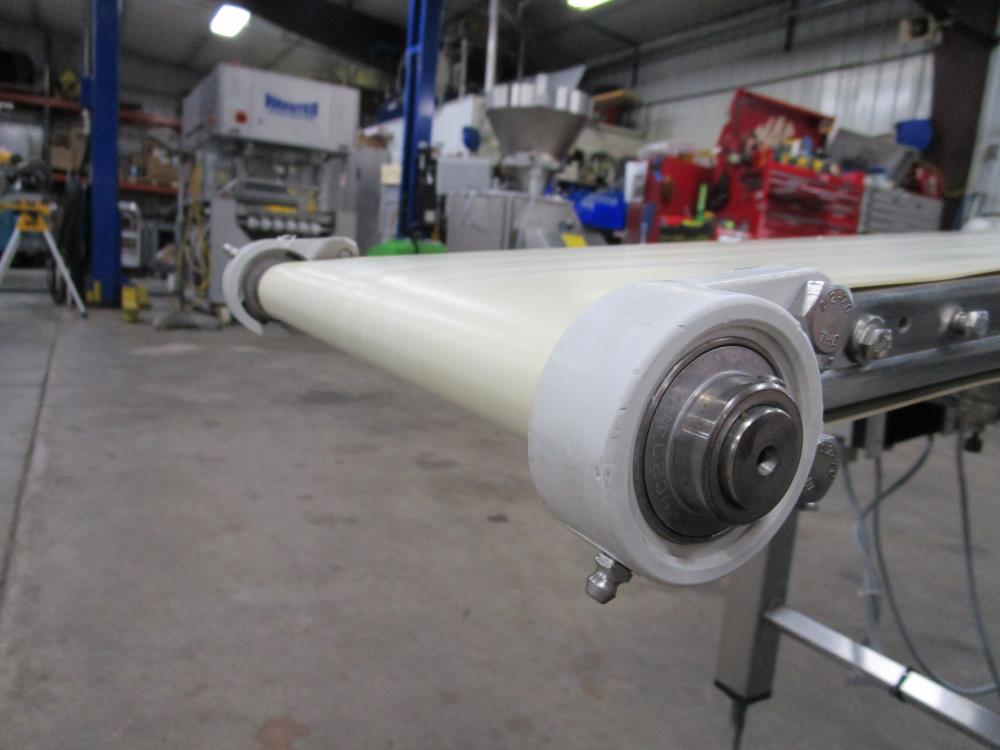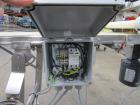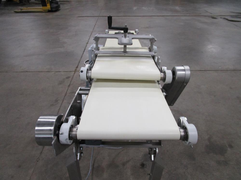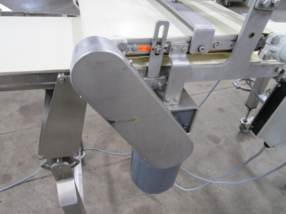 Dorner incline conveyor with flattener/moulder. White vinyl incline belt 72 in. long x 12 in. wide x 28 in. tall infeed x 37 in. tall discharge. Baldor ½ hp washdown motor for conveyor with AC Tech speed controller. Flattening conveyor 18 in. long x 12 in. wide, clearance from 0.25 inches to 2.5 inches tall, GE 0.25 hp washdown motor with AC Tech speed controller. SS frame, adjustable height legs, on locking casters. Electrical requirements 220-volt, 1 phase, 60 hz.