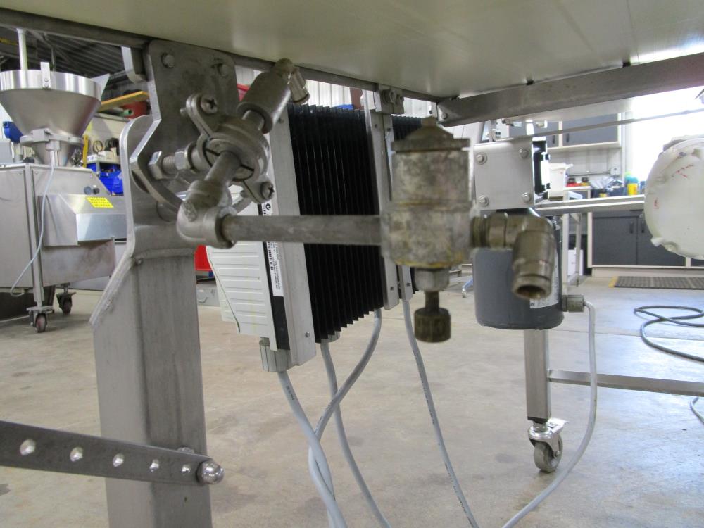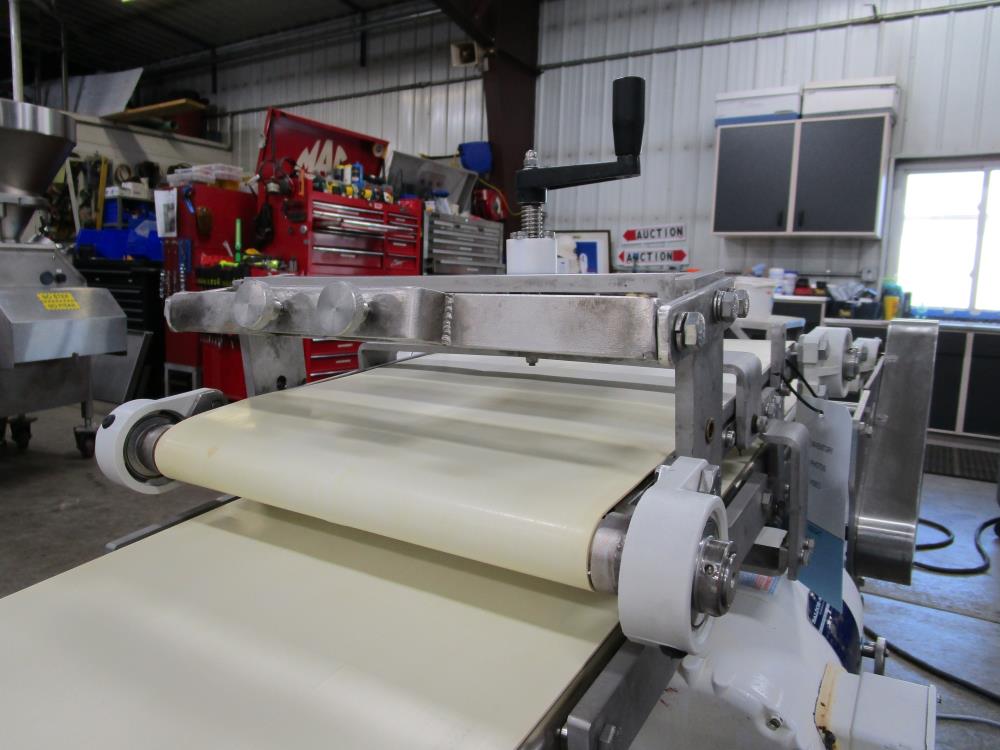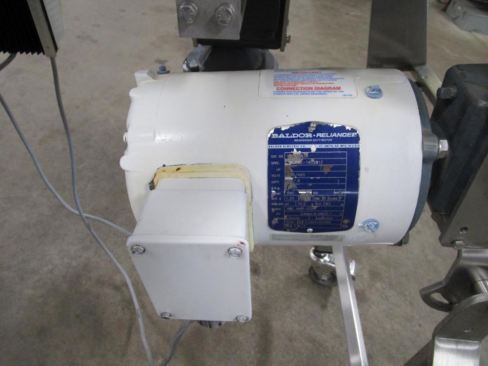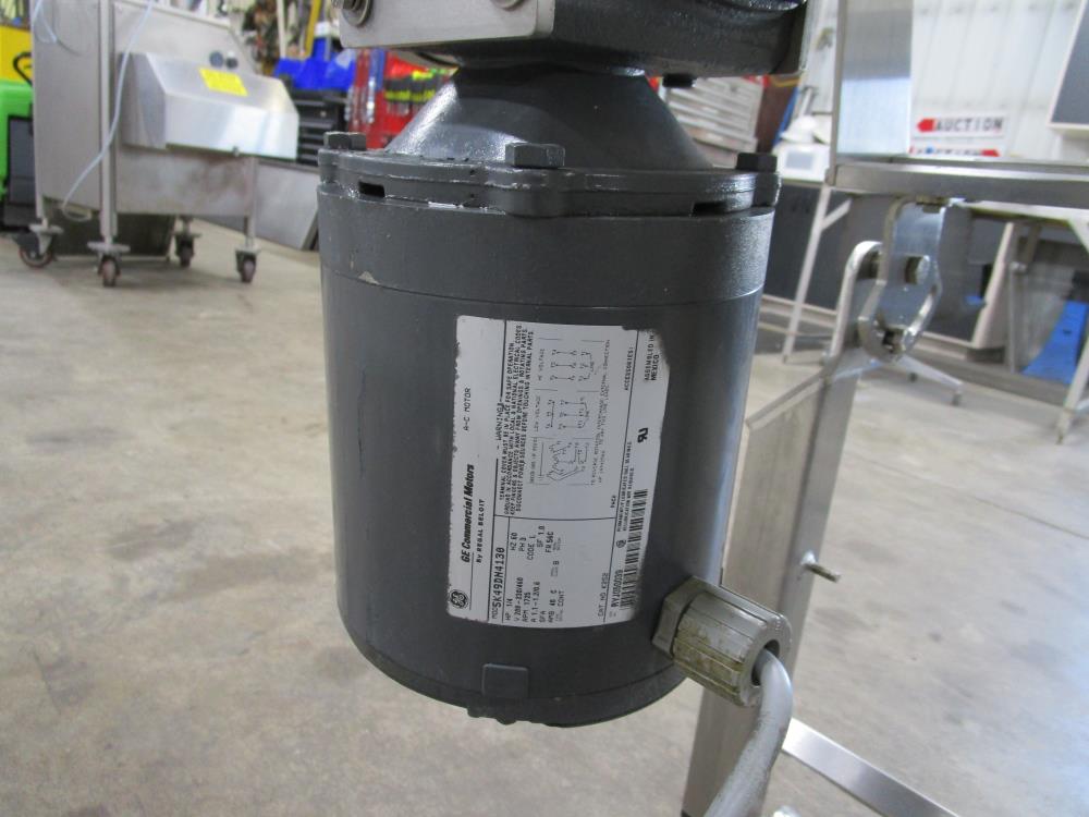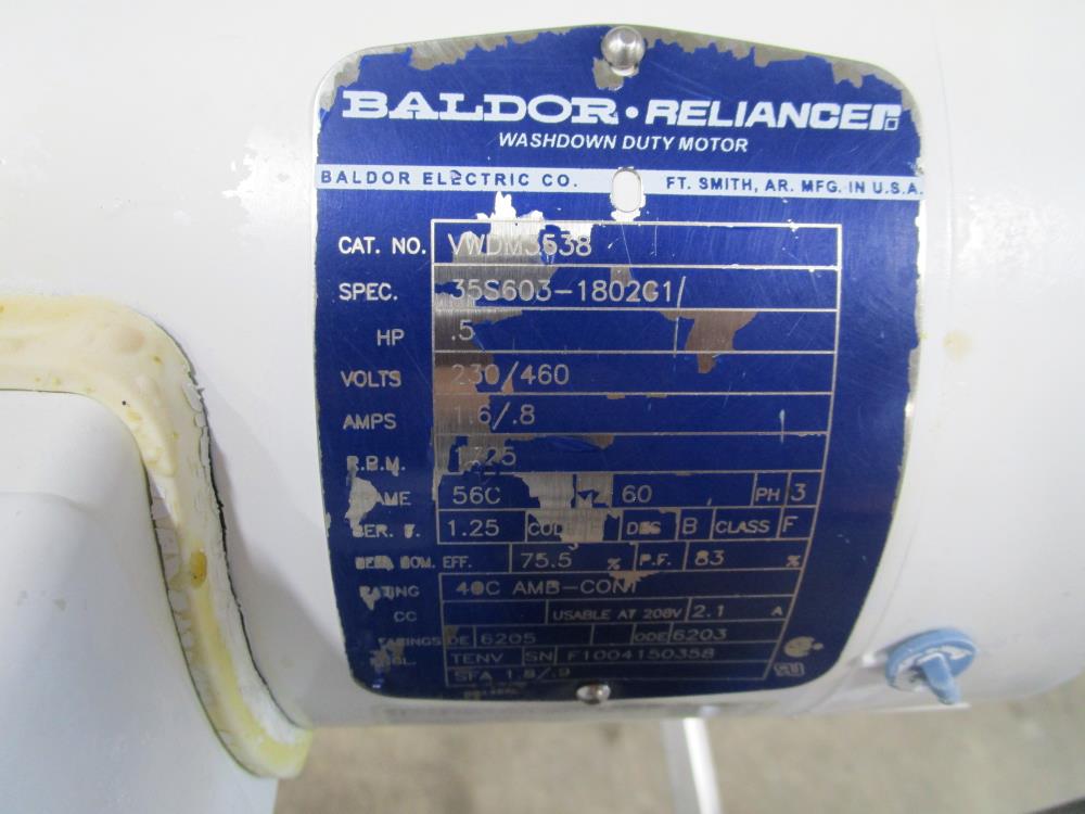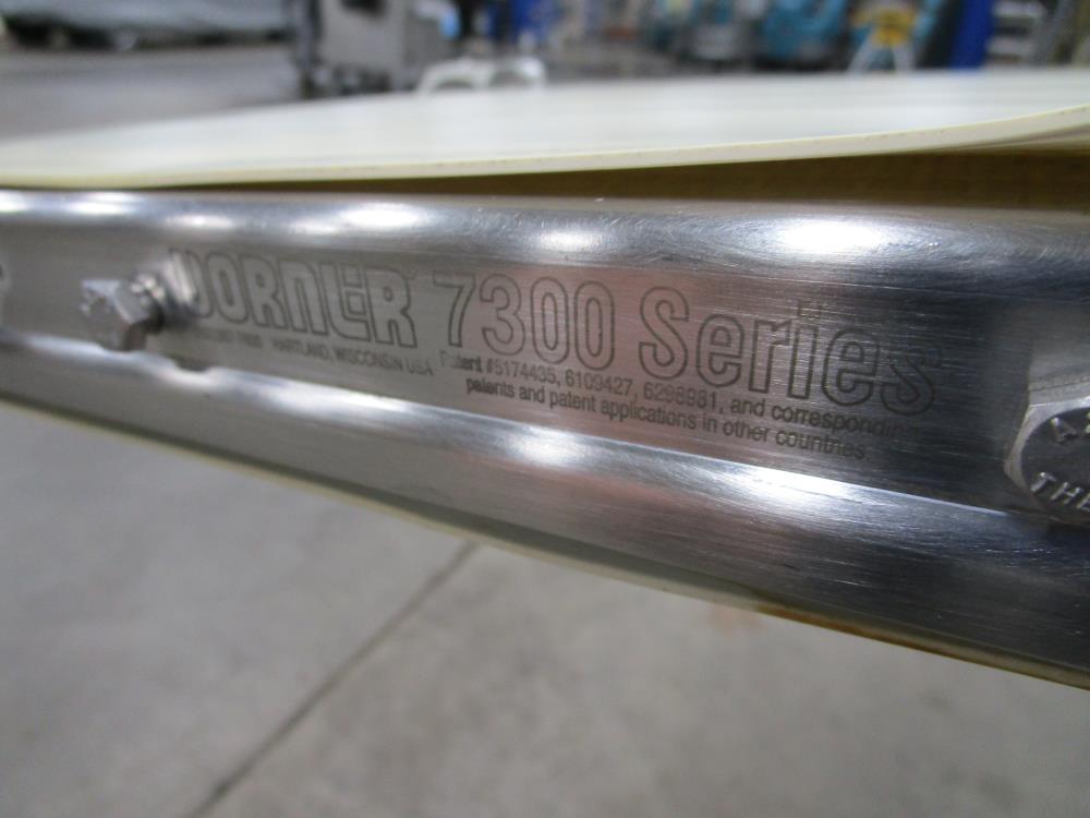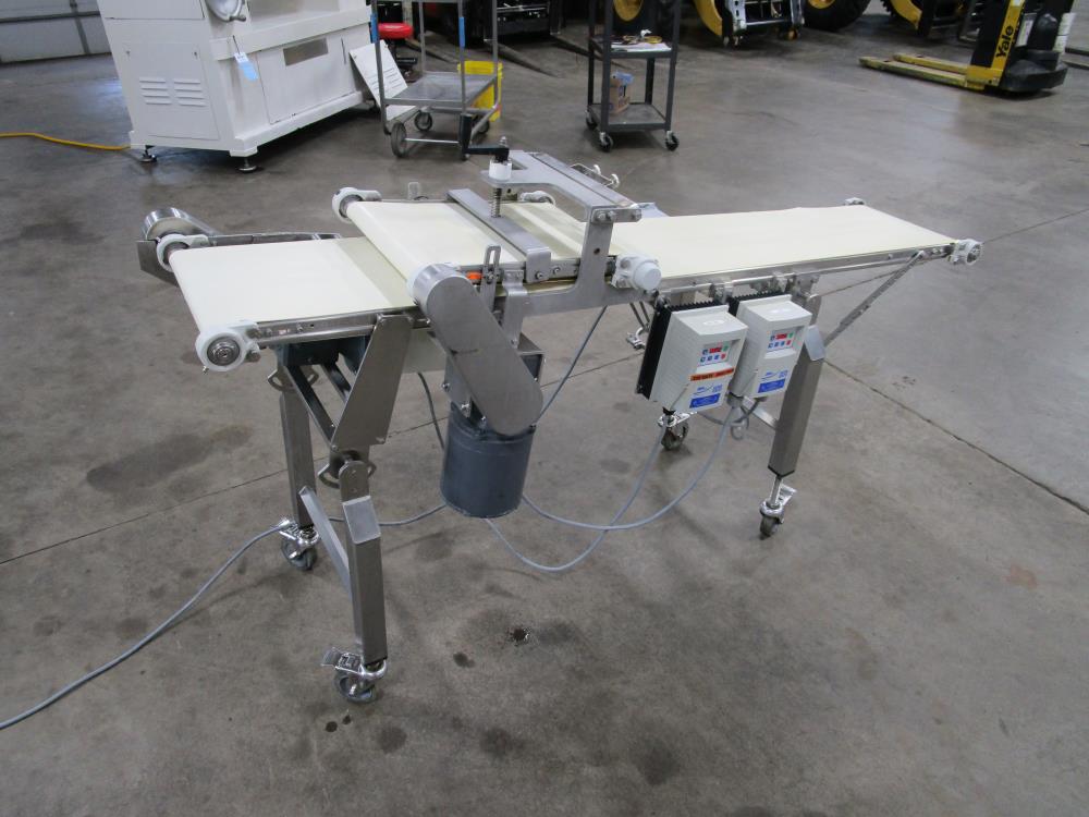 Dorner incline conveyor with flattener/moulder. White vinyl incline belt 72 in. long x 12 in. wide x 28 in. tall infeed x 37 in. tall discharge. Baldor ½ hp washdown motor for conveyor with AC Tech speed controller. Flattening conveyor 18 in. long x 12 in. wide, clearance from 0.25 inches to 2.5 inches tall, GE 0.25 hp washdown motor with AC Tech speed controller. SS frame, adjustable height legs, on locking casters. Electrical requirements 220-volt, 1 phase, 60 hz.