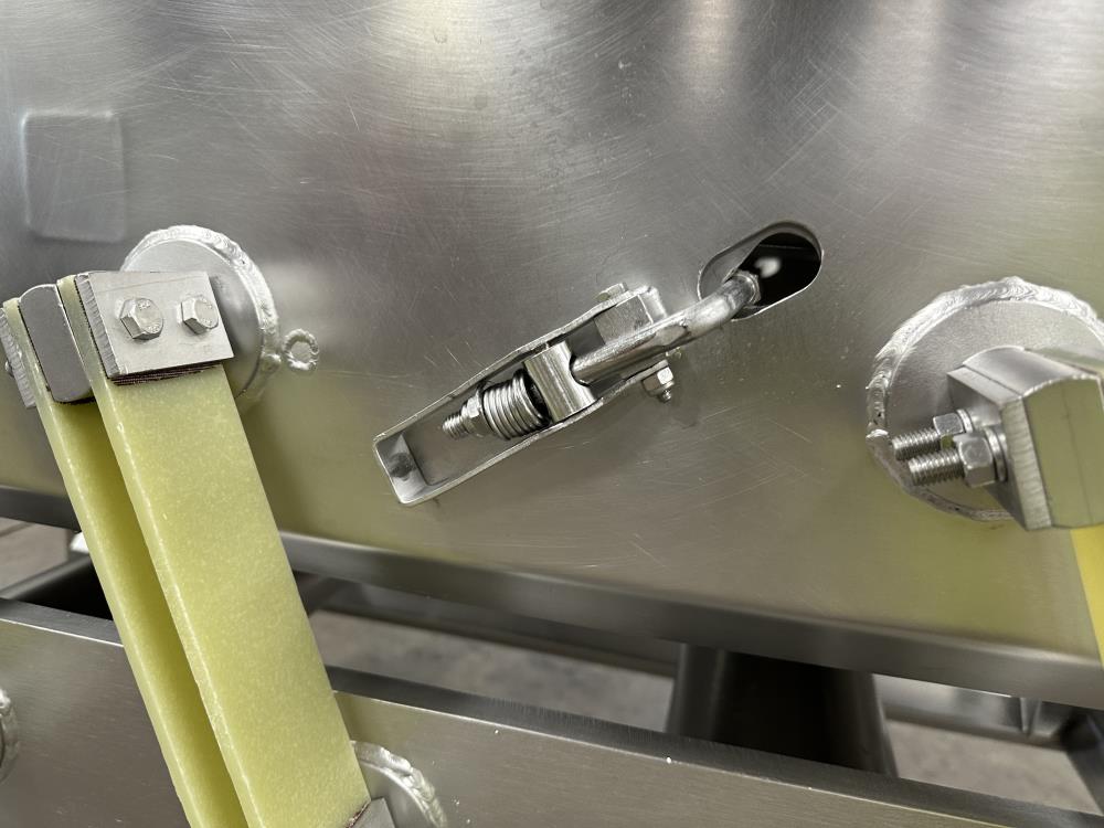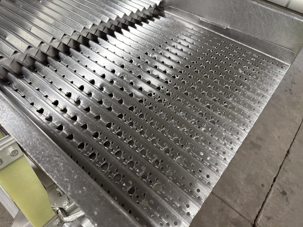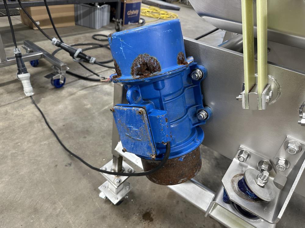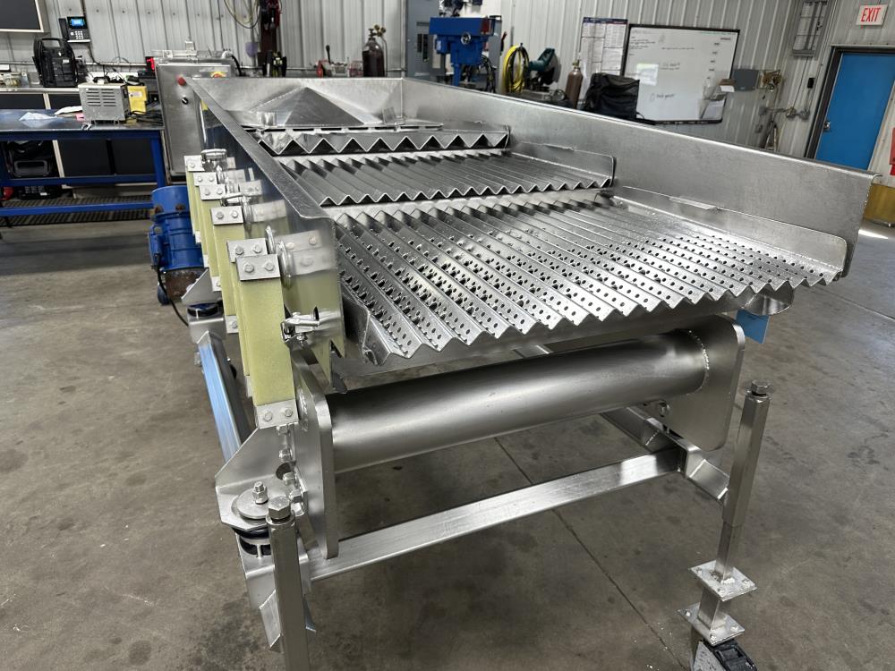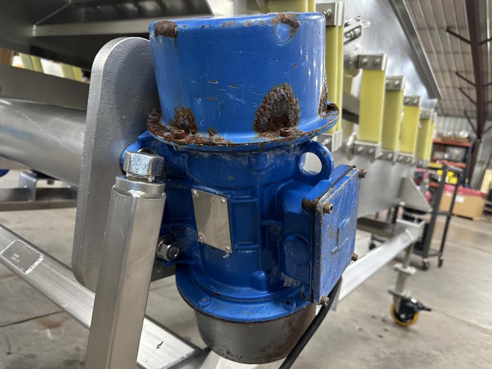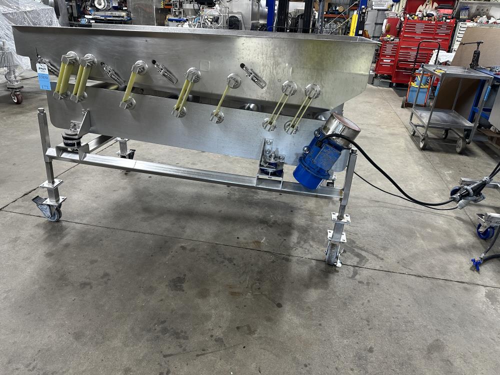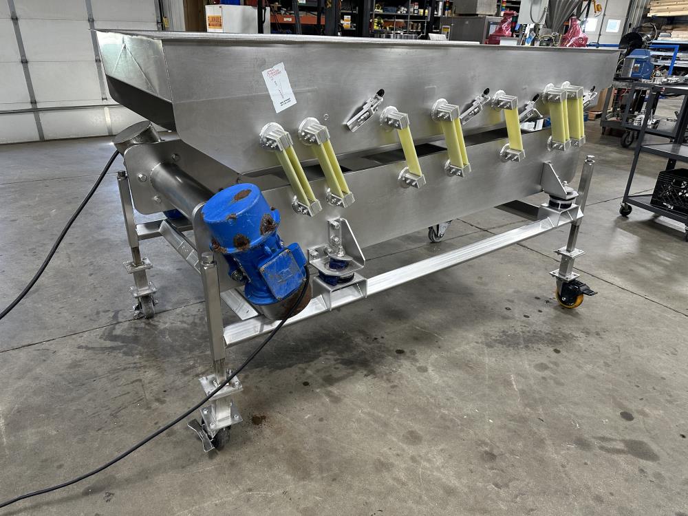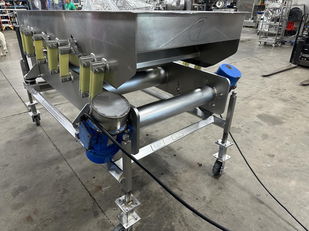 Food Processing Systems SS vibratory spreader conveyor. Model 7000, SN 1860 01. SS bed 84 in. long x 34 in. wide x 10 in. deep. Bed has removable screens with spreading application up to 20 lanes. The screen has oblong holes up to 5/8 in. long x 1/2 in. wide. Current infeed height of 53 in. and discharge height of 46 in. tall. SS frame, on casters, with adjustable height. With SS control panel, Allen Bradley vfd, start and stop, on casters. Electrical requirements 480-volt, 3 phase.