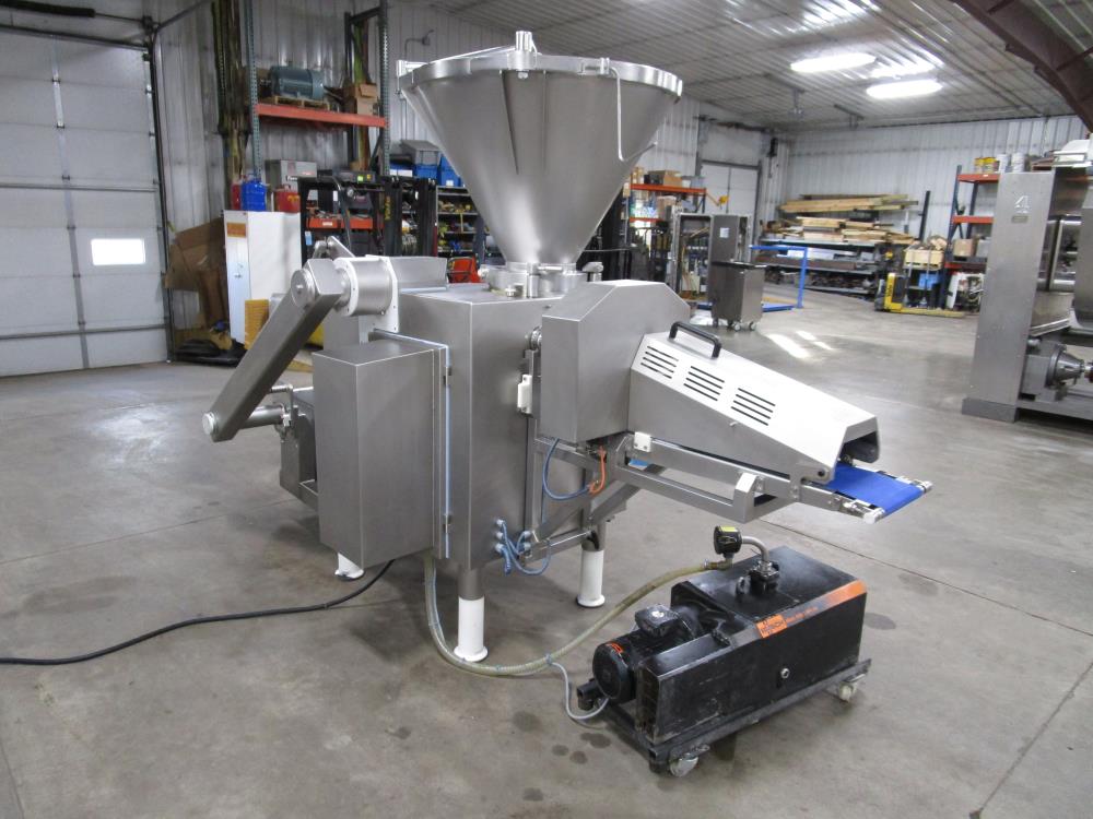 2014 Reiser Vemag Robot HP 12E (HT) vacuum filler with dough cutoff guillotine. Model HP12E, SN 1650456. SS 250 liter hopper. Built in loader with (2) SS carts. SS carts inside dimensions 25 in. x 25 in. x 20 in. deep. VDD dough cutoff. (3) size input diameters 2.25 in., 2.75 in., and 3.5 in. Discharge belt 40 in. long x 9.5 in. wide x 38 in. tall. (3) sets of SS screws included.