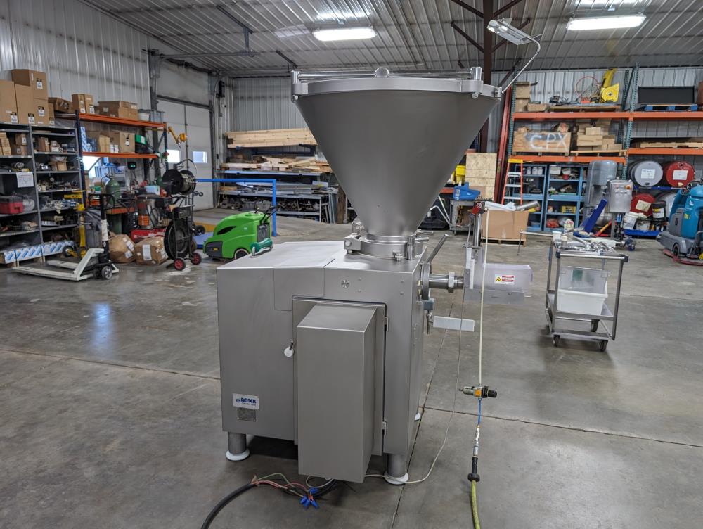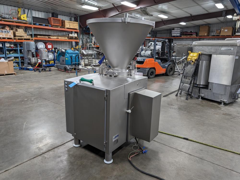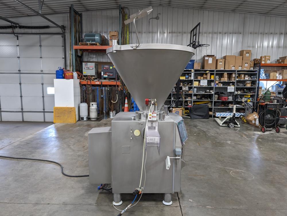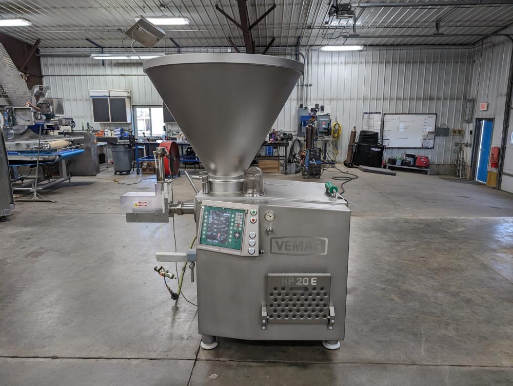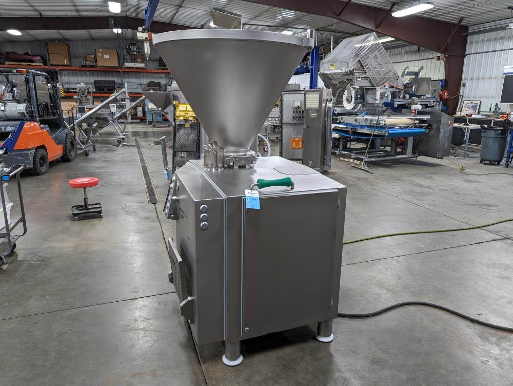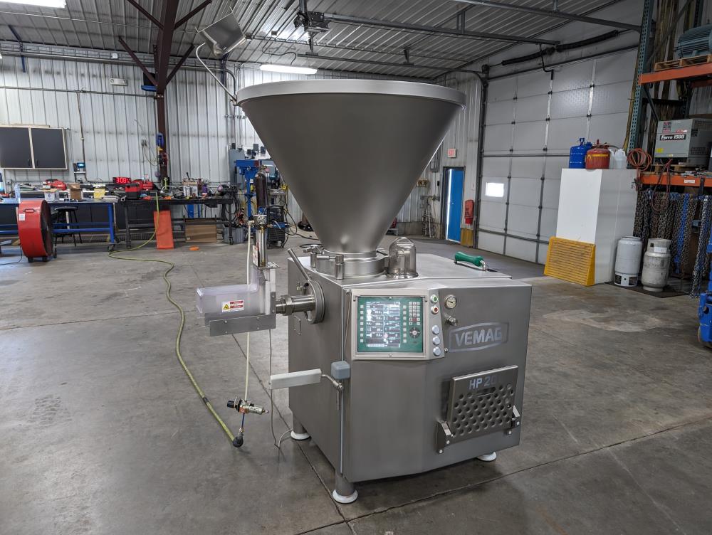 2015 Vemag HP20E Vacuum Filler, SN: 1630803. 350 liter SS hopper. SS double screws (915380088). 3 1/2 in. threaded discharge horn. Filling rate up to 17,000 kg/hr. (34,478 lbs.) 315 operating hours. White poly legs. 460V, 3 Phase, 50/60Hz, 33 Amp. Overall dimensions: 57 in. long x 57 in. wide x 83 in. tall.