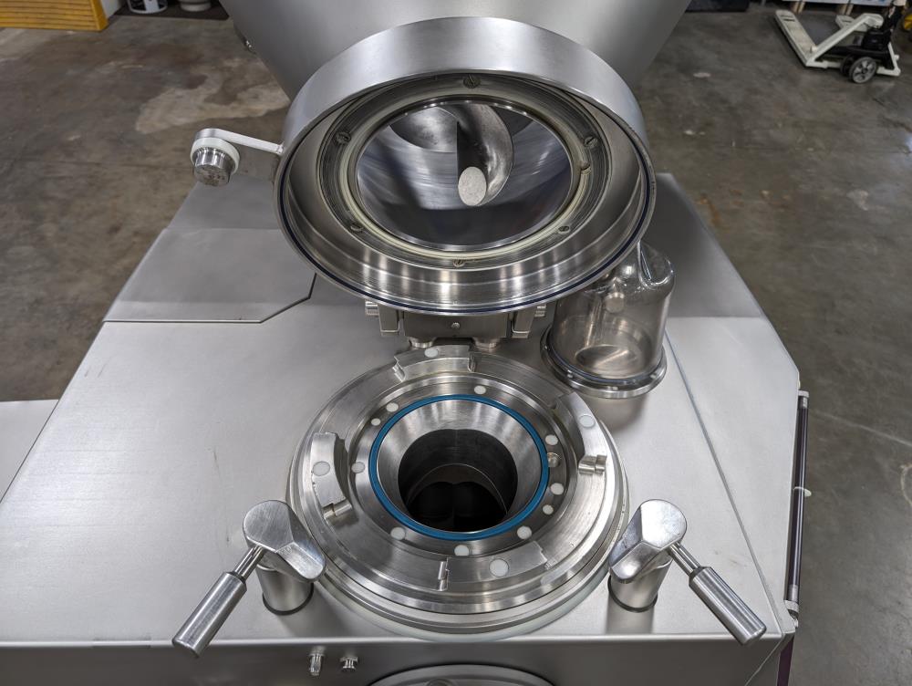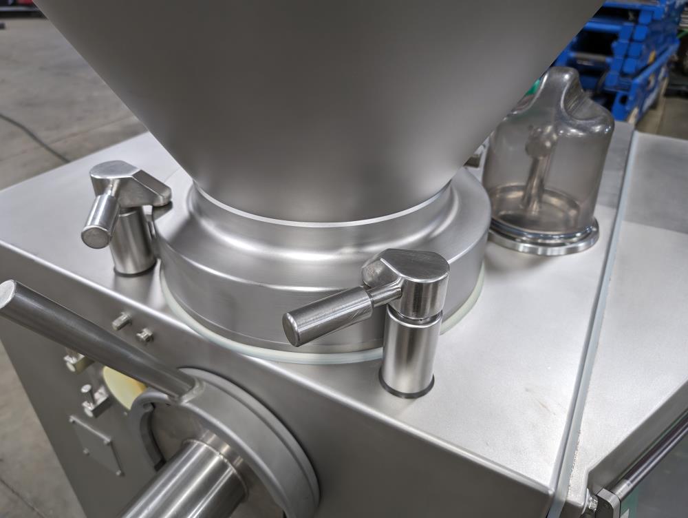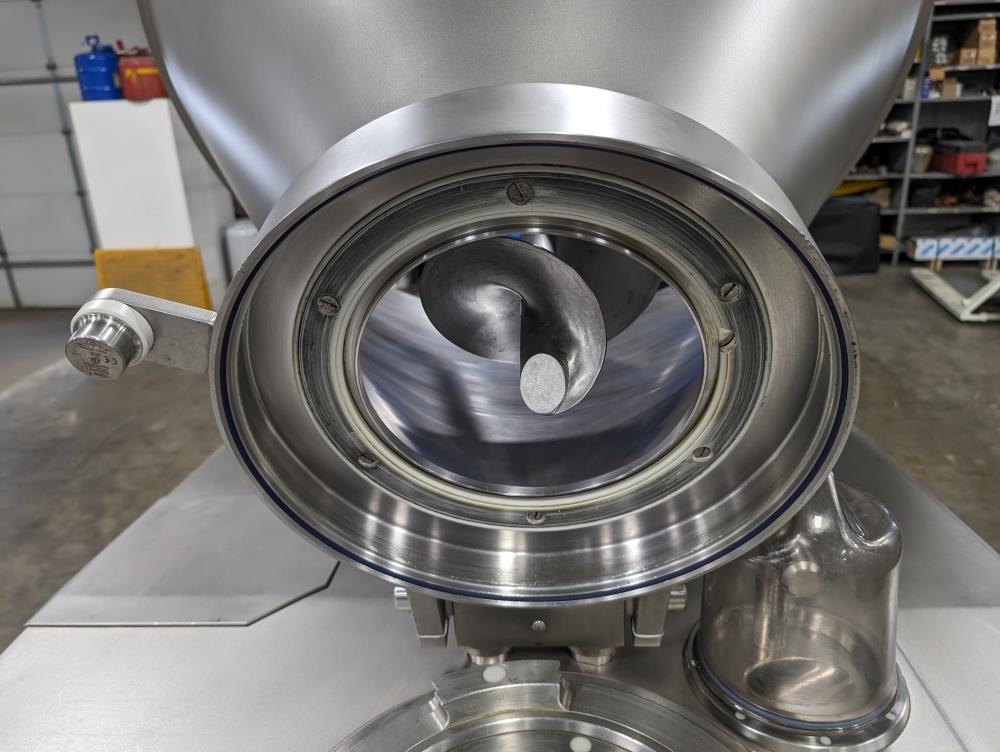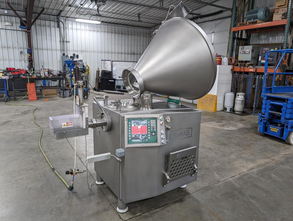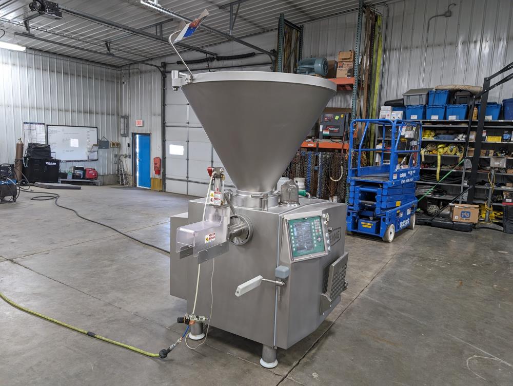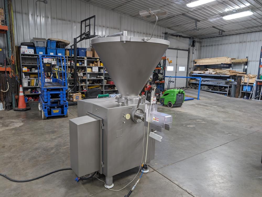 2015 Vemag HP20E Vacuum Filler, SN: 1630803. 350 liter SS hopper. SS double screws (915380088). 3 1/2 in. threaded discharge horn. Filling rate up to 17,000 kg/hr. (34,478 lbs.) 315 operating hours. White poly legs. 460V, 3 Phase, 50/60Hz, 33 Amp. Overall dimensions: 57 in. long x 57 in. wide x 83 in. tall.