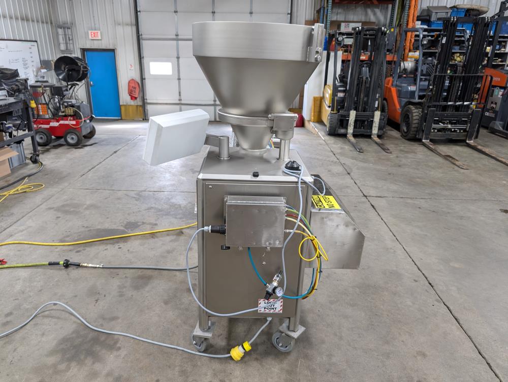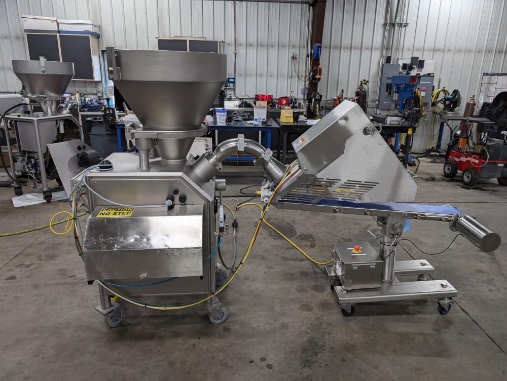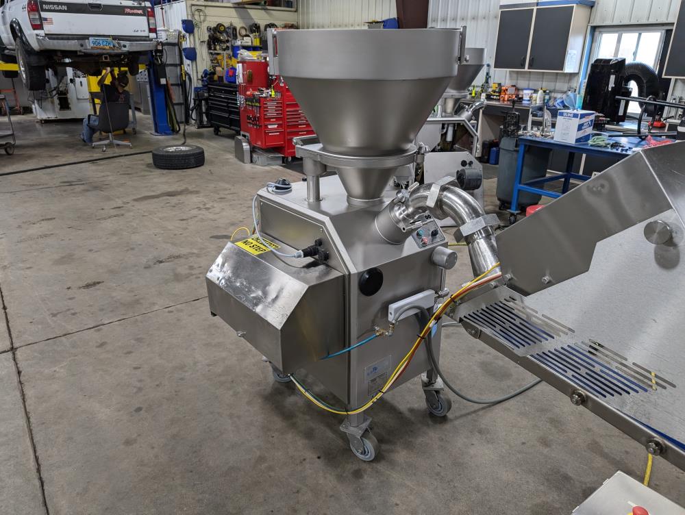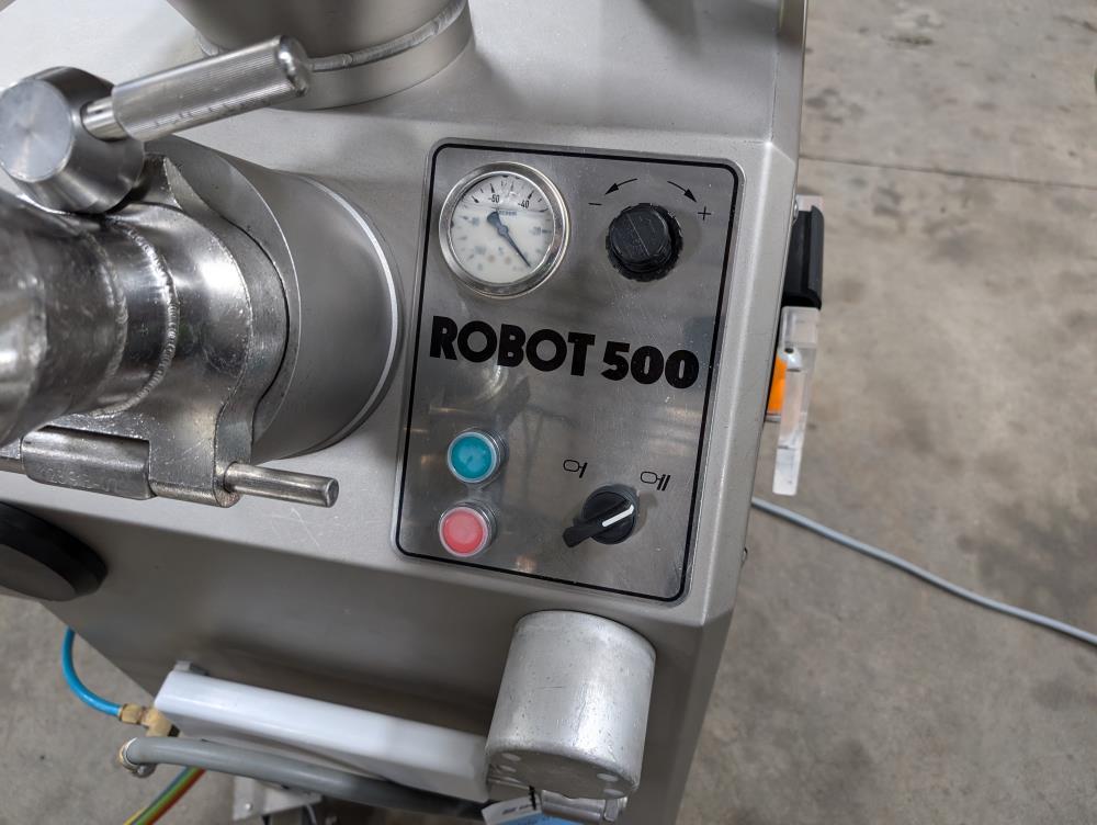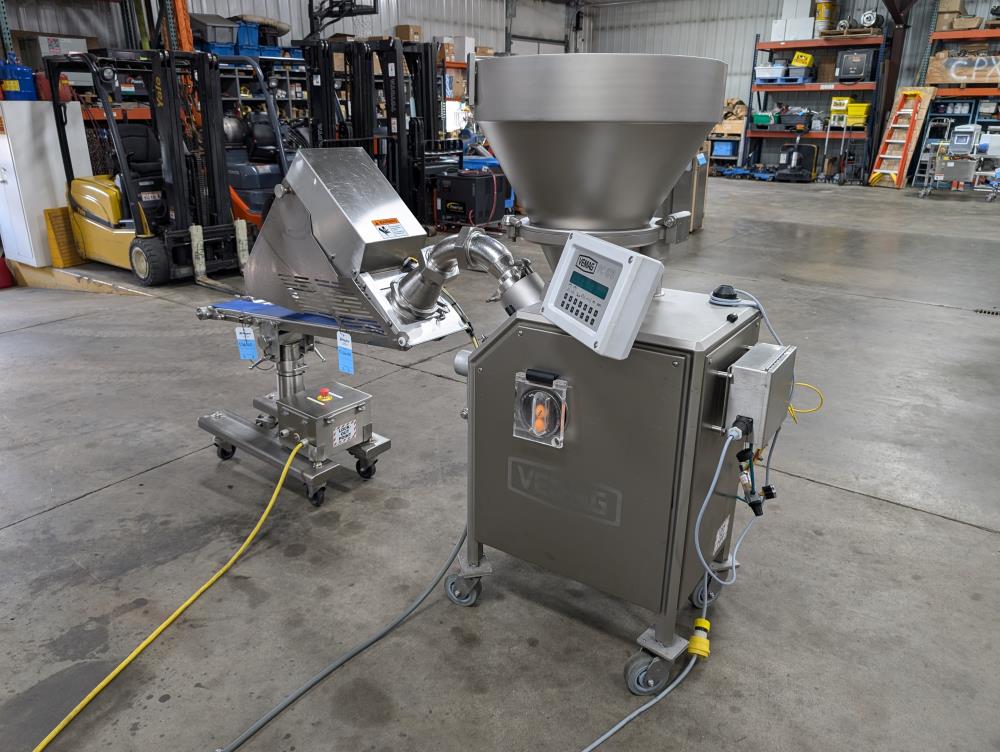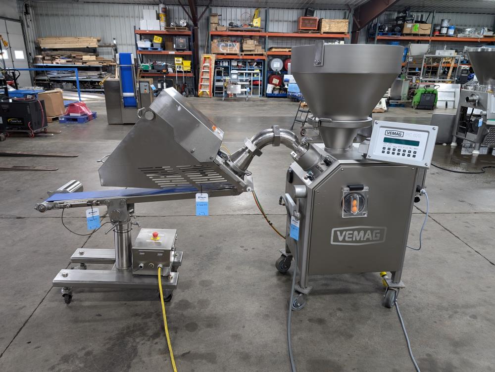 2017 Vemag Robot 500 with wirecut and conveyor. Model Robot 500 filler, SN 1285319. SS hopper 26 in. diameter x 6 in. straight side x 10 in. tall cone, 13 in. diameter discharge, 71 in. tall infeed. Discharge horn 4 in. diameter. Carbon steels screws. Vemag PC878 controls. Includes pneumatic wire cut, with 6 in. diameter insert. Vemag discharge conveyor 53 in. long x 6 in. wide x 34 in. tall, adjustable height legs, angle discharge, SS frame, on casters. Electrical requirements 220-240-volt, 3 phase, 60 hz, 23 amp. Air requirements 110 l/min, and 5-6 bar.