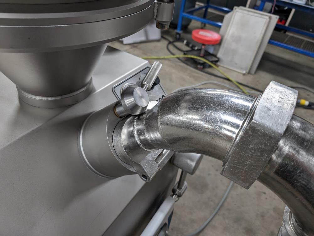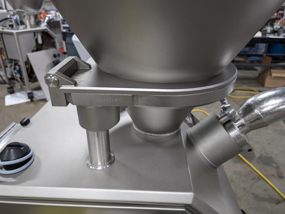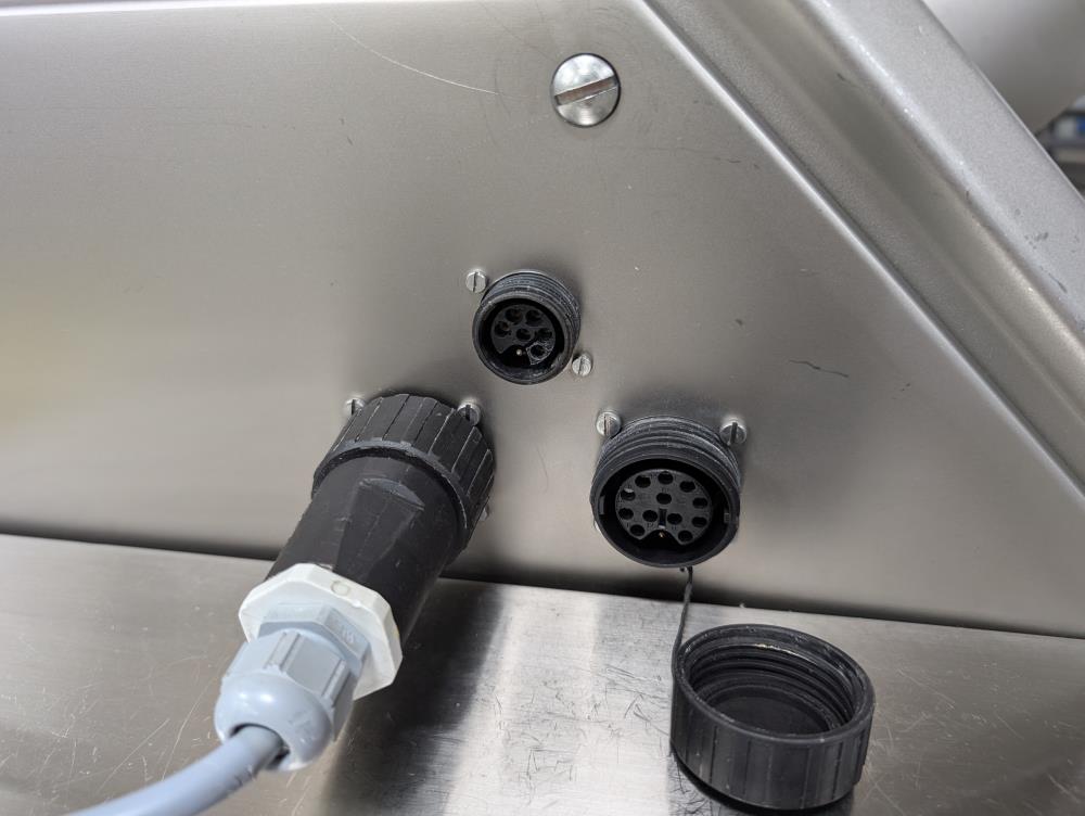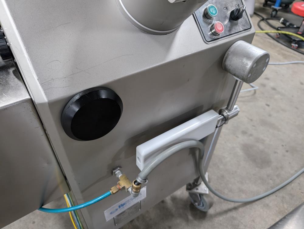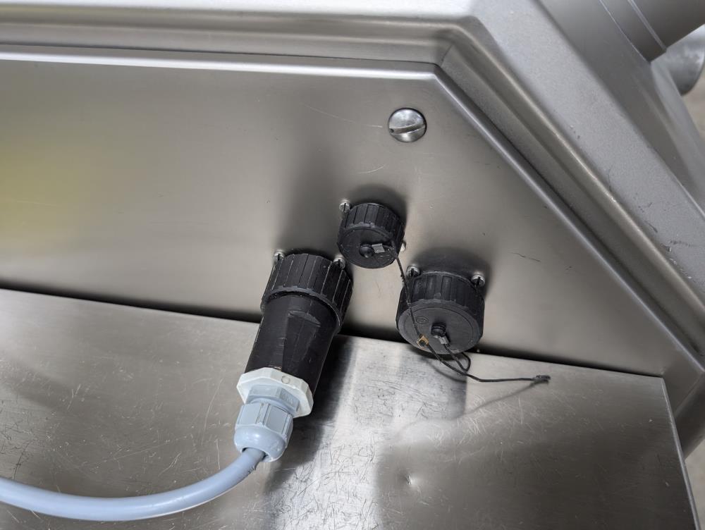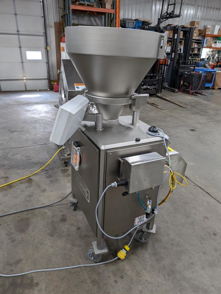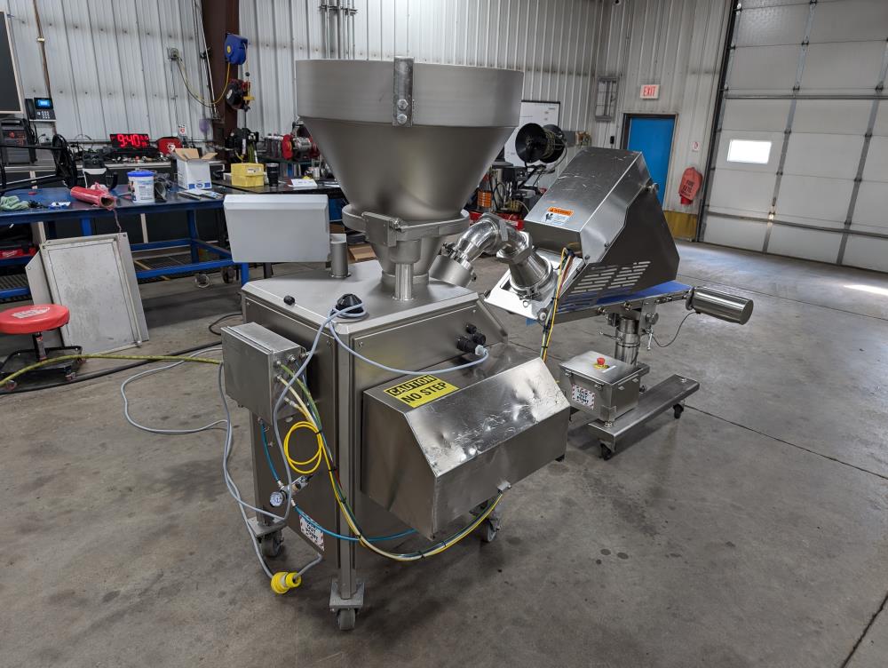 2017 Vemag Robot 500 with wirecut and conveyor. Model Robot 500 filler, SN 1285319. SS hopper 26 in. diameter x 6 in. straight side x 10 in. tall cone, 13 in. diameter discharge, 71 in. tall infeed. Discharge horn 4 in. diameter. Carbon steels screws. Vemag PC878 controls. Includes pneumatic wire cut, with 6 in. diameter insert. Vemag discharge conveyor 53 in. long x 6 in. wide x 34 in. tall, adjustable height legs, angle discharge, SS frame, on casters. Electrical requirements 220-240-volt, 3 phase, 60 hz, 23 amp. Air requirements 110 l/min, and 5-6 bar.