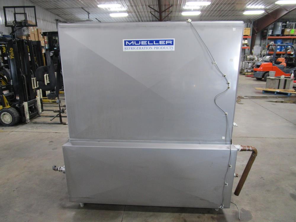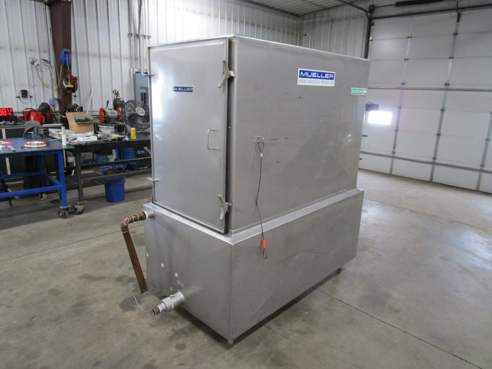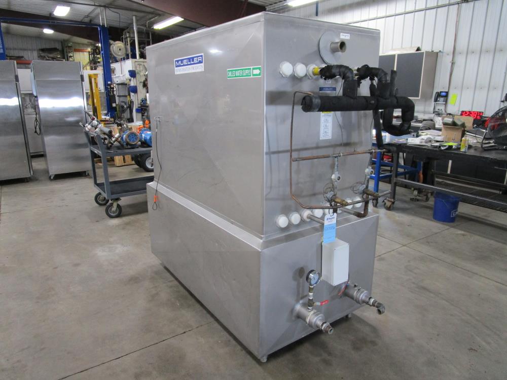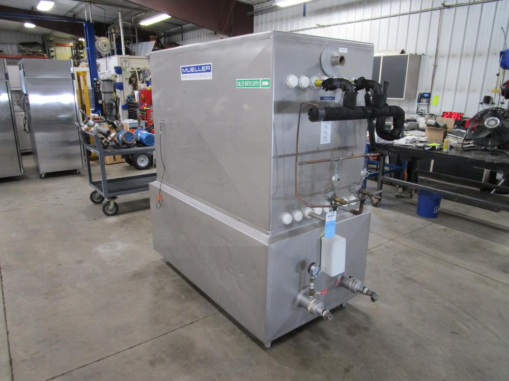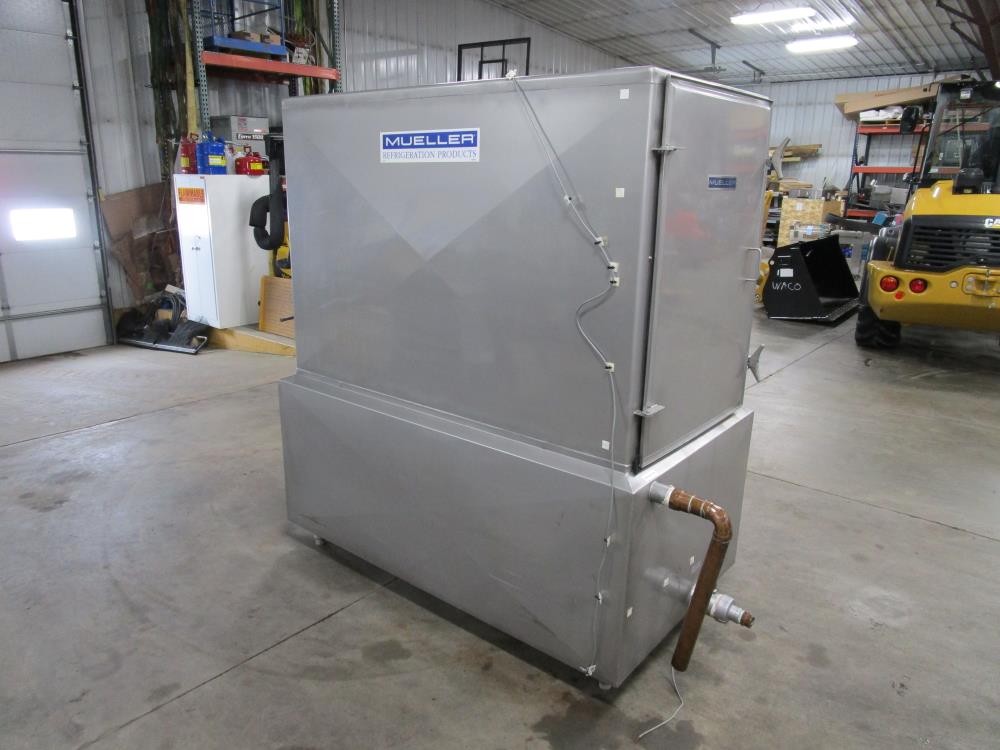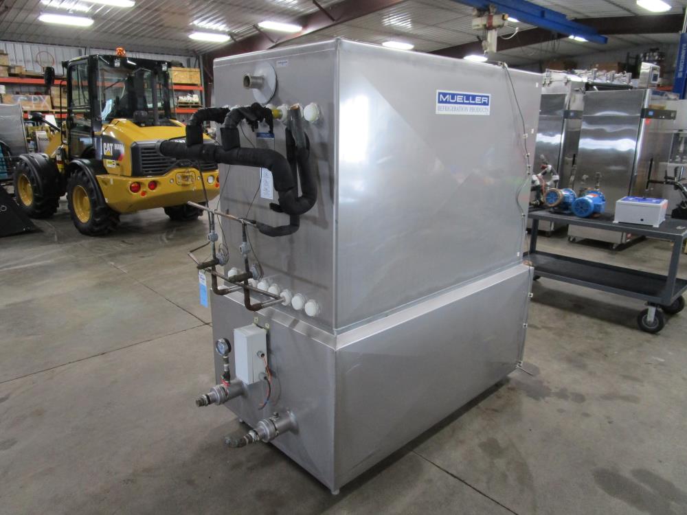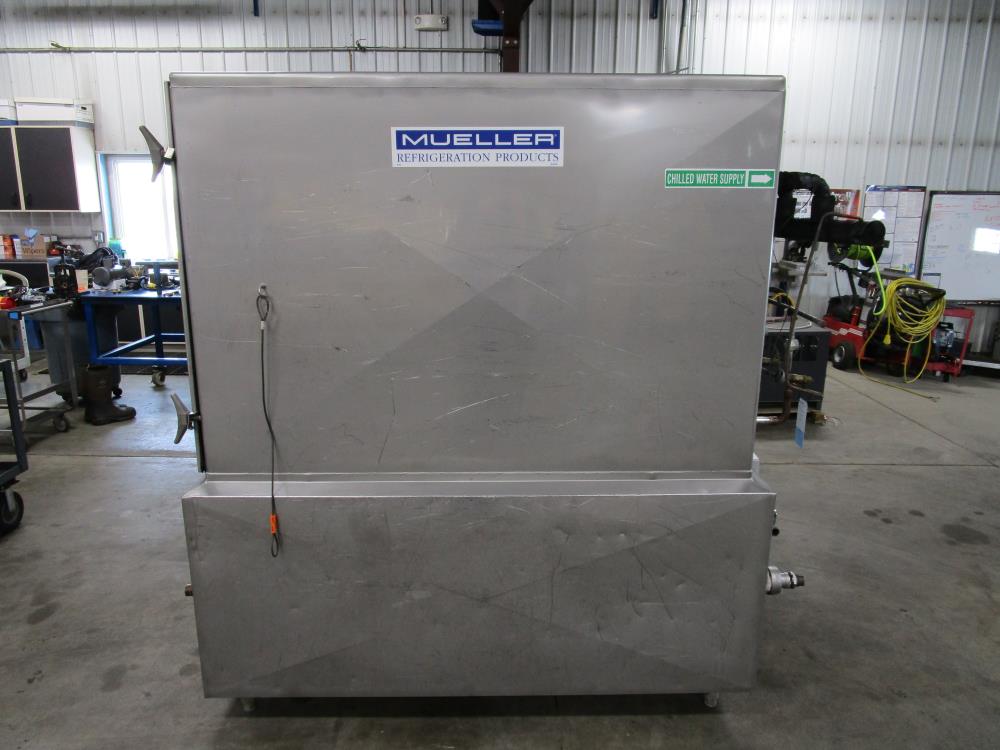Mueller falling film water chiller. Model 165GAL FFC, SN 1204937-1. All stainless steel construction. 165 gallon capacity. 2 plates, 5 ft. long x 3 ft. tall. Holding tank 5 ft. long x 35 in. wide x 24 in. deep. Includes (2) Goulds SS centrifugal pumps, Model MCS, size 1.25 x 1.5-6, Mueller multi-stage chiller control.