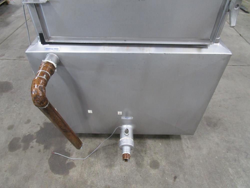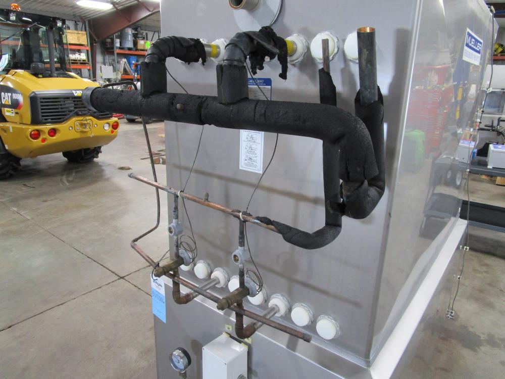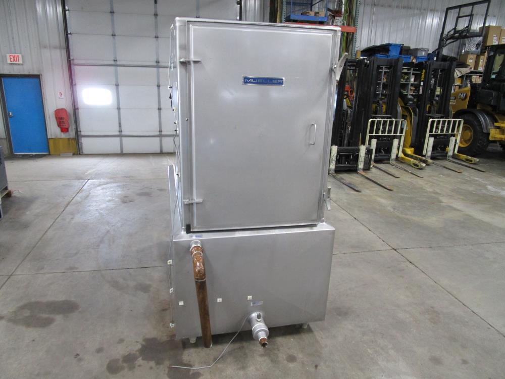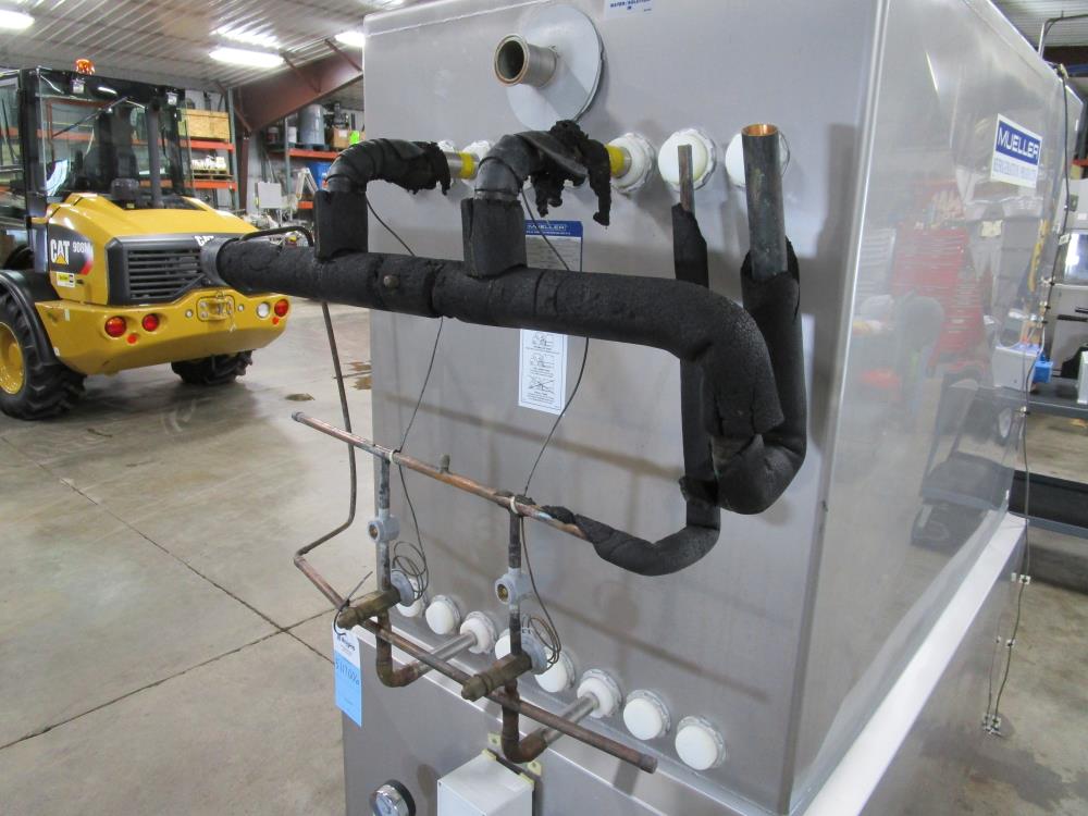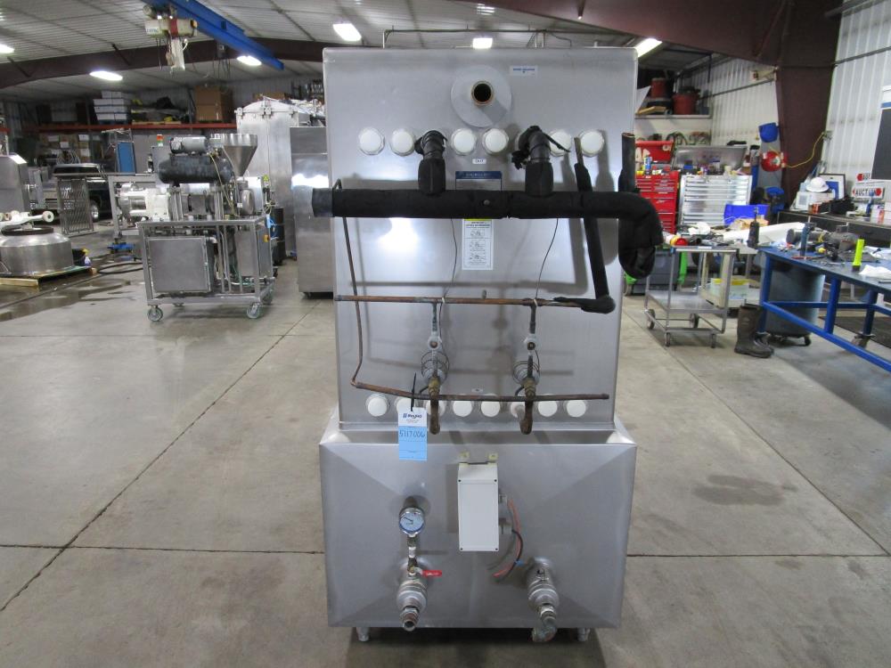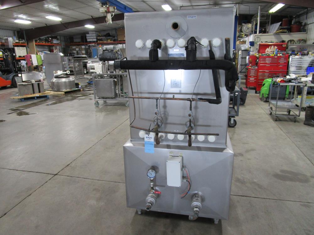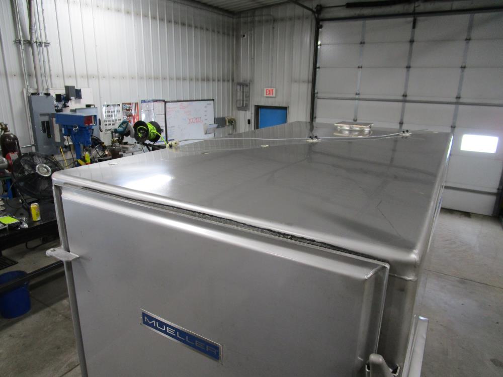 Mueller falling film water chiller. Model 165GAL FFC, SN 1204937-1. All stainless steel construction. 165 gallon capacity. 2 plates, 5 ft. long x 3 ft. tall. Holding tank 5 ft. long x 35 in. wide x 24 in. deep. Includes (2) Goulds SS centrifugal pumps, Model MCS, size 1.25 x 1.5-6, Mueller multi-stage chiller control.