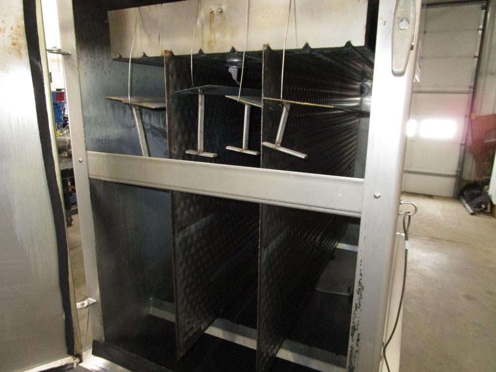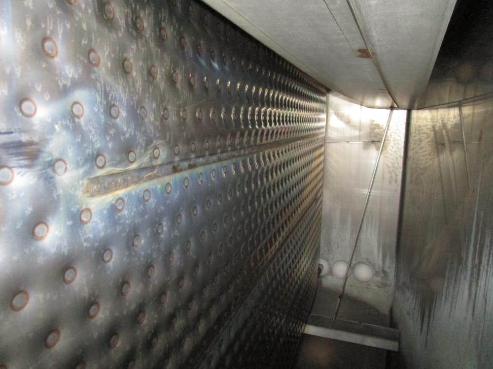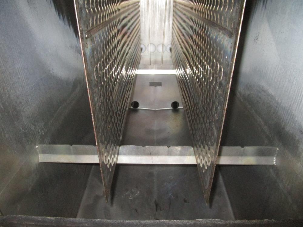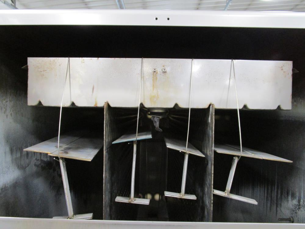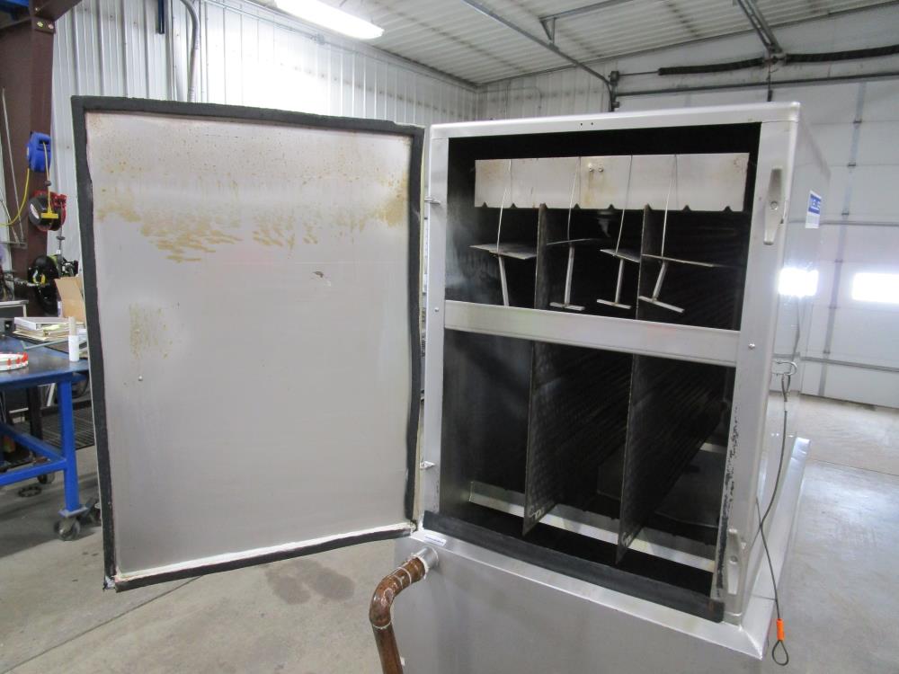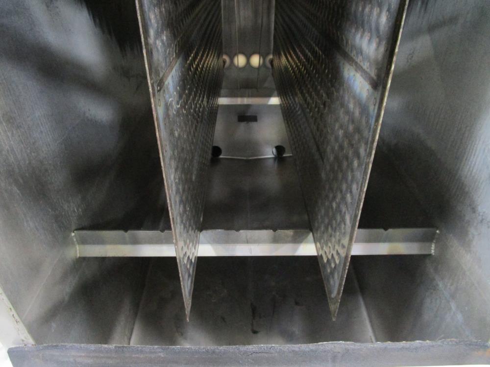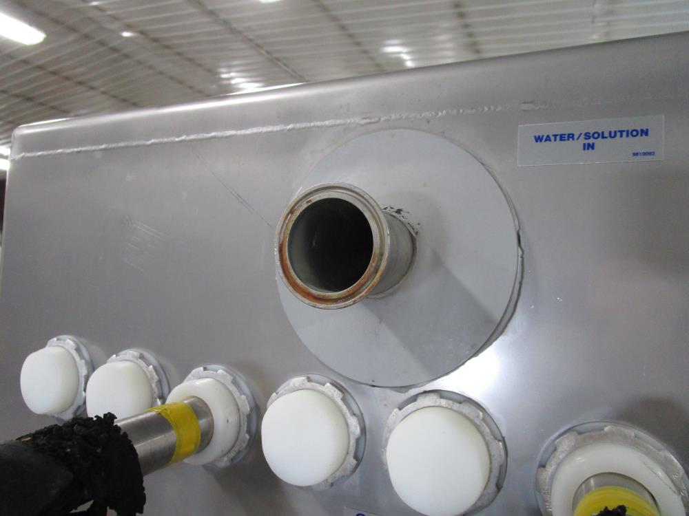 Mueller falling film water chiller. Model 165GAL FFC, SN 1204937-1. All stainless steel construction. 165 gallon capacity. 2 plates, 5 ft. long x 3 ft. tall. Holding tank 5 ft. long x 35 in. wide x 24 in. deep. Includes (2) Goulds SS centrifugal pumps, Model MCS, size 1.25 x 1.5-6, Mueller multi-stage chiller control.