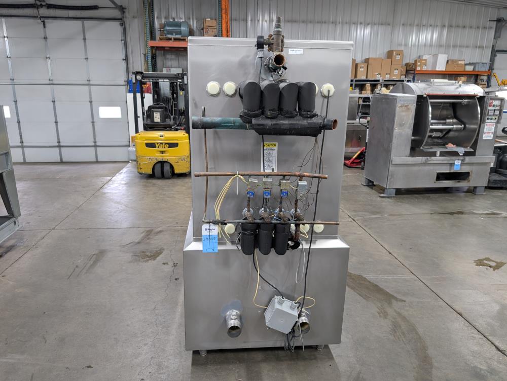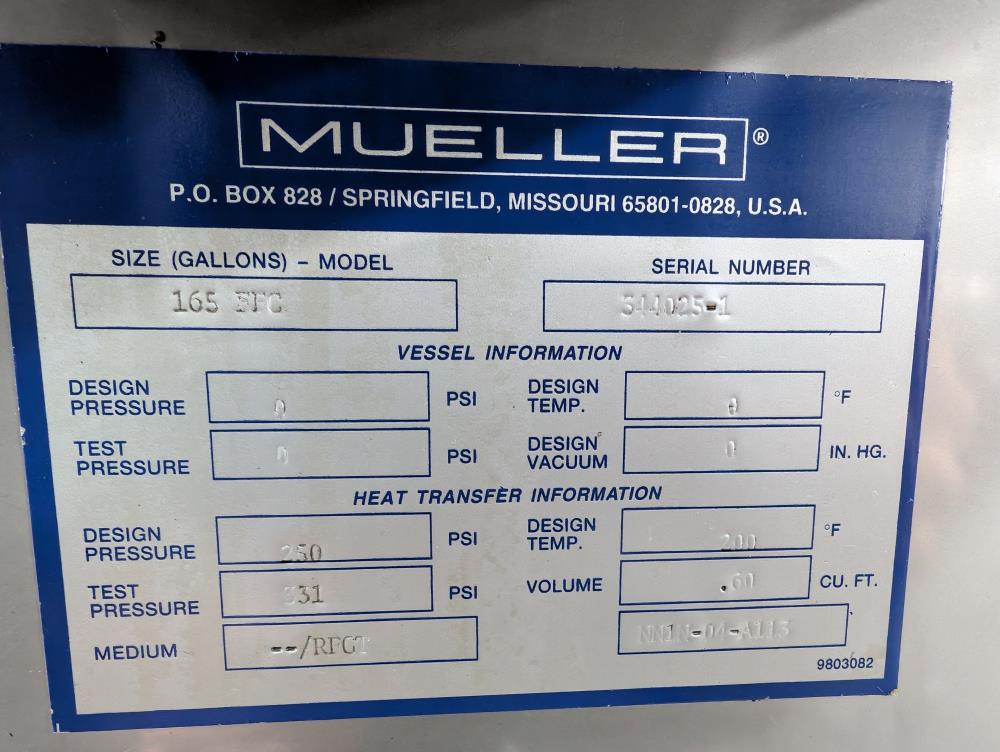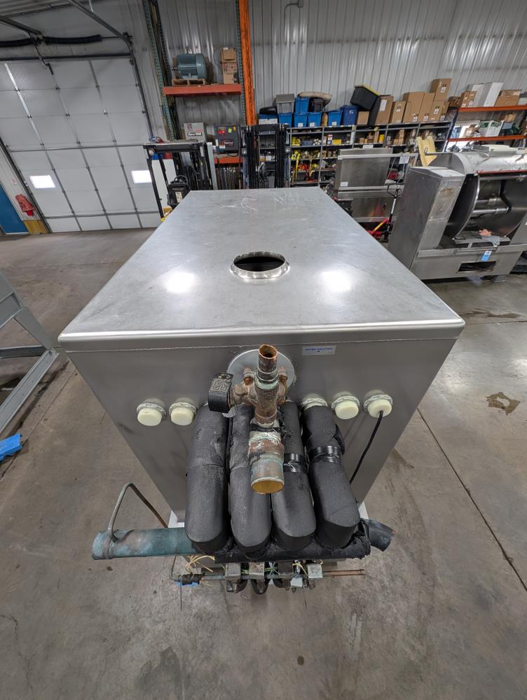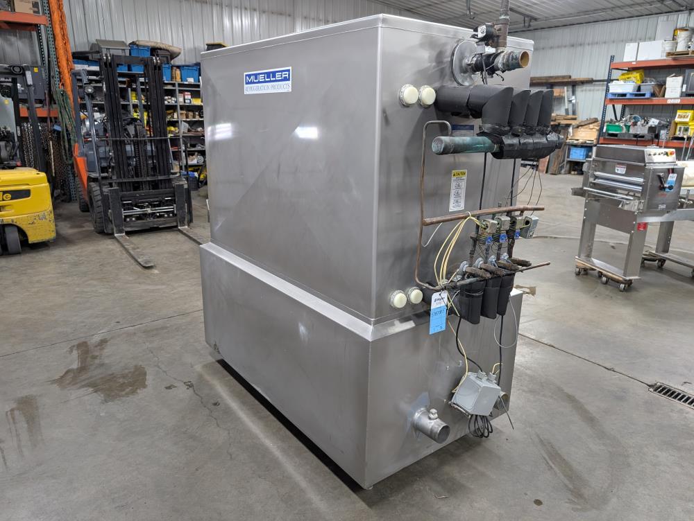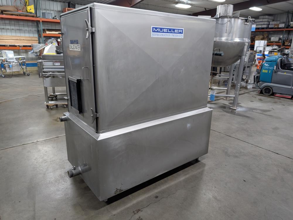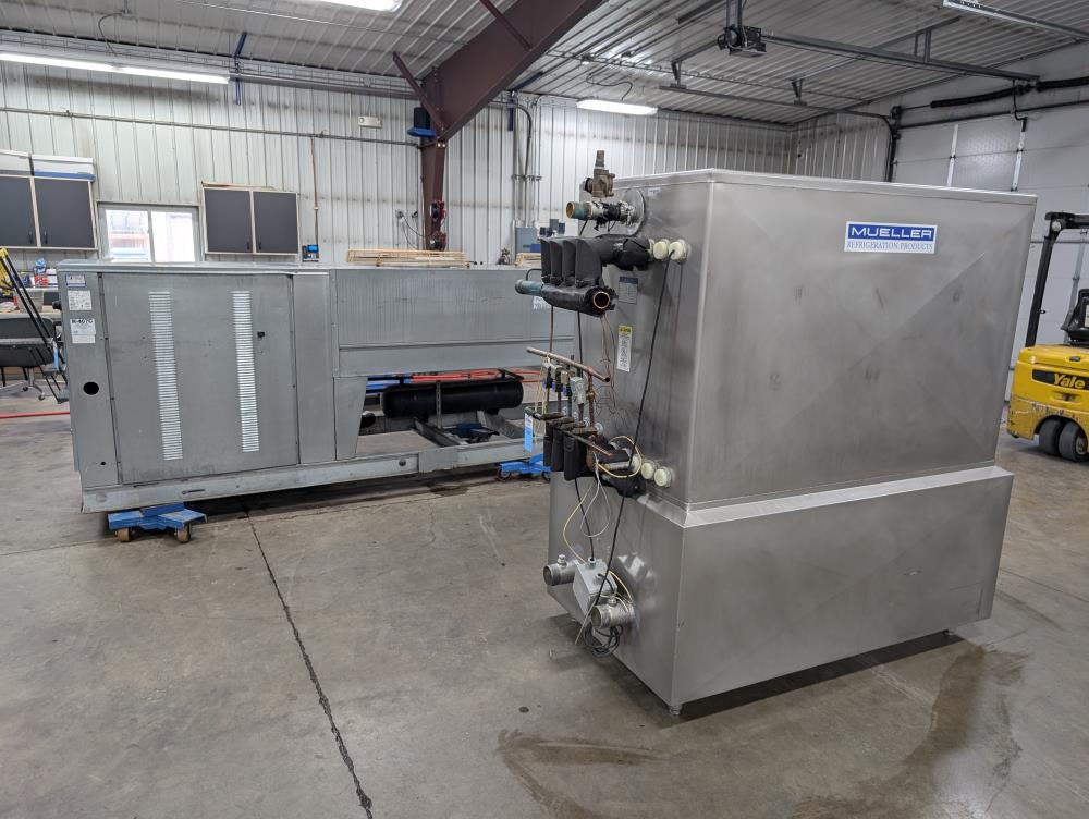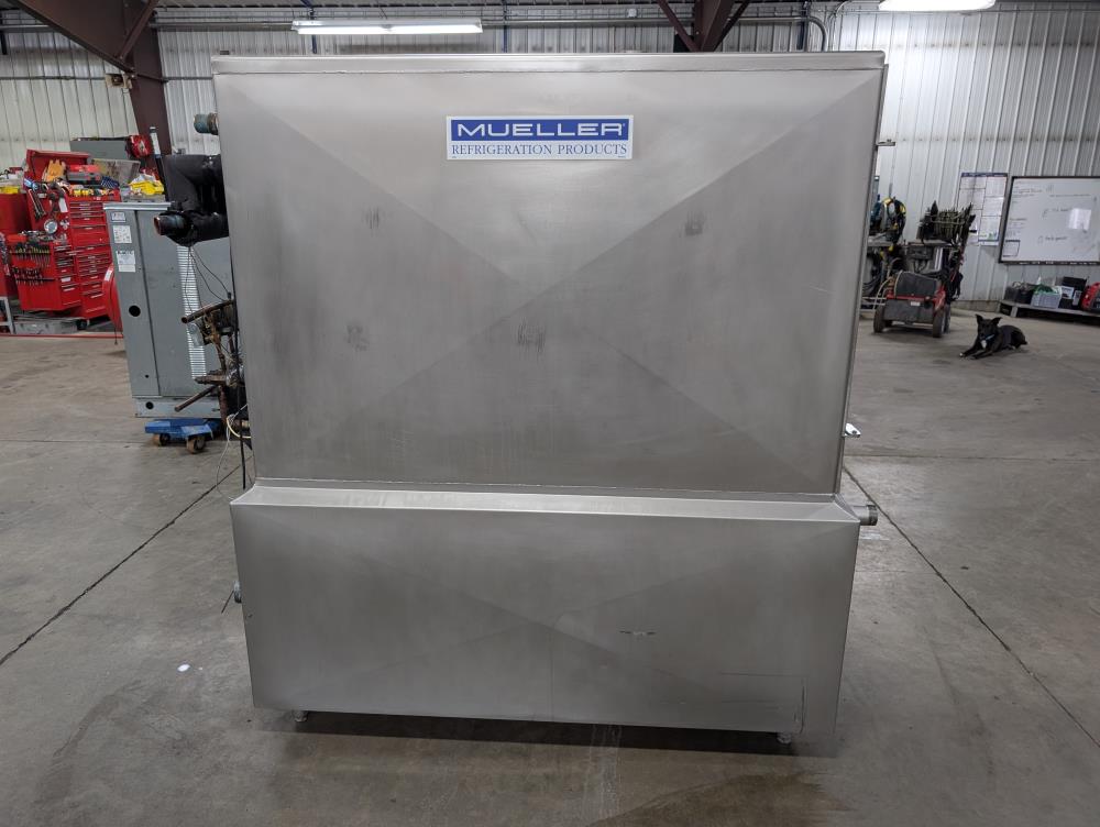 Mueller Falling Film Water Chiller, Model 165 FFC, SN 344025-1, Size: 165 GAL FFC, 4 SS plates, 5 ft. long x 3 ft. tall. 165 gallon capacity. Holding tank 5 ft. long x 35 in. wide x 24 in. deep. 3 in. inlet and outlets. Exhaust fan on top.