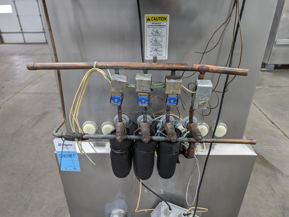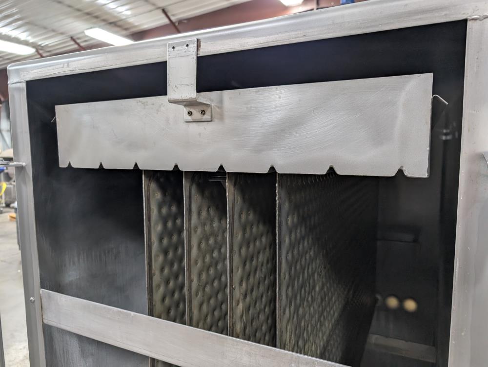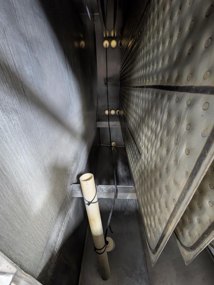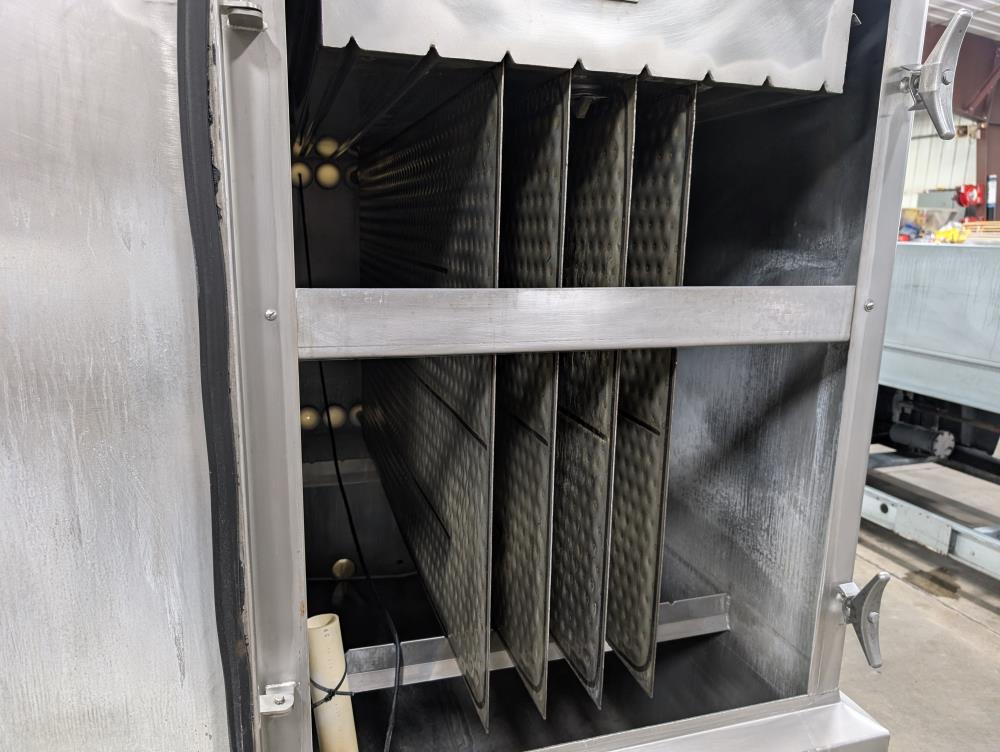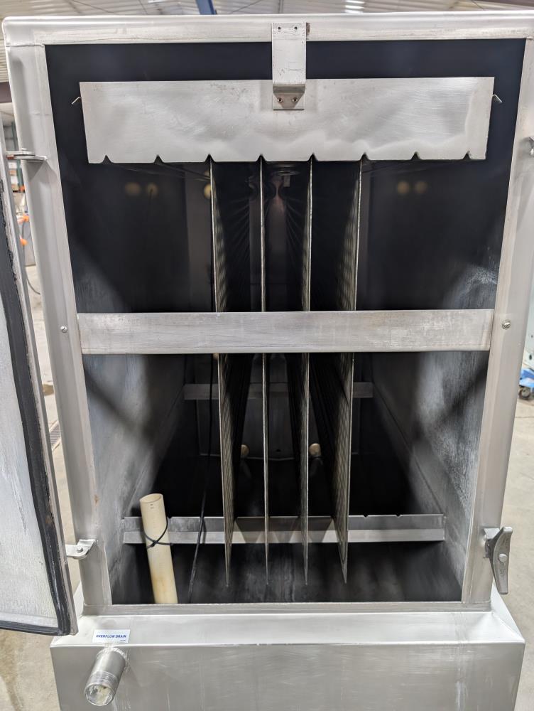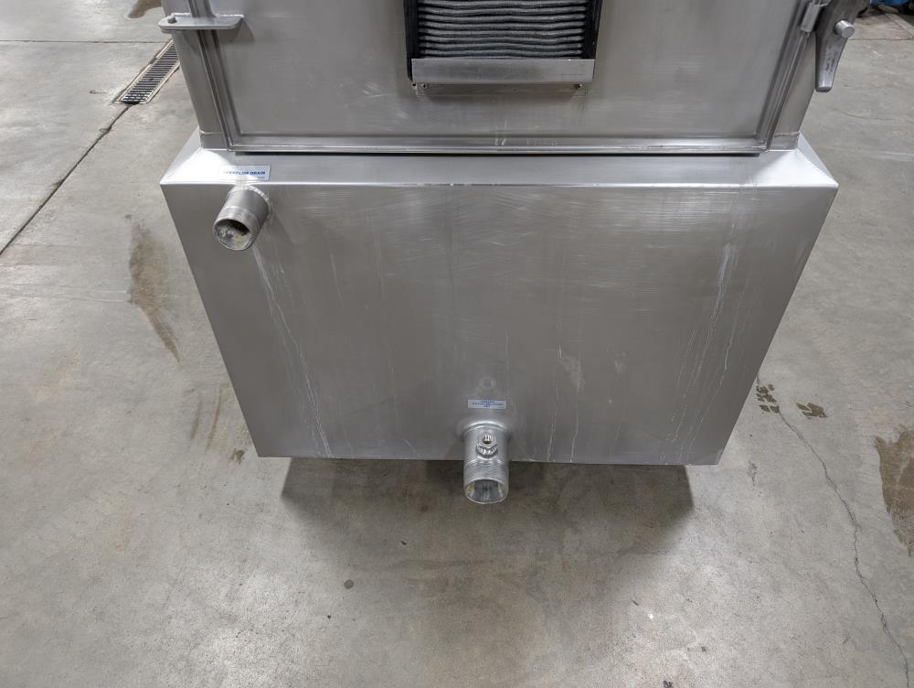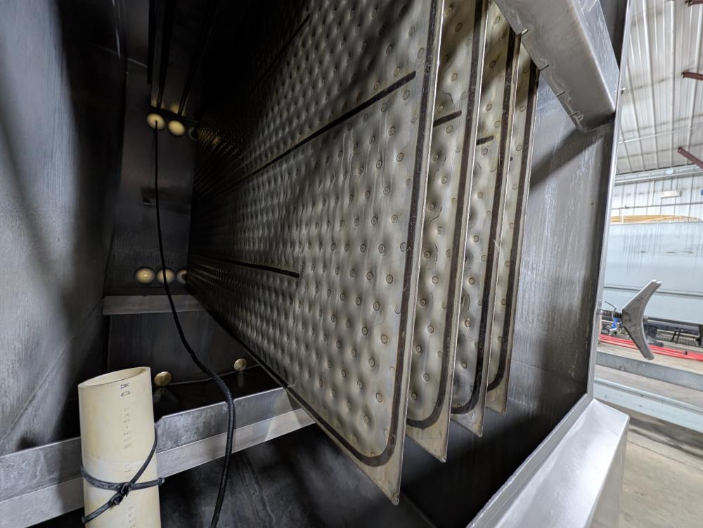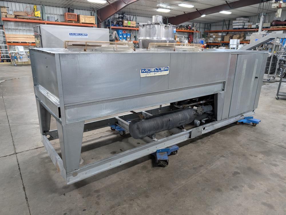 Mueller Falling Film Water Chiller, Model 165 FFC, SN 344025-1, Size: 165 GAL FFC, 4 SS plates, 5 ft. long x 3 ft. tall. 165 gallon capacity. Holding tank 5 ft. long x 35 in. wide x 24 in. deep. 3 in. inlet and outlets. Exhaust fan on top.