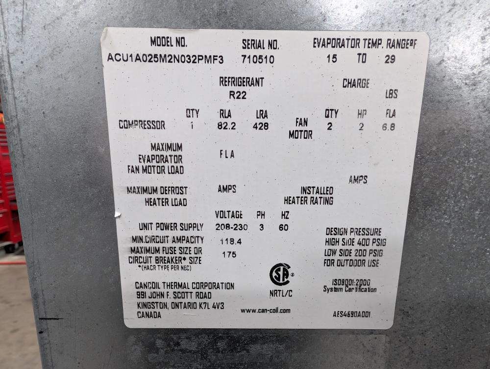 Comes with Cancoil 2-Fan Rooftop Condenser, Model: ACU1A025M2NO32PMF3, SN: 710510, R-407C refrigerant. Electrical requirements: 208-230V, 3 Phase, 60 Hz.