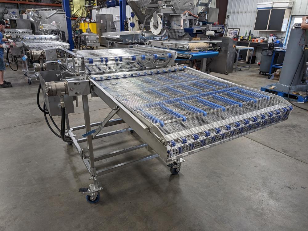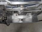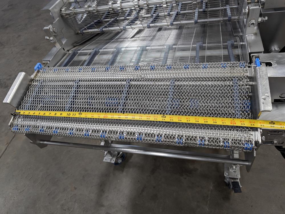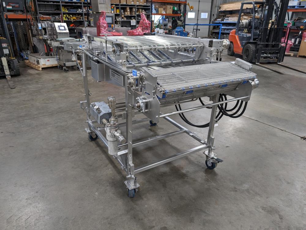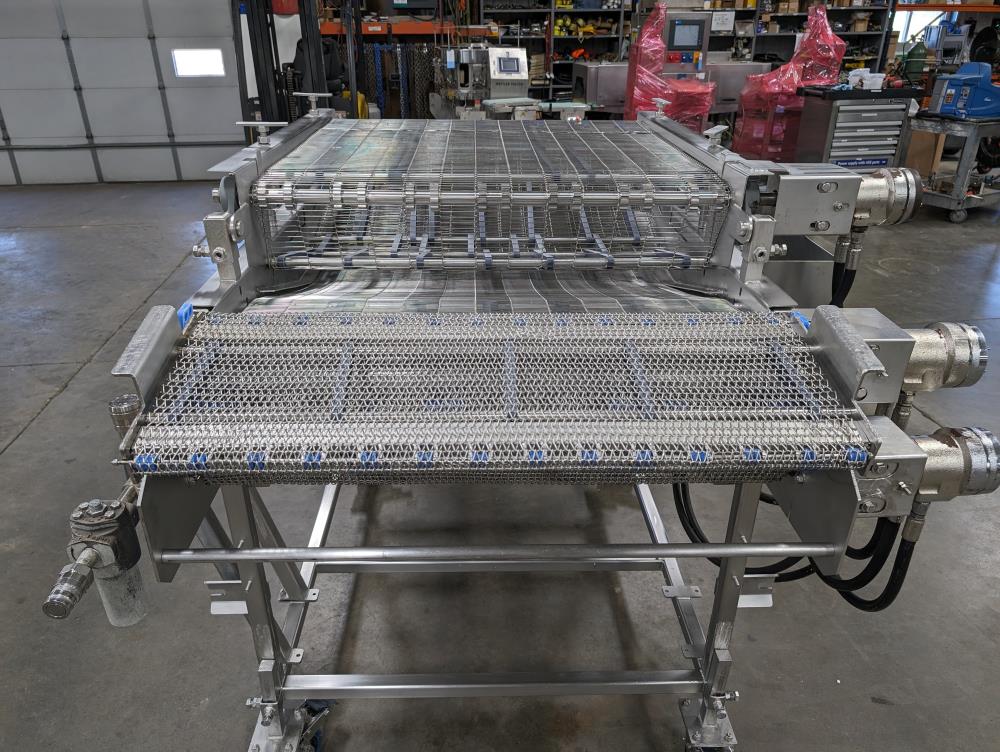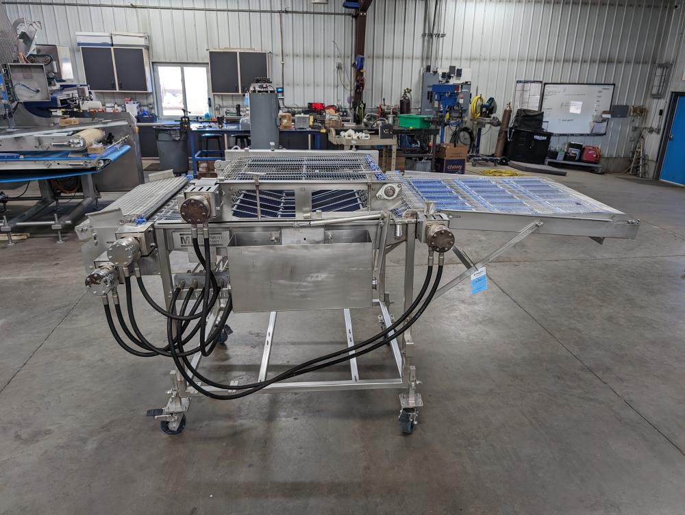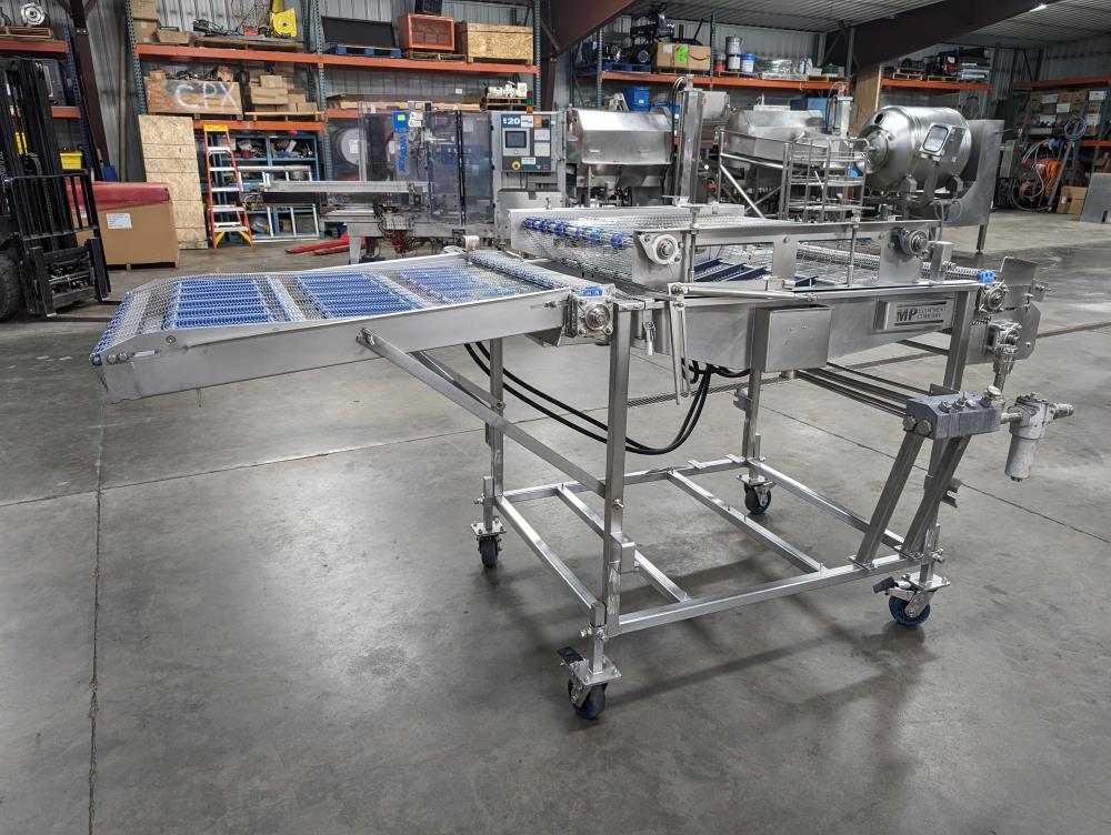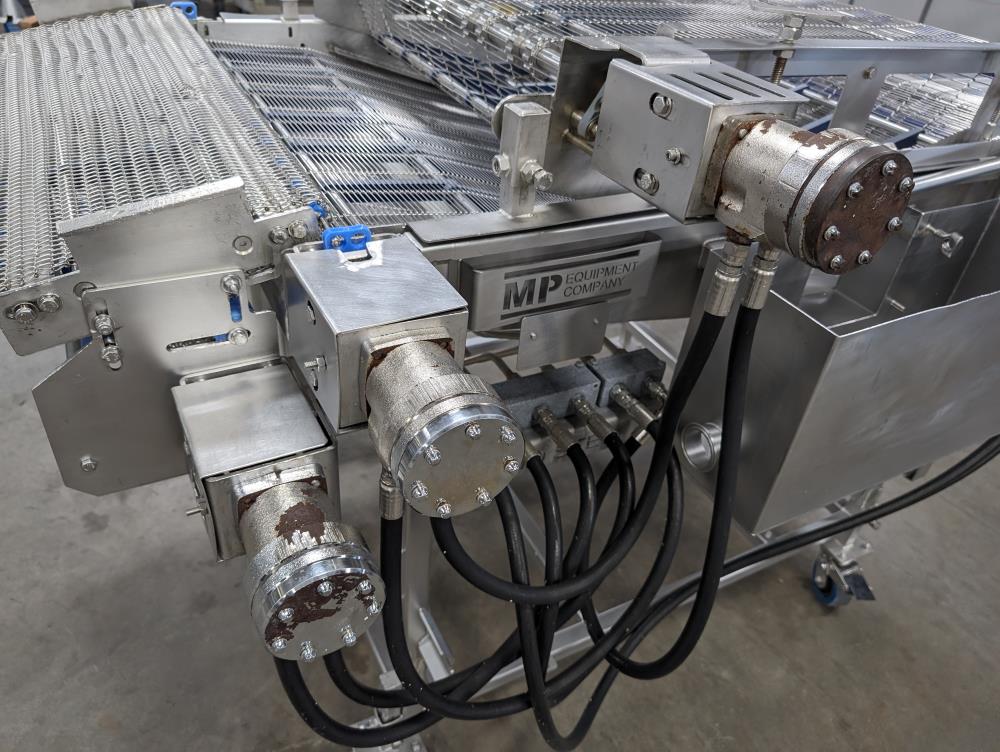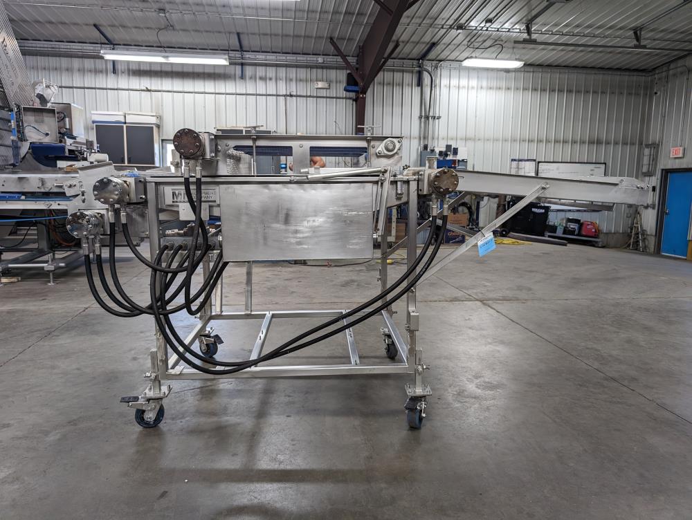 MP Equipment batter submerging machine w/ hold down belt. 34 in. wide SS wire belt. Submerging bed: 55 in. long x 35 in. wide x 8 in. deep. SS batter holding reservoir: 23 in. long x 8 in. wide x 12 in. deep. Infeed conveyor: 13 in. long x 34 in. wide x 42 in. tall, Discharge conveyor: 42 in. long x 34 in. wide x 43 in. tall. Top submerging conveyor: 34 in. long x 34 in. wide (Adjustable height). Hydraulicly driven, Parker quick attach hydraulic couplers. SS frame, adjustable legs, on casters. Overall Dimensions: 108 in. long x 60 in. wide x 53 in. tall.