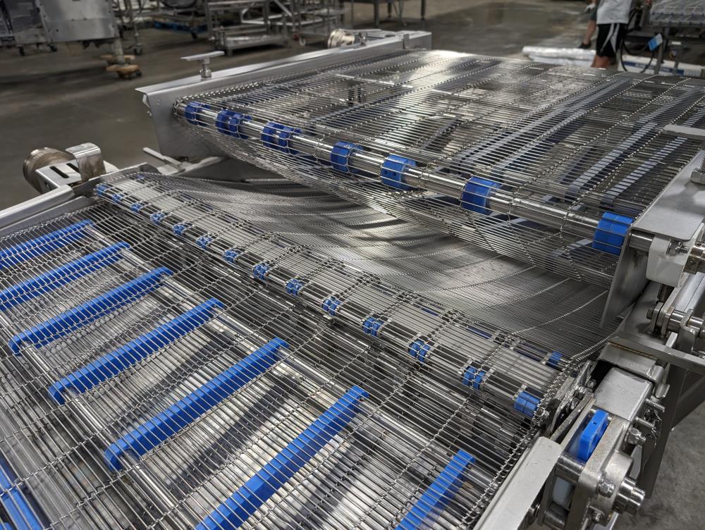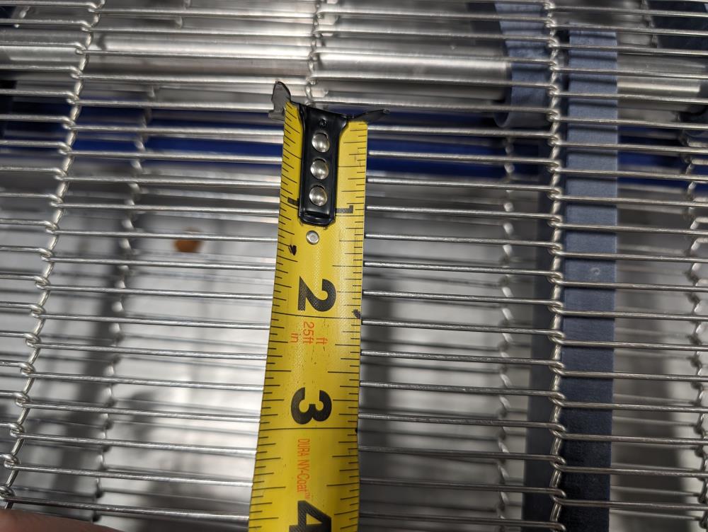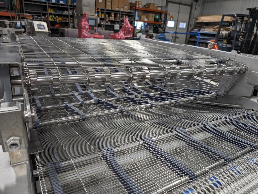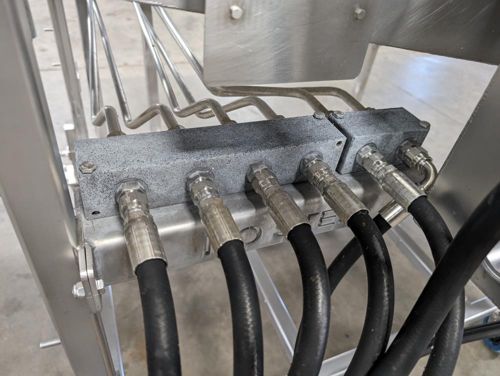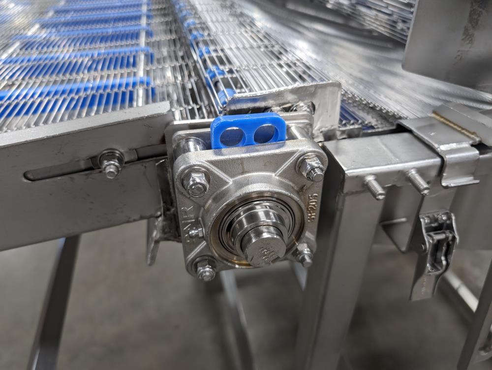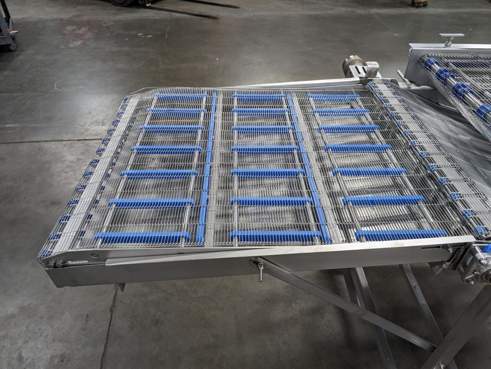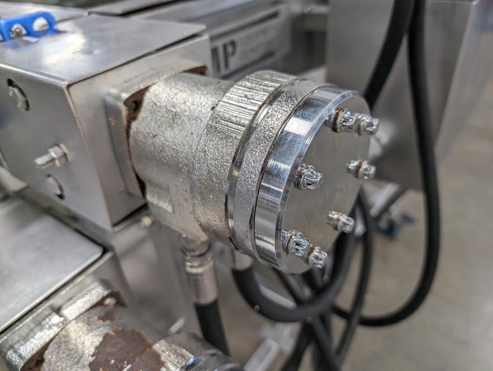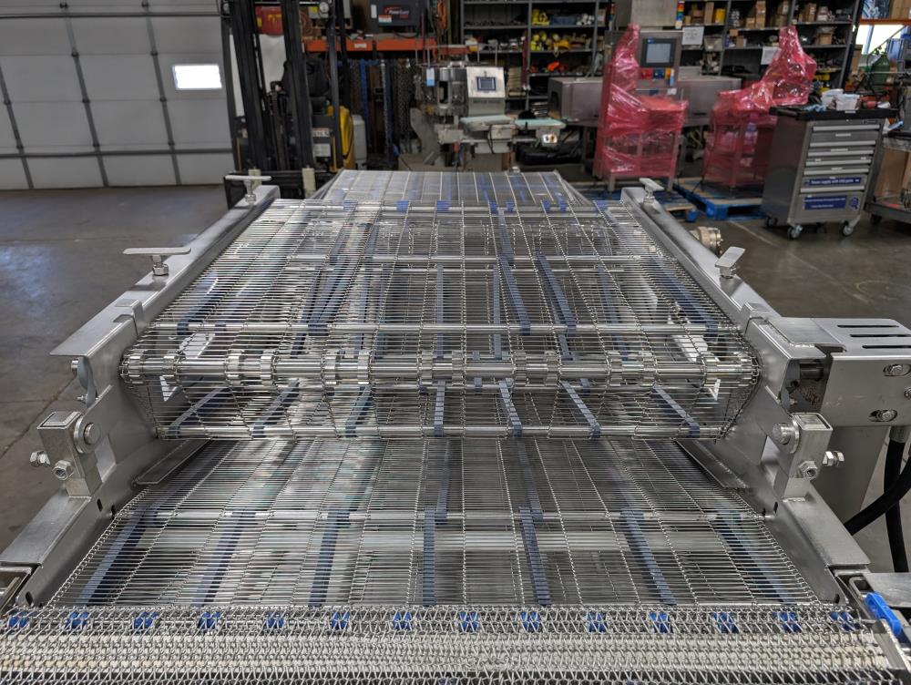 MP Equipment batter submerging machine w/ hold down belt. 34 in. wide SS wire belt. Submerging bed: 55 in. long x 35 in. wide x 8 in. deep. SS batter holding reservoir: 23 in. long x 8 in. wide x 12 in. deep. Infeed conveyor: 13 in. long x 34 in. wide x 42 in. tall, Discharge conveyor: 42 in. long x 34 in. wide x 43 in. tall. Top submerging conveyor: 34 in. long x 34 in. wide (Adjustable height). Hydraulicly driven, Parker quick attach hydraulic couplers. SS frame, adjustable legs, on casters. Overall Dimensions: 108 in. long x 60 in. wide x 53 in. tall.