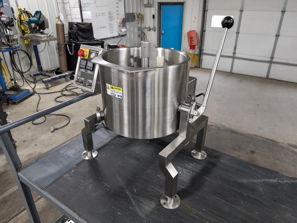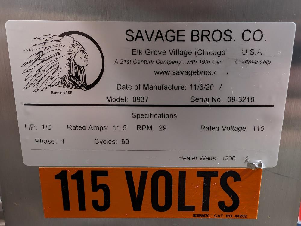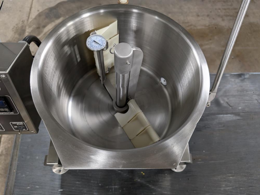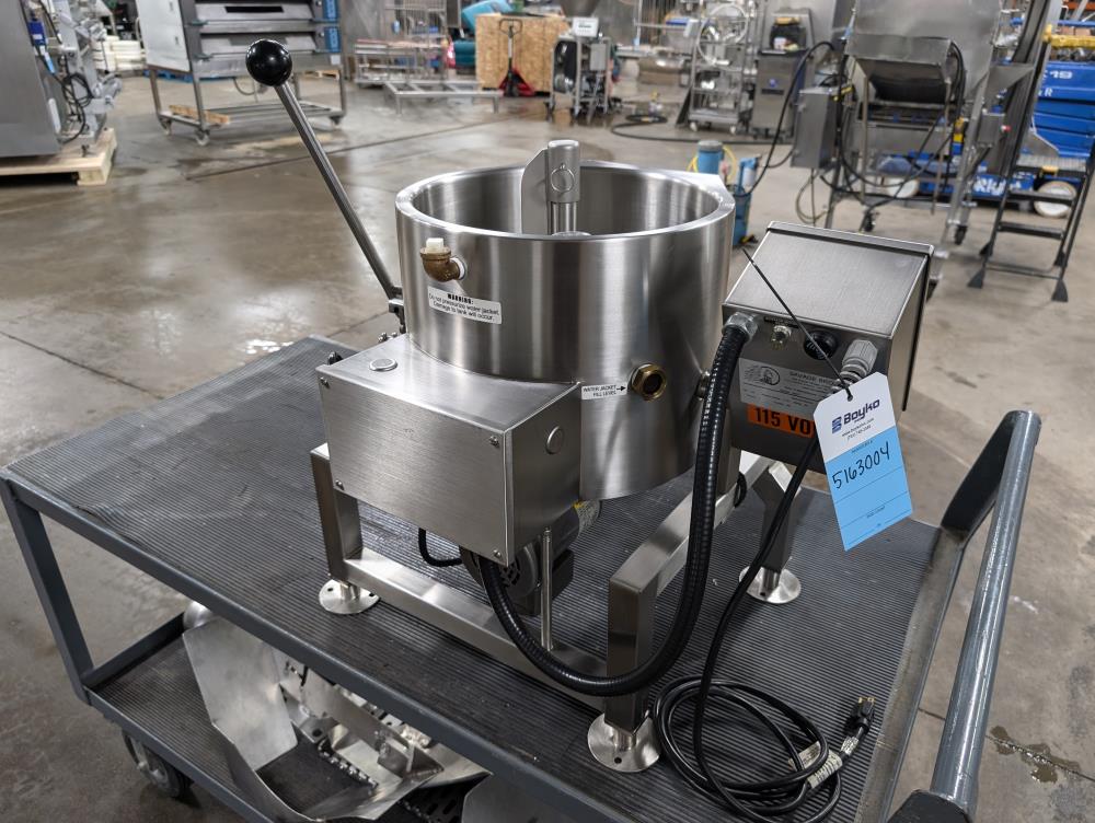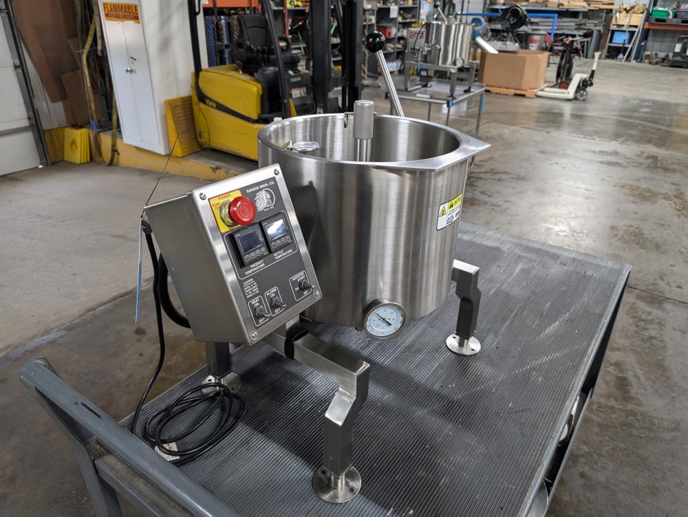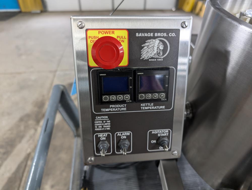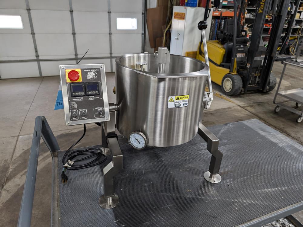 2017 Savage Bros SS electric cooker mixer. Model 0937, SN 09-3210. SS tilt kettle, 14 in. diameter x 10 in. deep. Max capacity calculated at 6.5 gallons to the brim. Removable agitator with bottom and full side scrape, spring loaded nylon scrapers. 27.5 in. tall infeed height. Manual tilt with integrated pouring lip, 6 in. clearance at 90 degrees tilt, 3.75 in. clearance at full tilt. Hot water jacketed kettle with immersion heater. Digital temperature control for product and kettle. Controls include on/off for power, heat, alarm, and agitation. Analog temperature gauge in jacket and removable analogue thermometer on the agitator. All SS construction. Electrical requirements 115-volt, 1 phase, 60 hz, 11.5 amp.