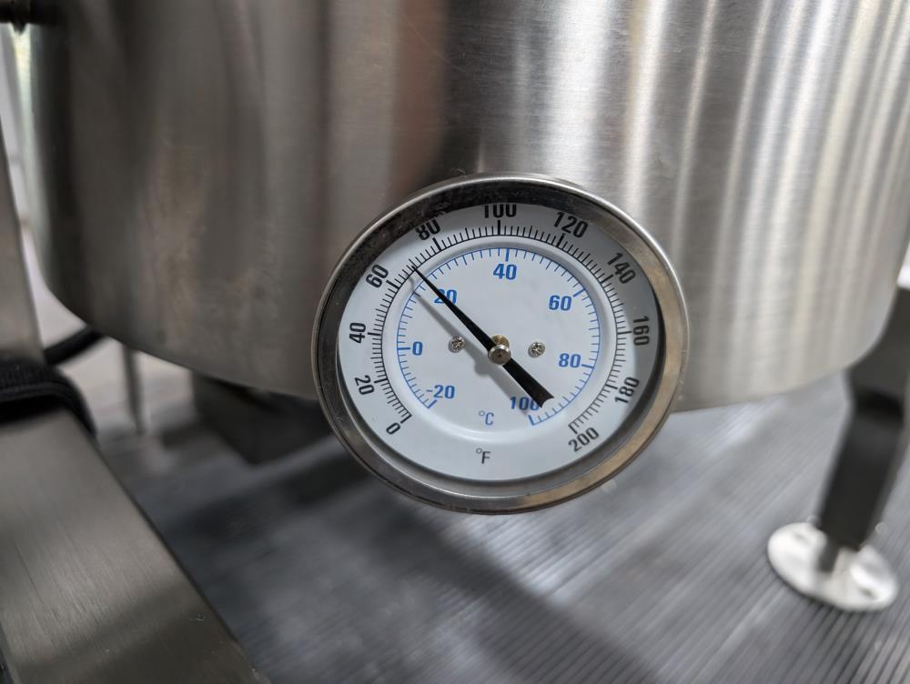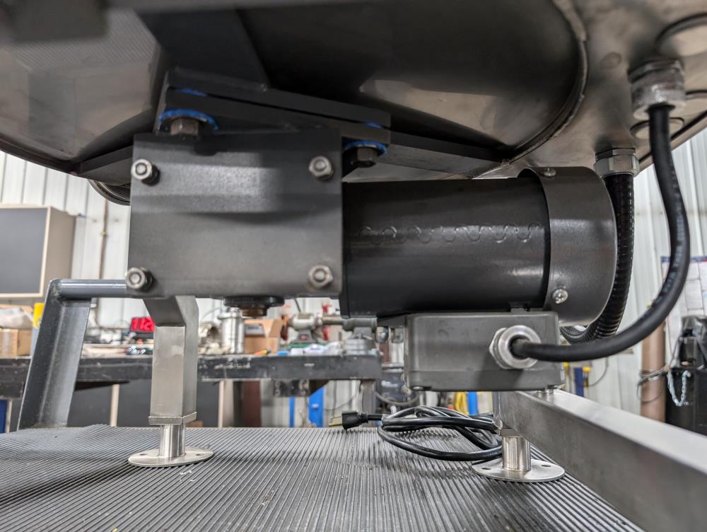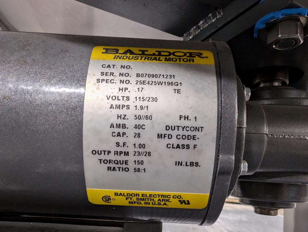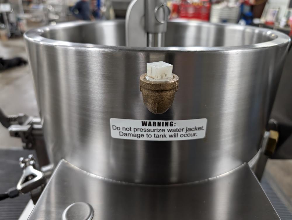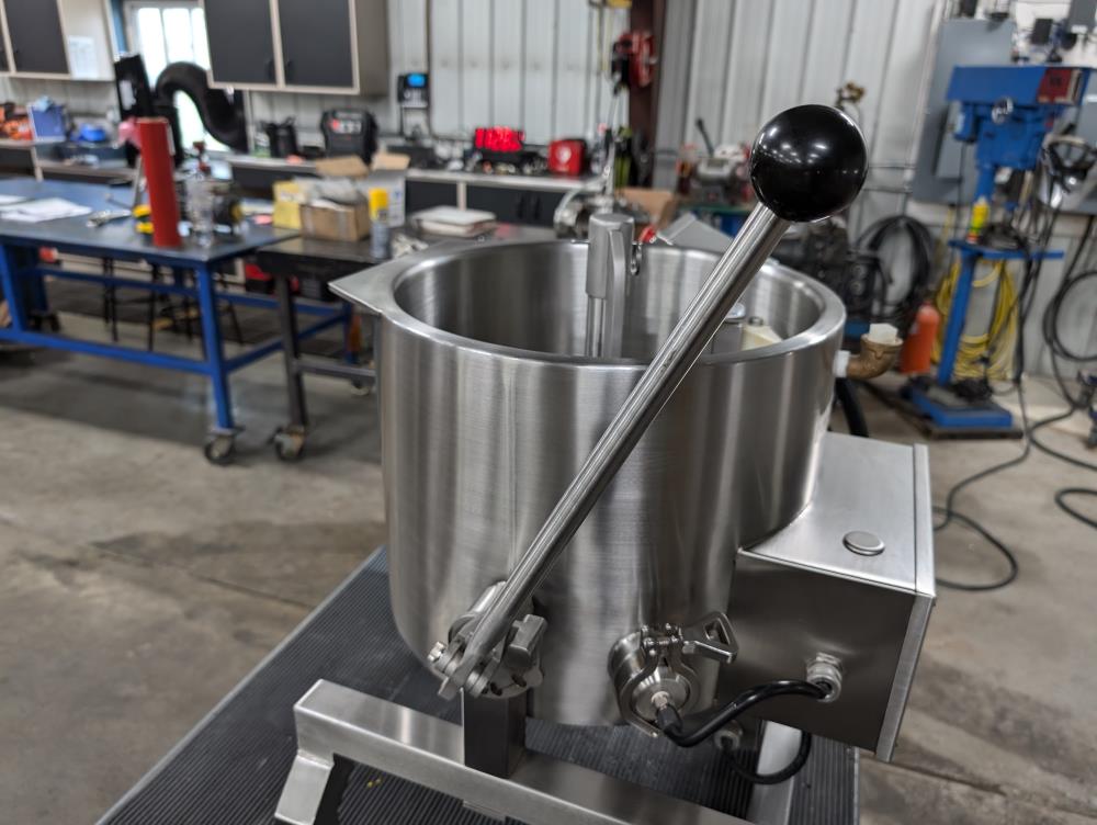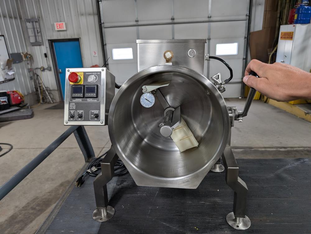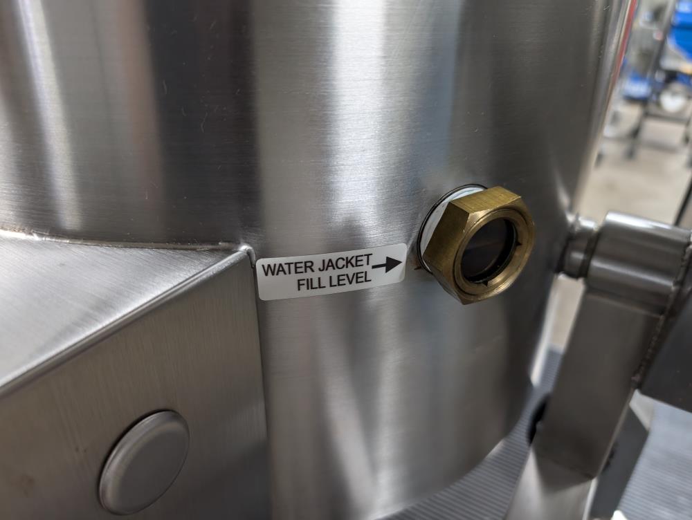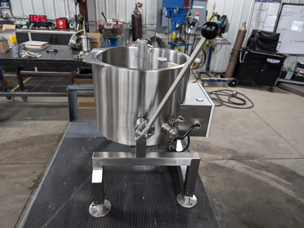 2017 Savage Bros SS electric cooker mixer. Model 0937, SN 09-3210. SS tilt kettle, 14 in. diameter x 10 in. deep. Max capacity calculated at 6.5 gallons to the brim. Removable agitator with bottom and full side scrape, spring loaded nylon scrapers. 27.5 in. tall infeed height. Manual tilt with integrated pouring lip, 6 in. clearance at 90 degrees tilt, 3.75 in. clearance at full tilt. Hot water jacketed kettle with immersion heater. Digital temperature control for product and kettle. Controls include on/off for power, heat, alarm, and agitation. Analog temperature gauge in jacket and removable analogue thermometer on the agitator. All SS construction. Electrical requirements 115-volt, 1 phase, 60 hz, 11.5 amp.