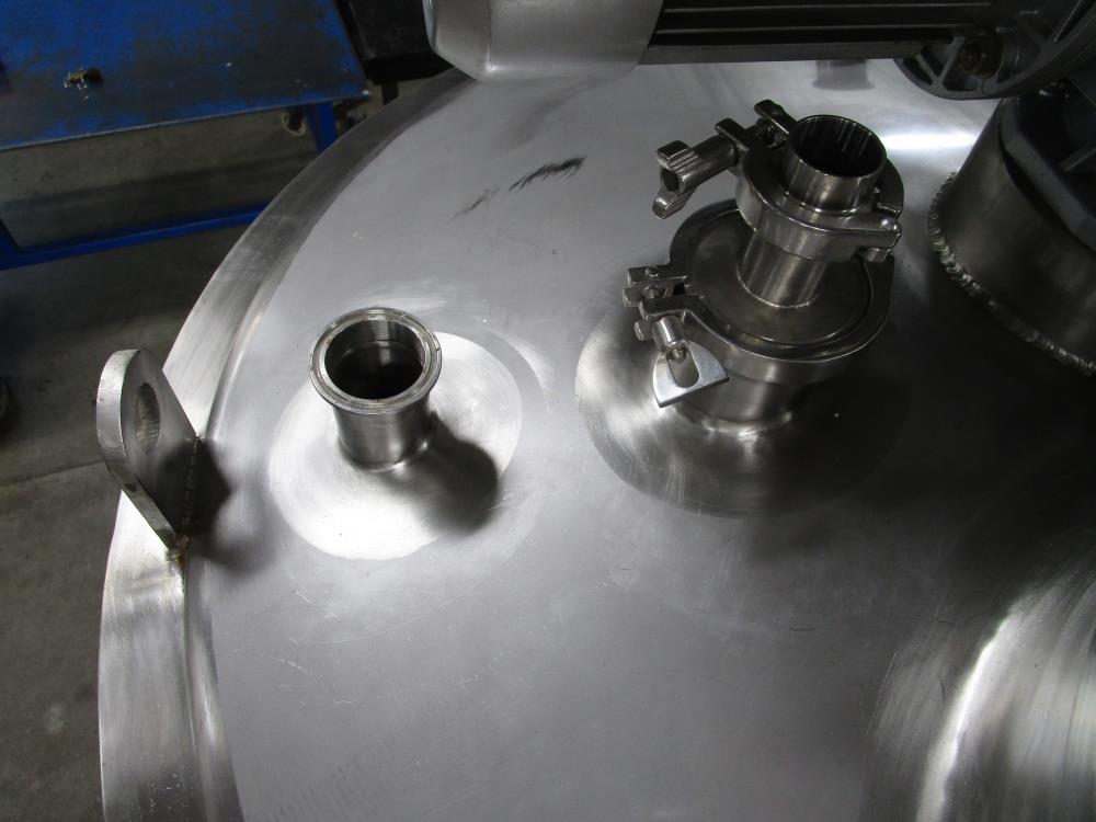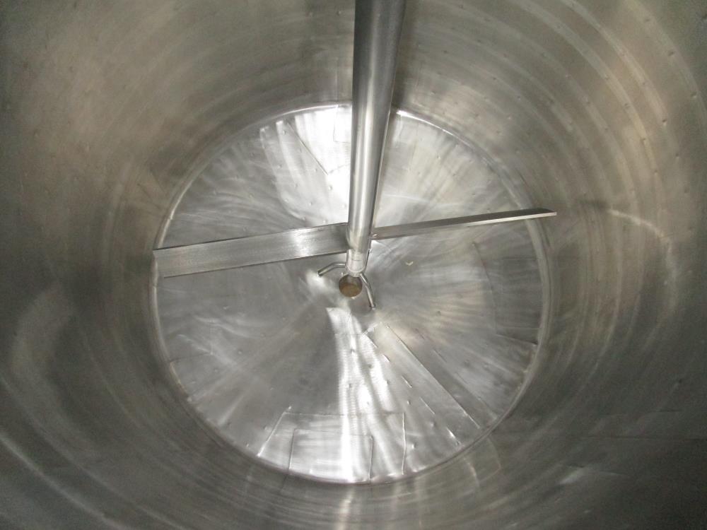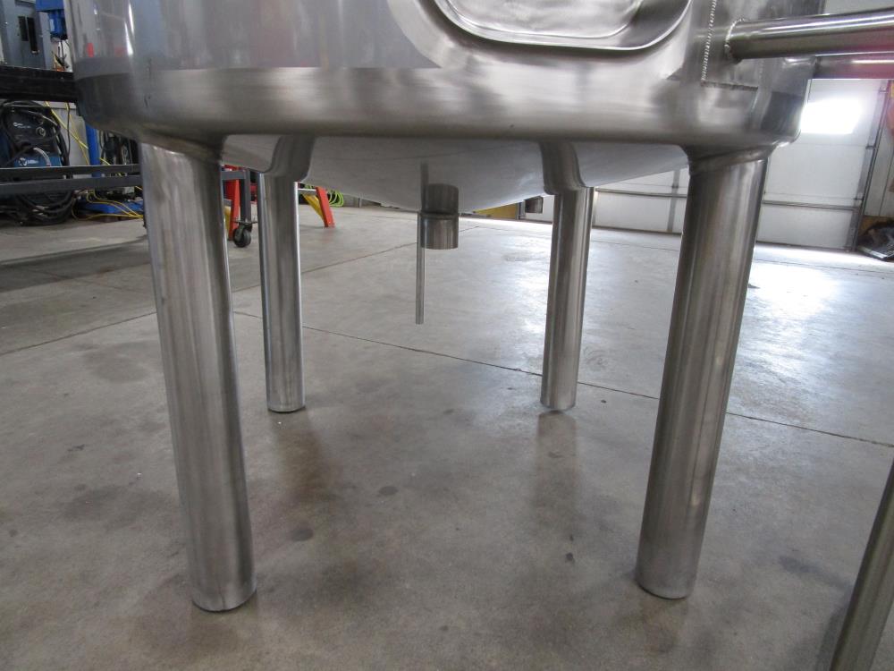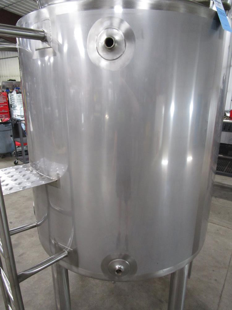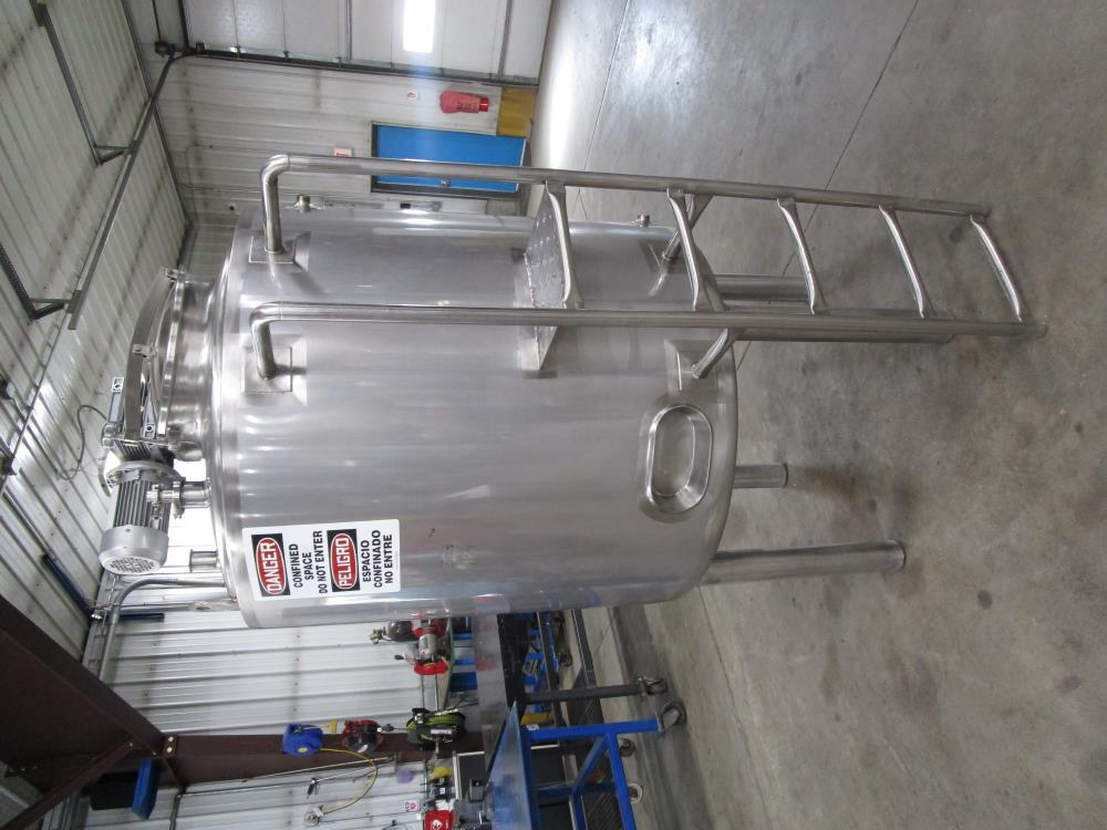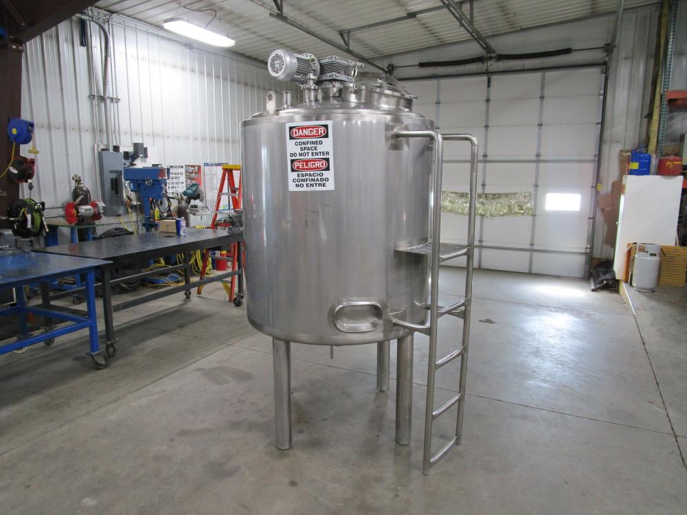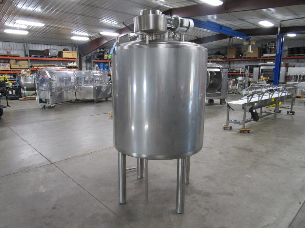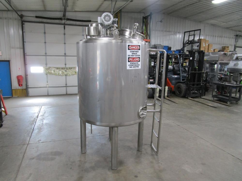 Unused SS jacketed mix tank approximately 250 gallons. Inside dimensions 40 in. diameter x 48 in. tall. Top lid 16 in. diameter. (2) Liquid ports 3 in. diameter sanitary clamp. (1) Liquid port 2 in. diameter sanitary clamp fitting. (1) Breather. Top agitation with 1.1 kw motor, 480-volt. Sloped bottom, center discharge, 3 in. diameter discharge, straight pipe, 20 in. tall clearance. (2) side and (2) bottom jacket ports, 1 in. diameter. SS legs, (2) picking eyes, ladder.