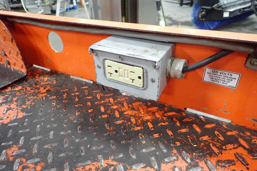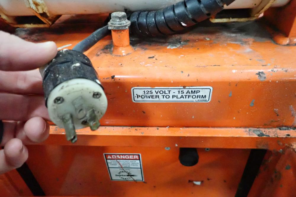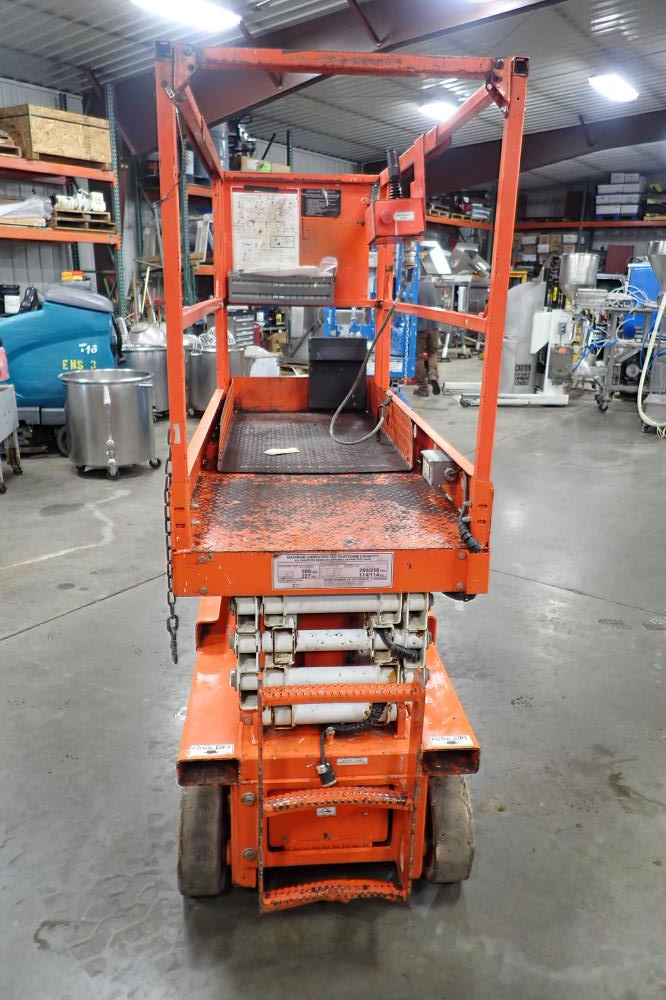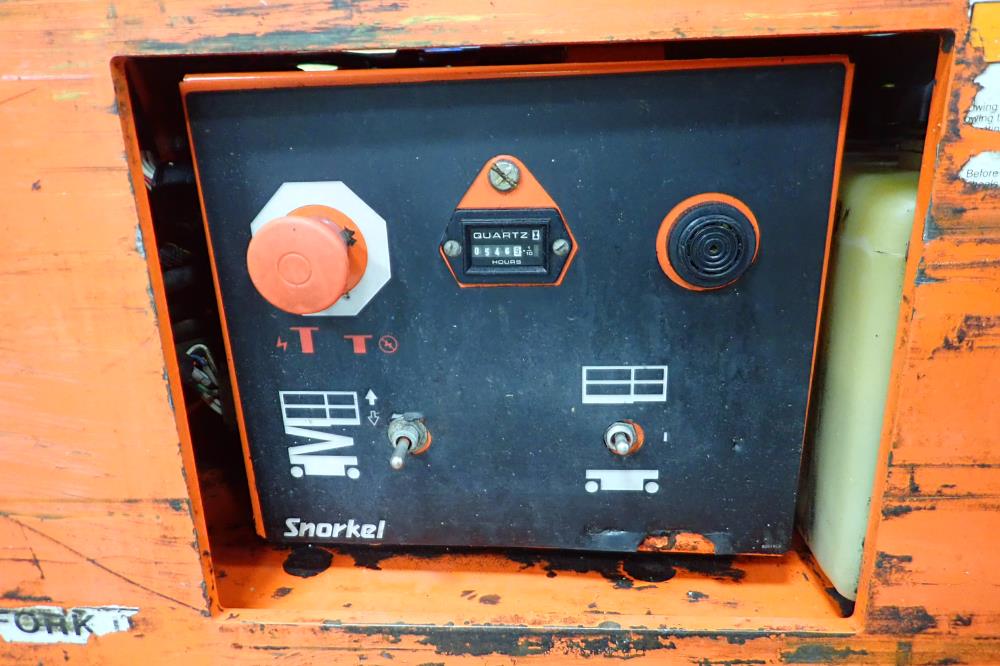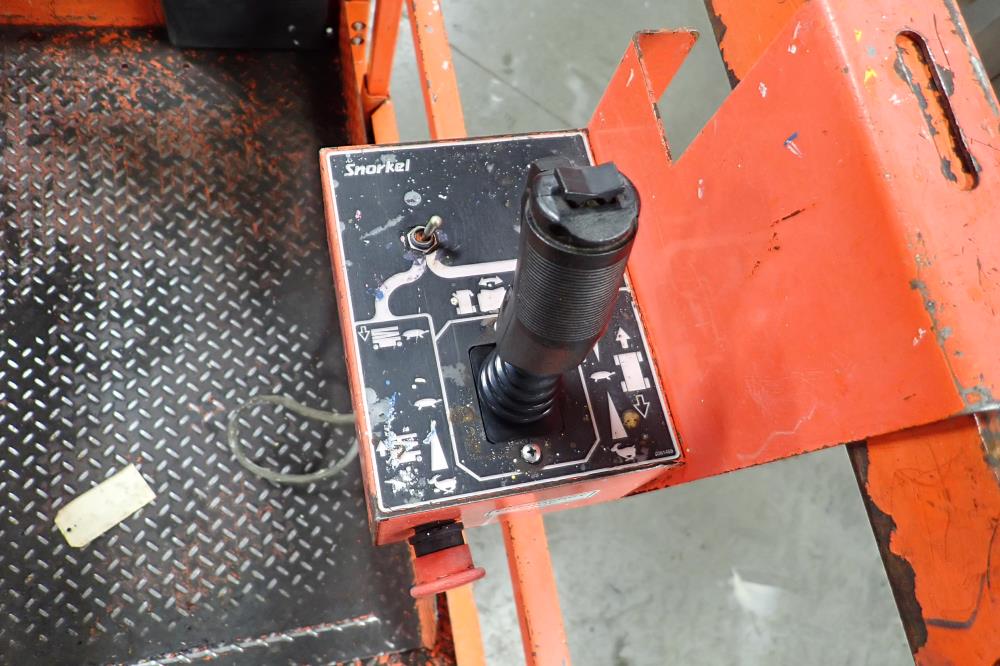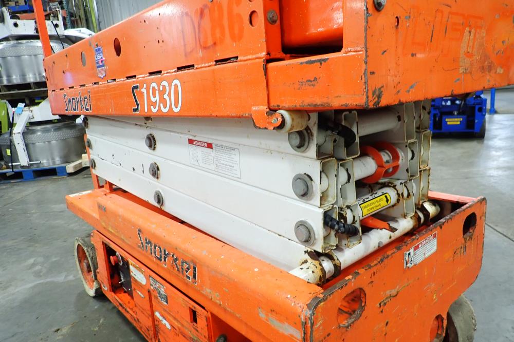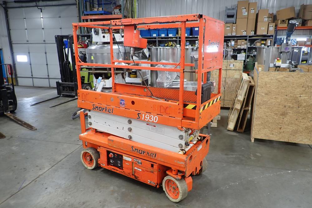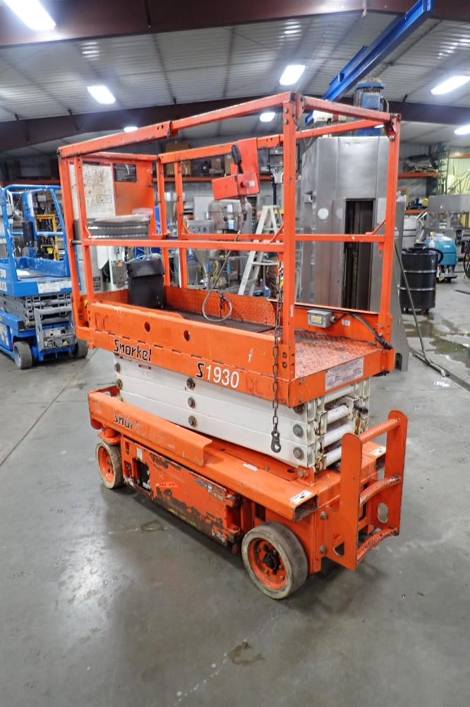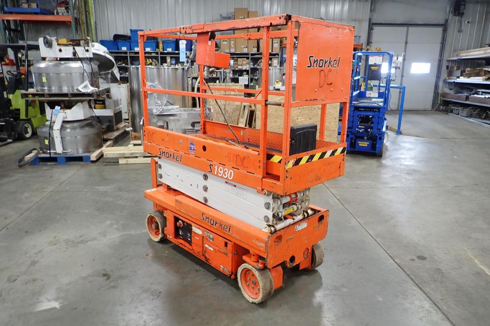 Snorkel S1930 scissor lift, Model S1930, SN JU04198. 500 lb. capacity. Maximum platform height: 19 ft. Platform size 29 in. wide x 64 in. long retracted, 98 in. long extended. 24-volt battery system, with 115-volt on board charger. Slide out extension deck. Ground controls. Hour meter reads 547 hours. Fork pockets on end.