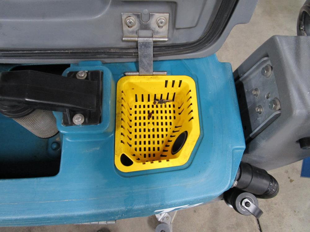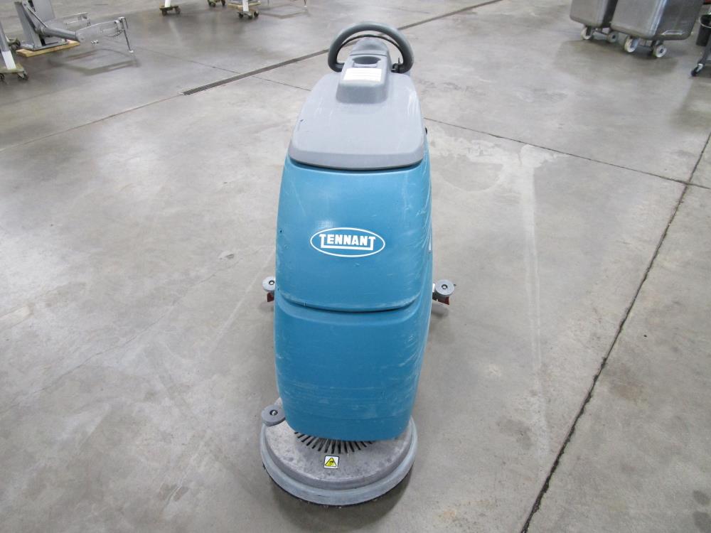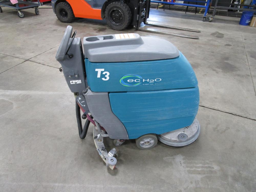 Tennant T3 walk-behind floor scrubber. Model T3, SN 900400-10537366. Cleaning path 17 in. Battery system 24-volt with onboard 120-volt charger. Battery indicator light. Clean water tank capacity 10.5 gallons. Recovery tank capacity 15 gallons. Propelled by brush pad.