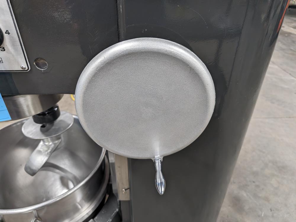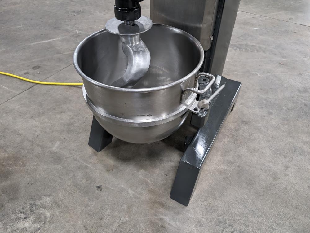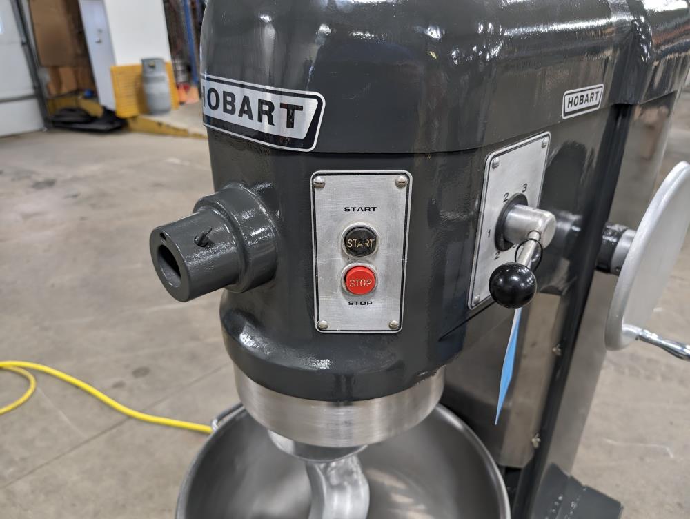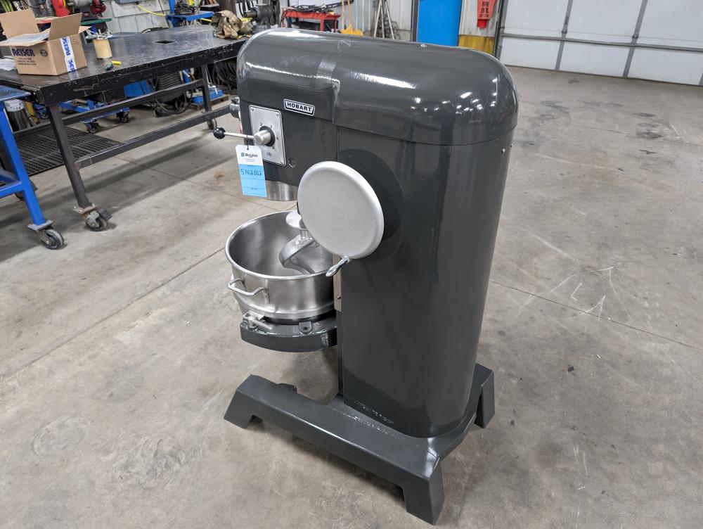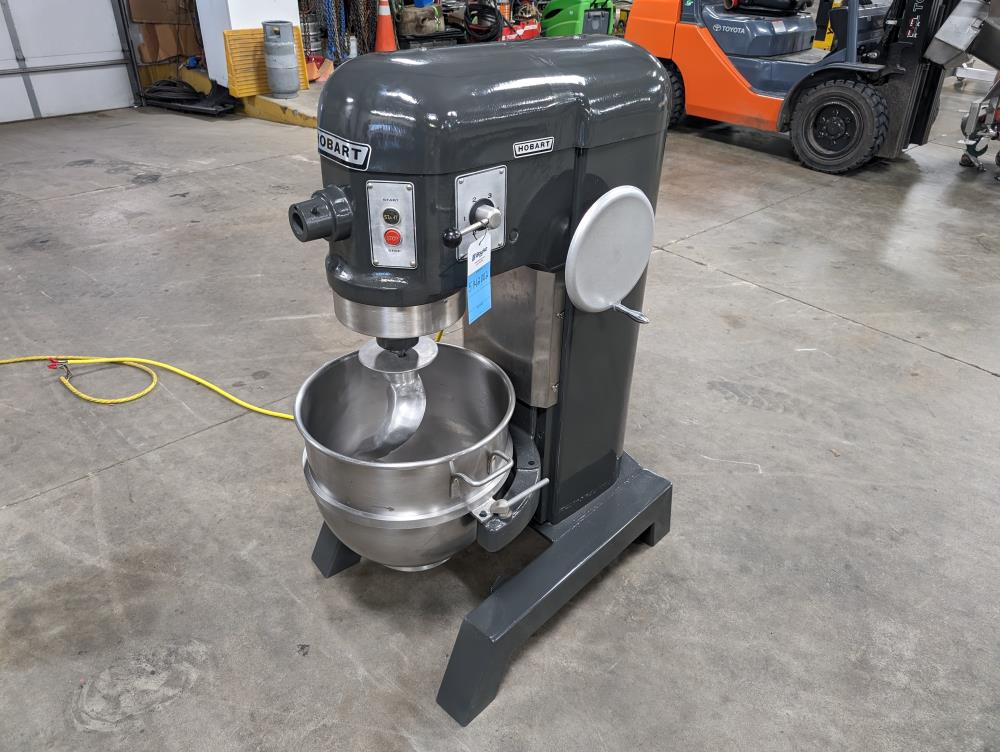 Hobart 60-quart planetary mixer. Model H-600, SN 11-154-579. 60-quart capacity. Four fixed speeds. Manual bowl lift. Electrical requirement 200-volt, 3 phase, 60 hz.