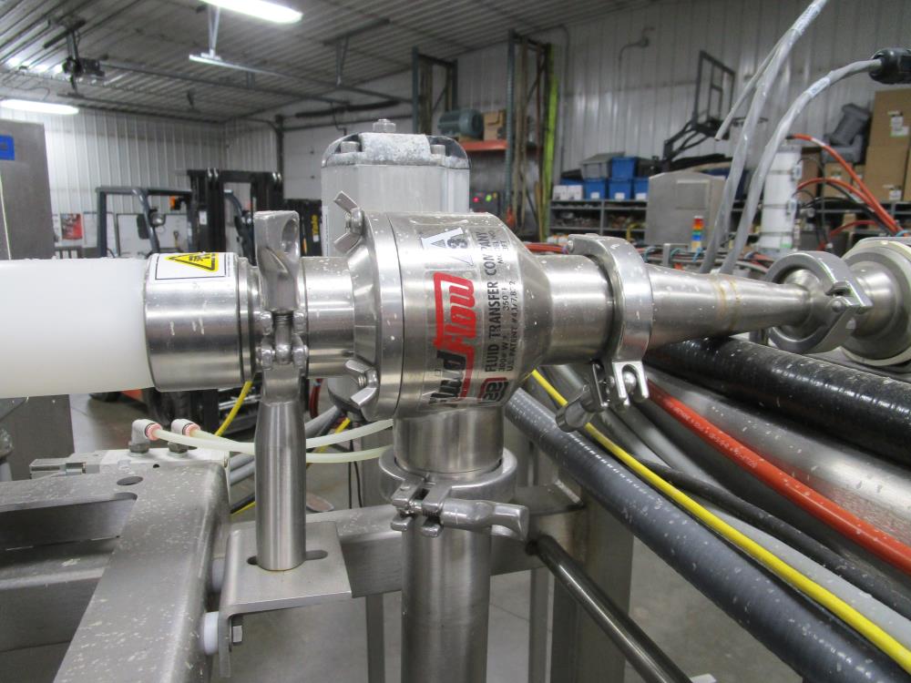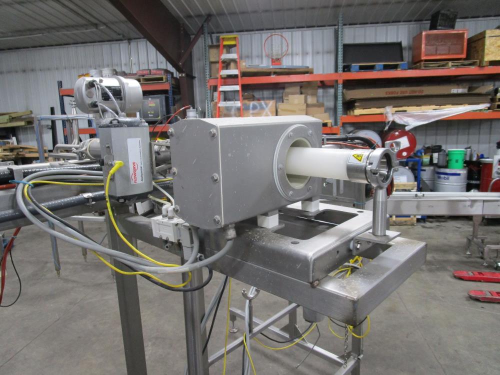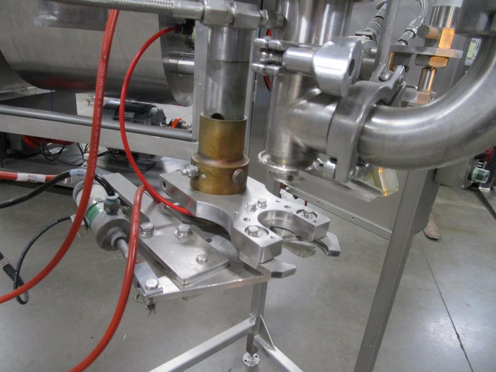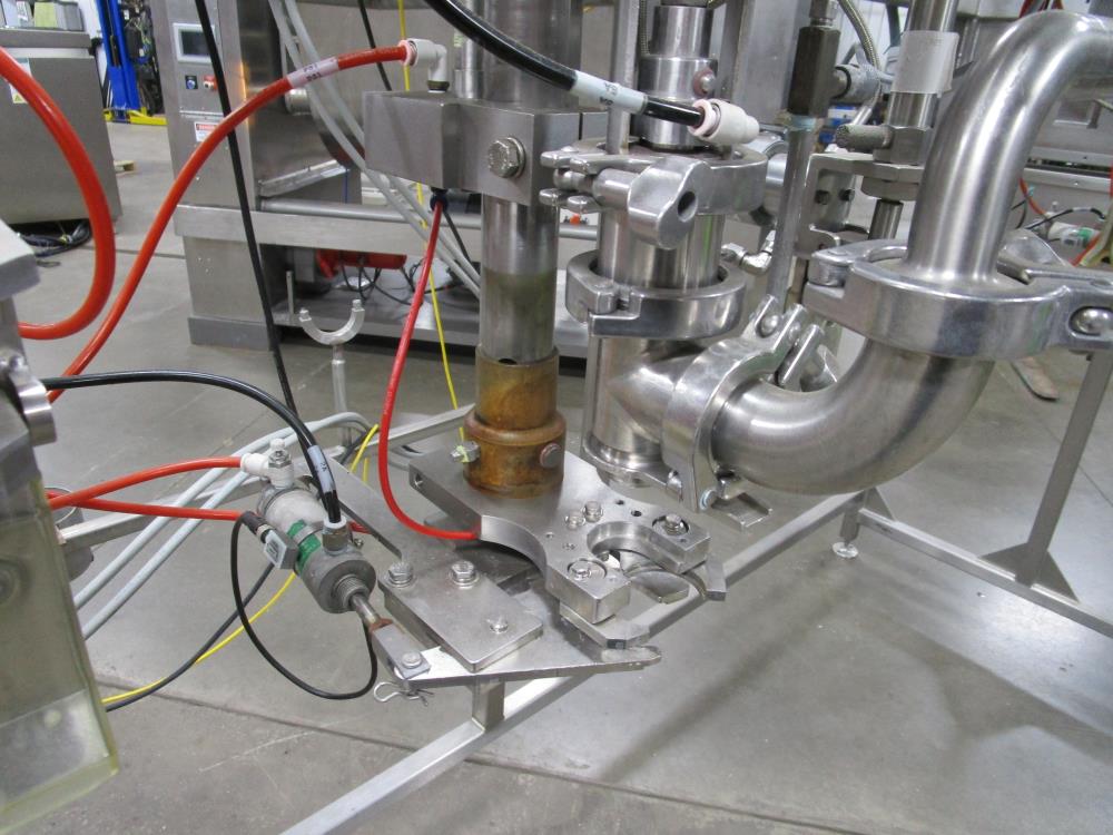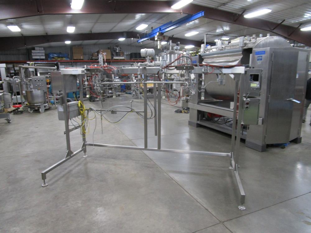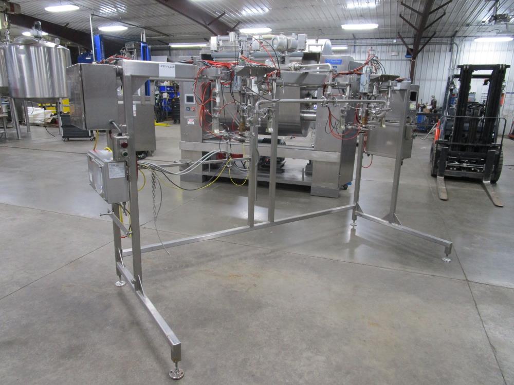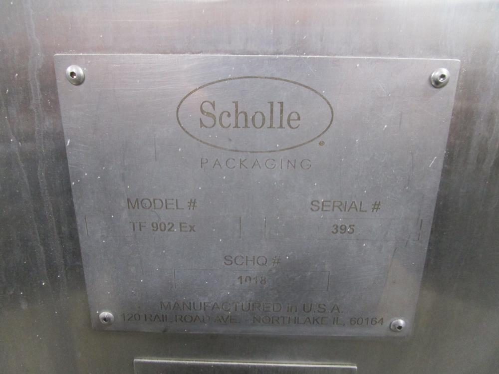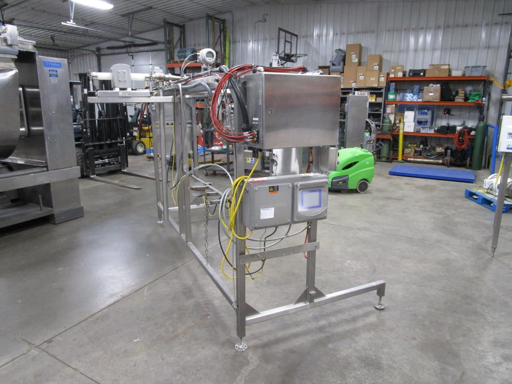 Scholle 2 Station Bag Filling System, Model: TF902EX, SN: 395. 1.5 in. dia. bag holders. Pneumatic bag clamps 25 in. wide (each station). Missing PLC and HMI. Comes w/ Endress Hauser digital flow meter and Mettler Toledo Flo-thru Metal Detector, 2 in. dia. tube, 4 in. dia. aperture. SN: 116652. Stainless Steel SPX plate heat exchanger skid, vacuum pump skid w/ 2014 SPX 064U2 PD pump and tube heat exchanger, SS construction w/ control panel.