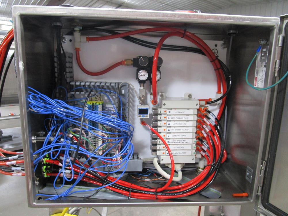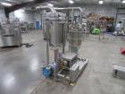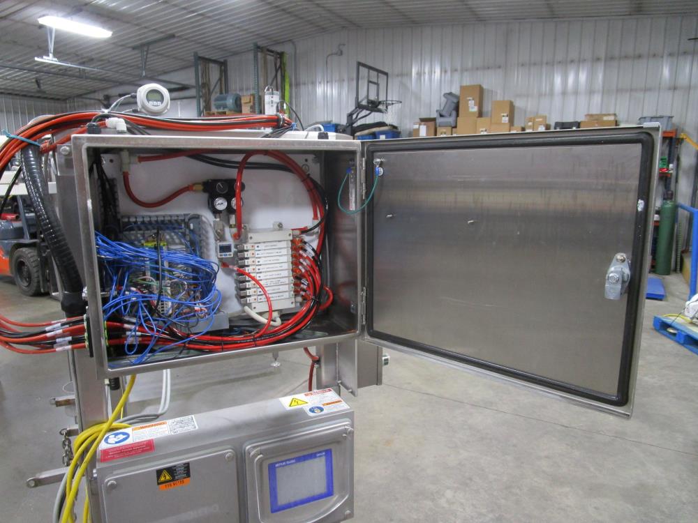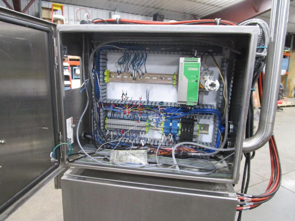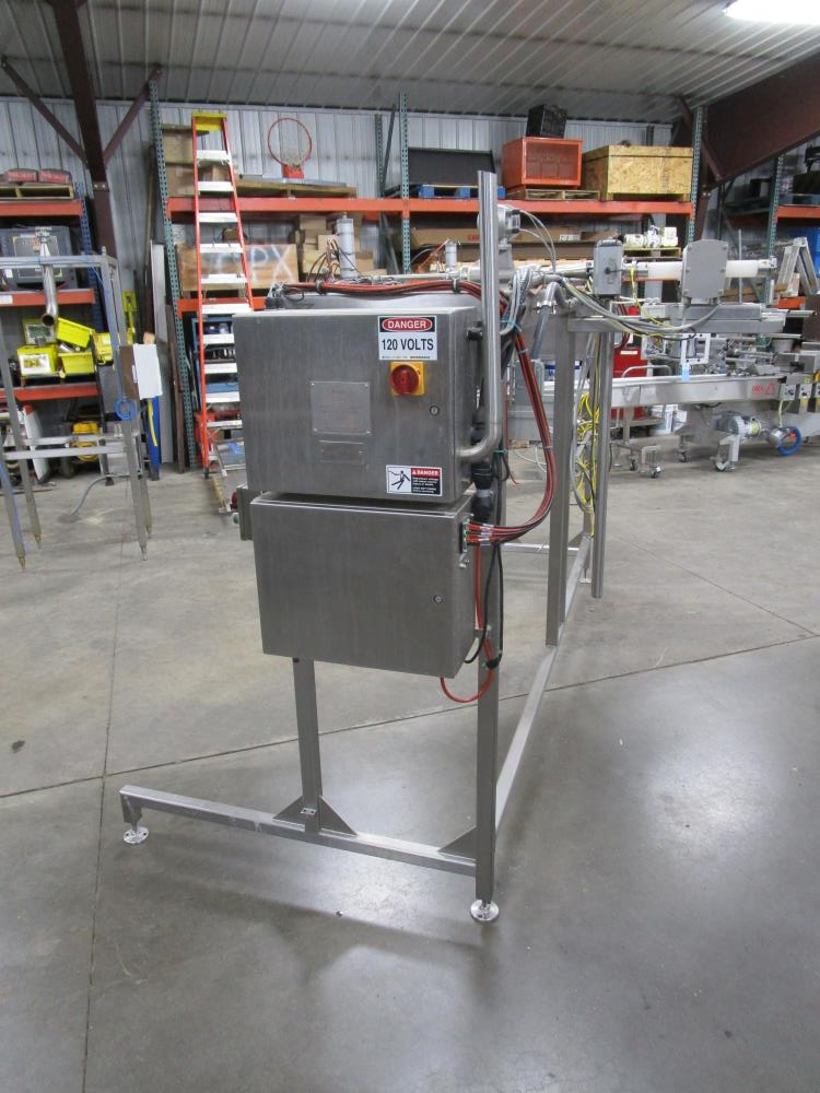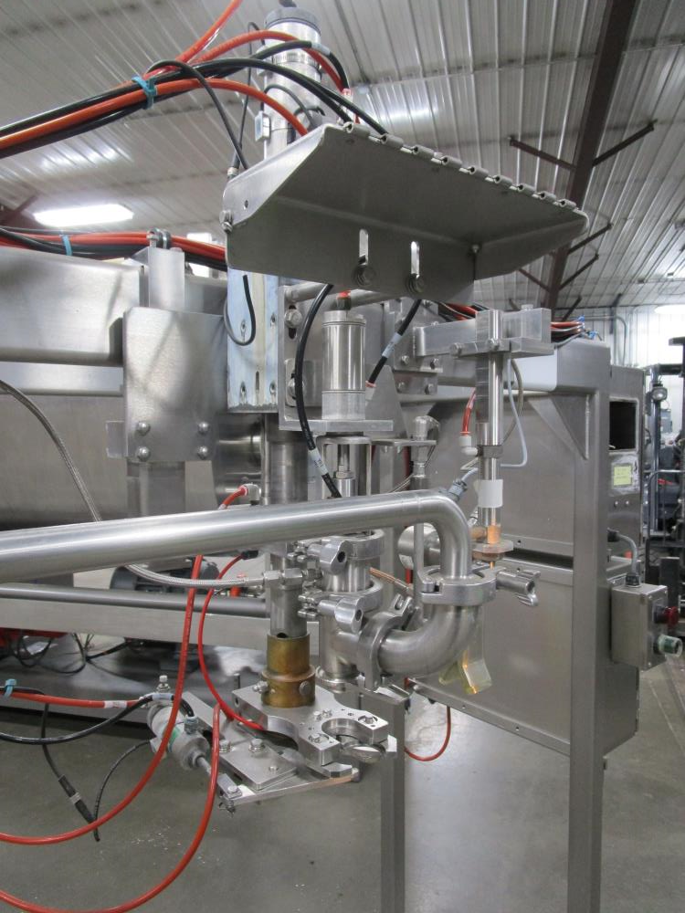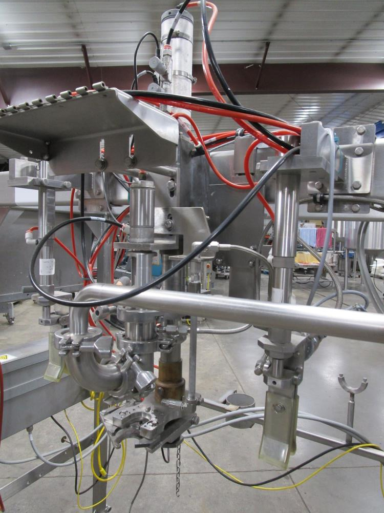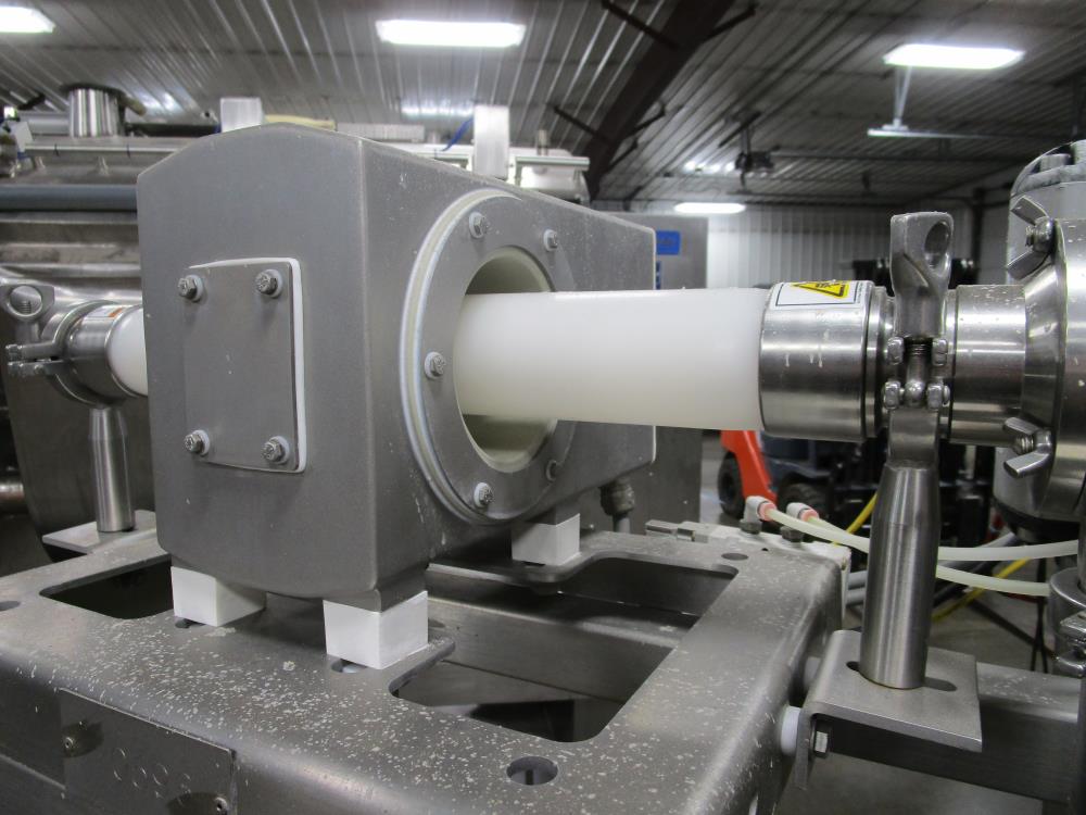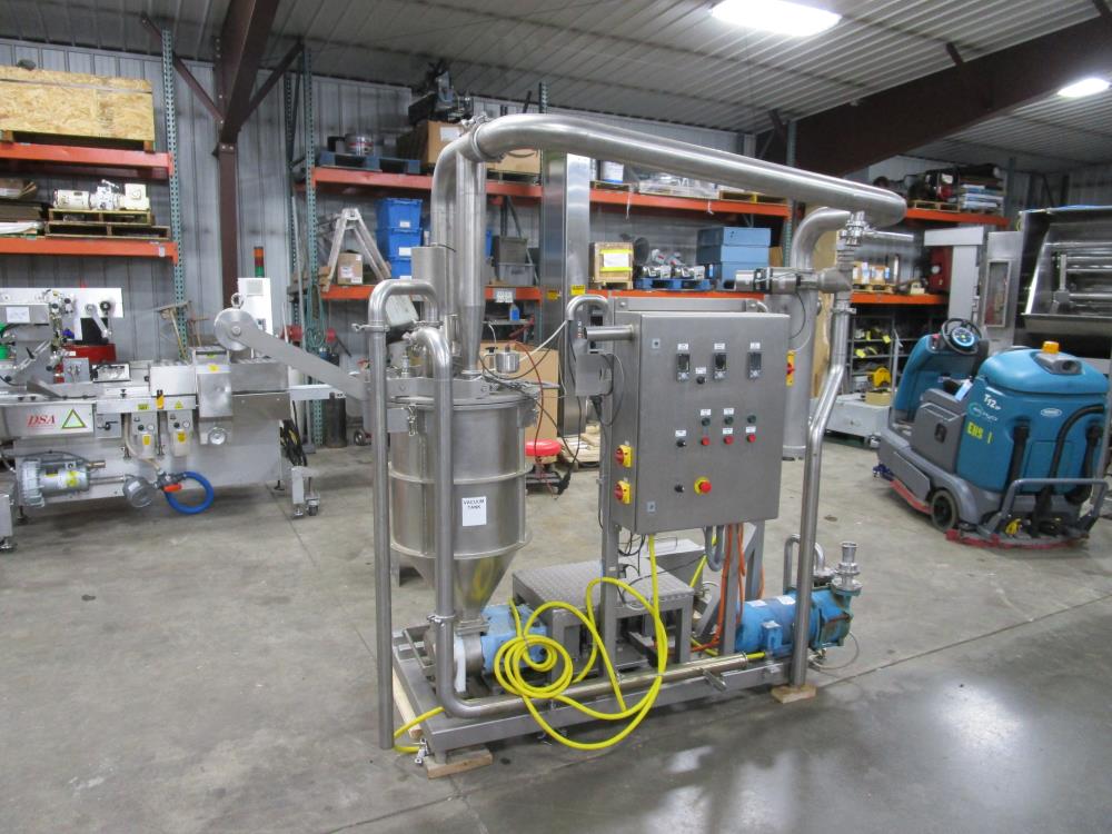Scholle 2 Station Bag Filling System, Model: TF902EX, SN: 395. 1.5 in. dia. bag holders. Pneumatic bag clamps 25 in. wide (each station). Missing PLC and HMI. Comes w/ Endress Hauser digital flow meter and Mettler Toledo Flo-thru Metal Detector, 2 in. dia. tube, 4 in. dia. aperture. SN: 116652. Stainless Steel SPX plate heat exchanger skid, vacuum pump skid w/ 2014 SPX 064U2 PD pump and tube heat exchanger, SS construction w/ control panel.