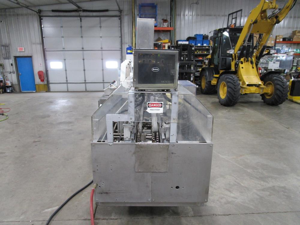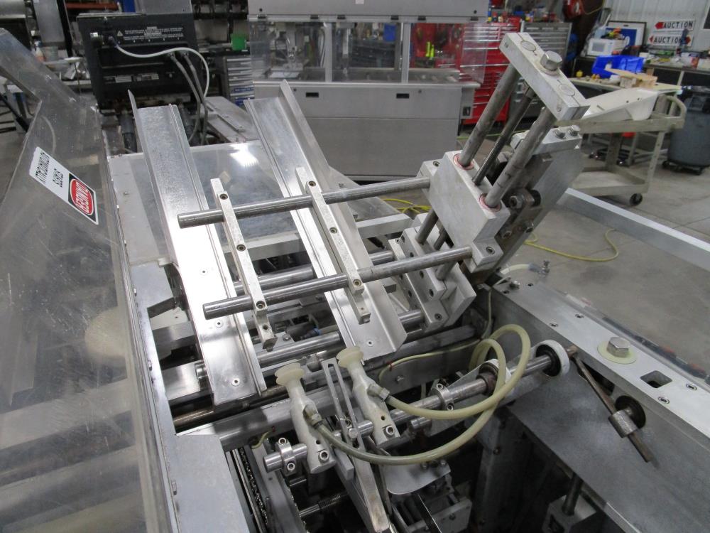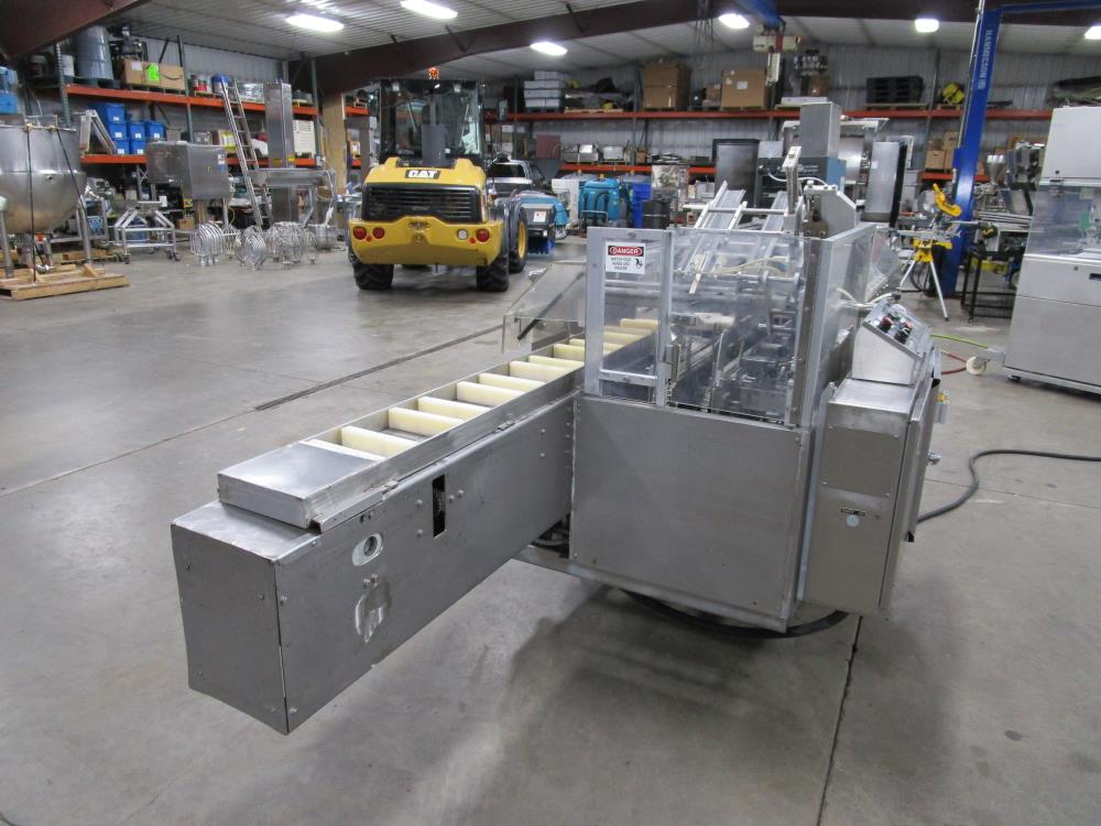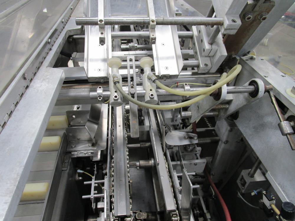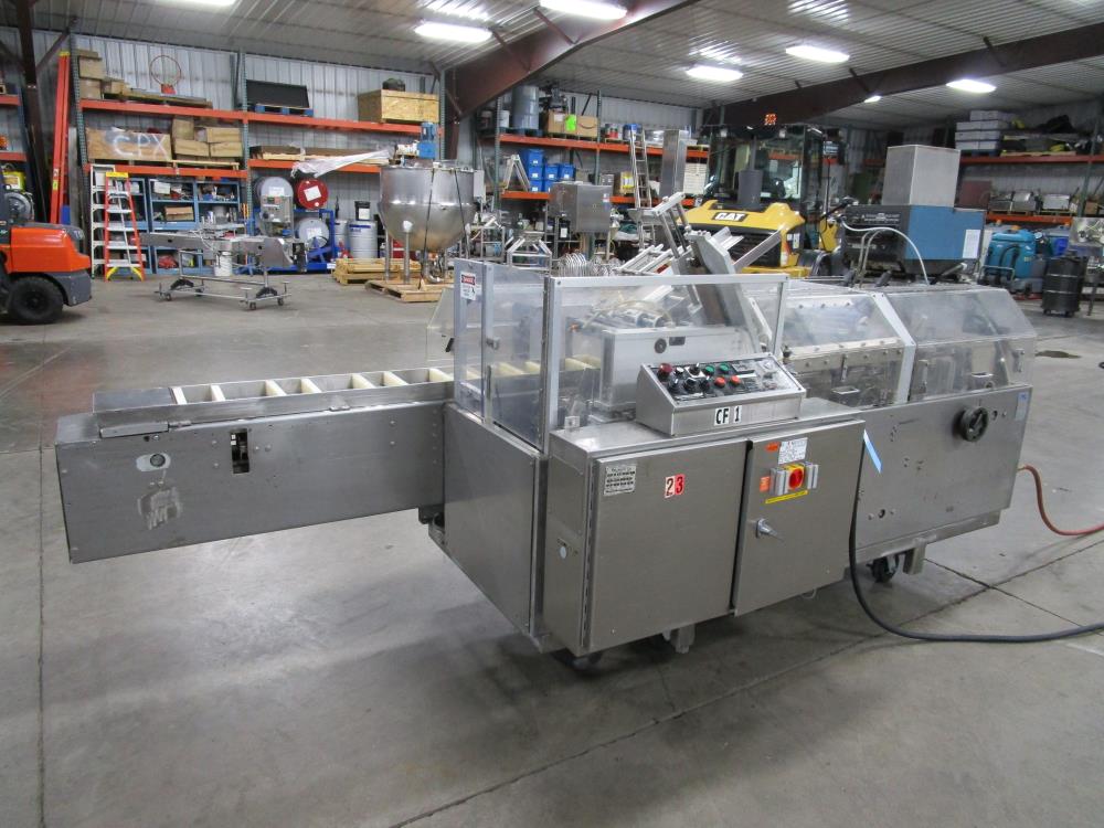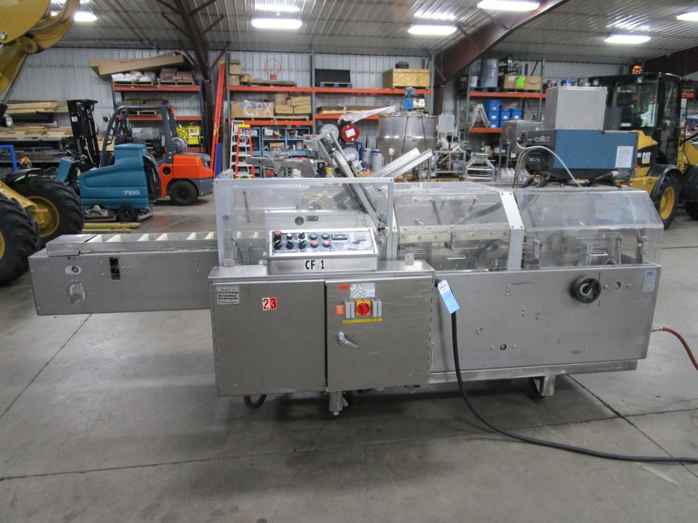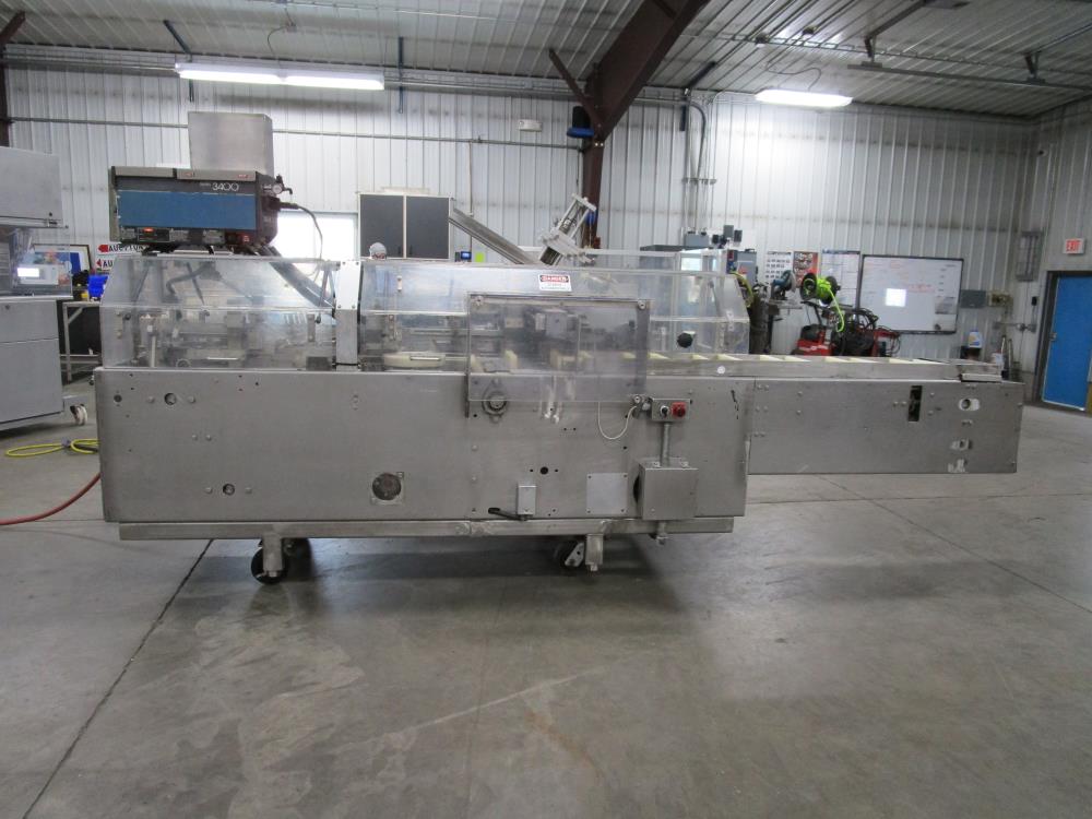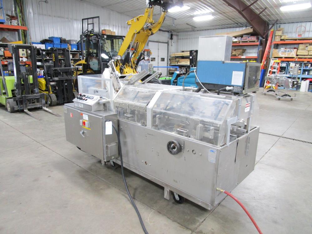 FMS cartoner. Model 2000B, SN 1289. Product infeed, lug spacing, 6.25 in. clearance in between lugs or 3.5 in. spacing between lugs x 2 in. tall. Side push infeed. Adjustable carton magazine 24 in. long, up to 15 in. wide, with 2 suction cups and vacuum pump. Cartoner chain is 12 in. on centers, 8 in. wide outside to outside lug. Nordson series 3400 gluer. Adjustable speed control. SS frame on casters. Electrical requirement 208-volt, 3 phase, 60 hz, 30 amp.