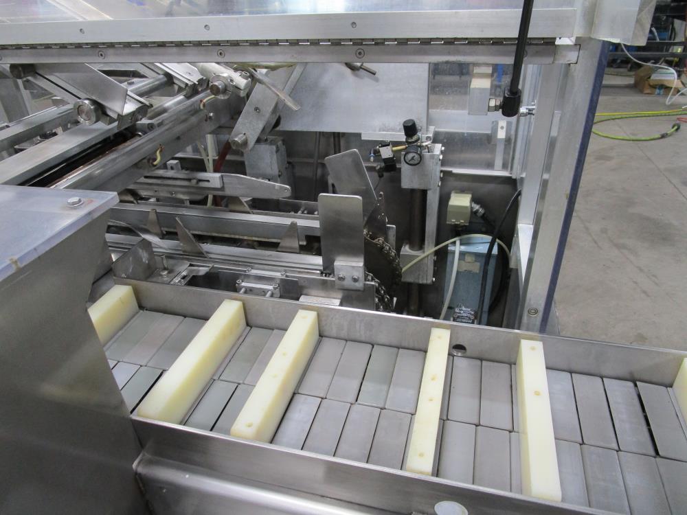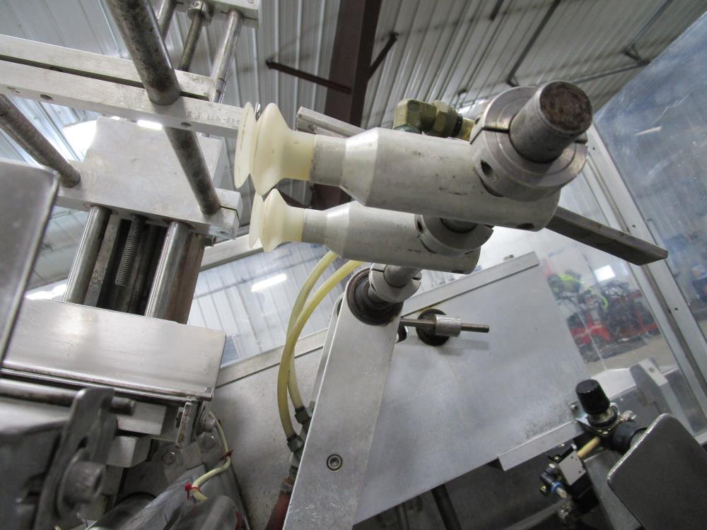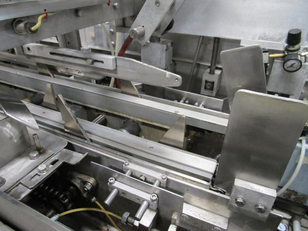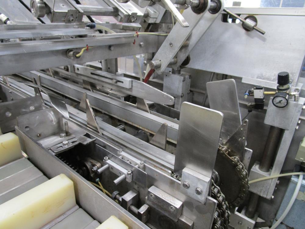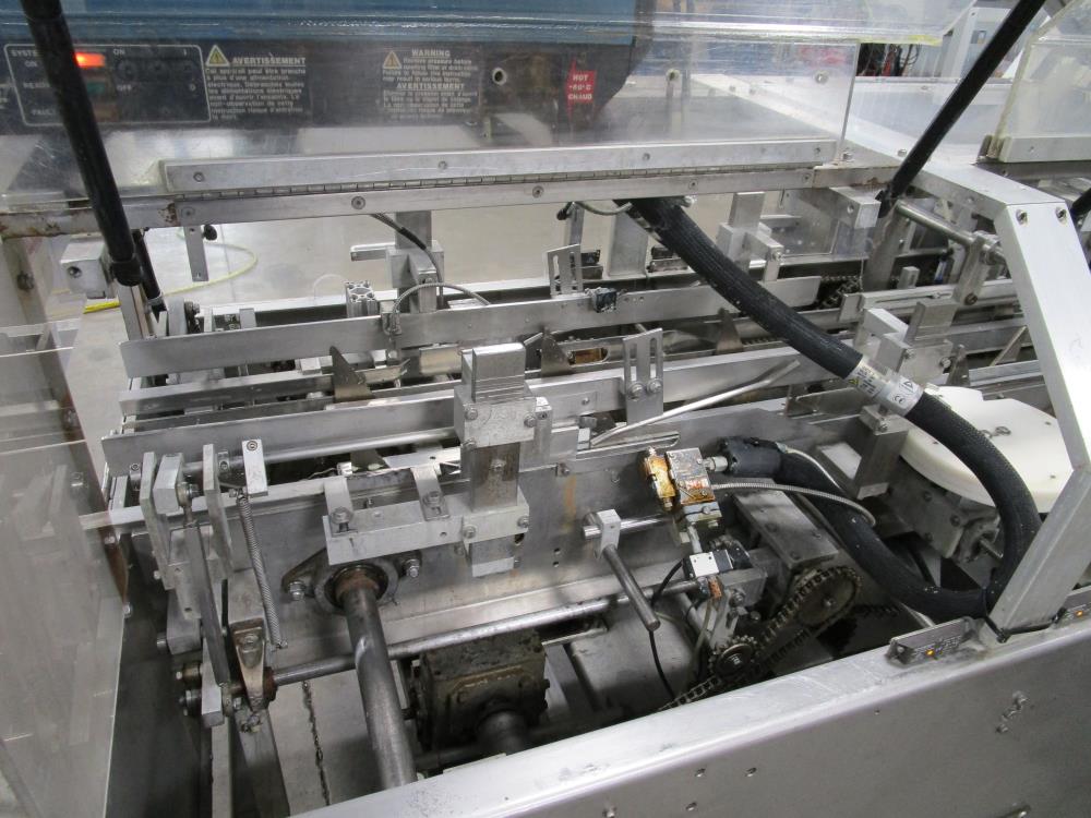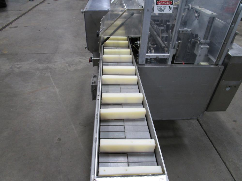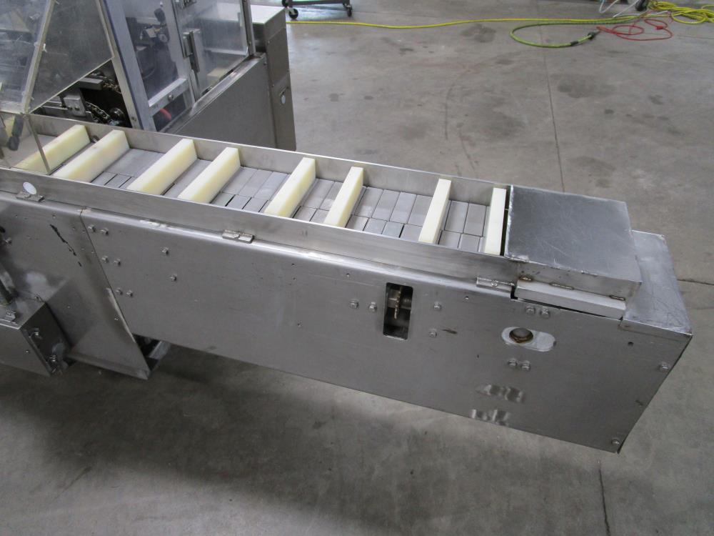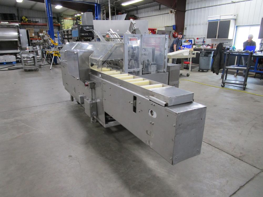 FMS cartoner. Model 2000B, SN 1289. Product infeed, lug spacing, 6.25 in. clearance in between lugs or 3.5 in. spacing between lugs x 2 in. tall. Side push infeed. Adjustable carton magazine 24 in. long, up to 15 in. wide, with 2 suction cups and vacuum pump. Cartoner chain is 12 in. on centers, 8 in. wide outside to outside lug. Nordson series 3400 gluer. Adjustable speed control. SS frame on casters. Electrical requirement 208-volt, 3 phase, 60 hz, 30 amp.