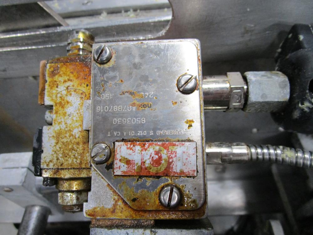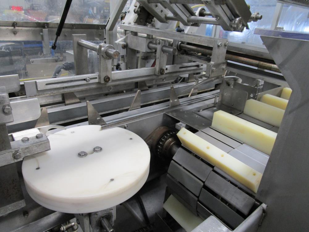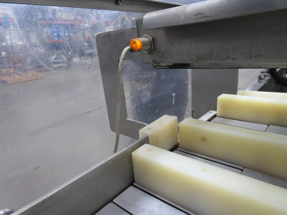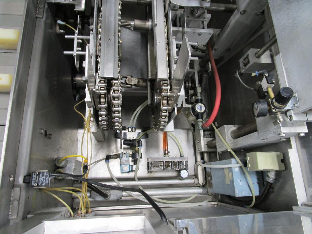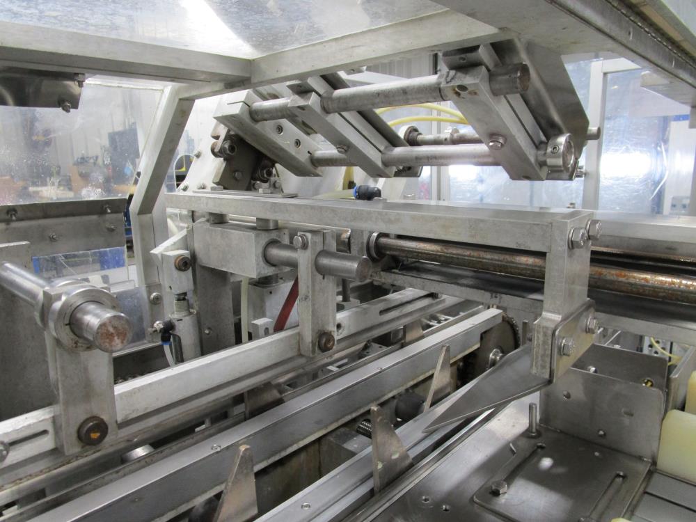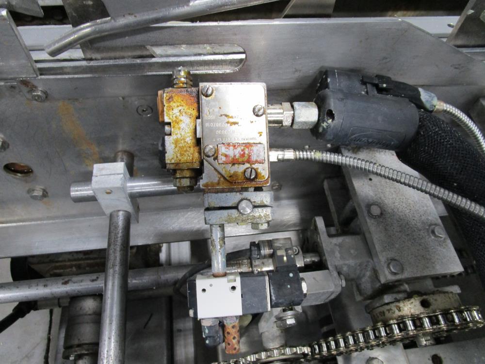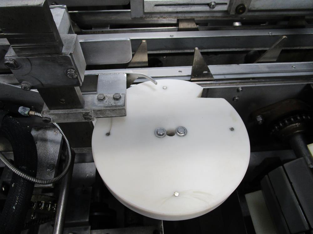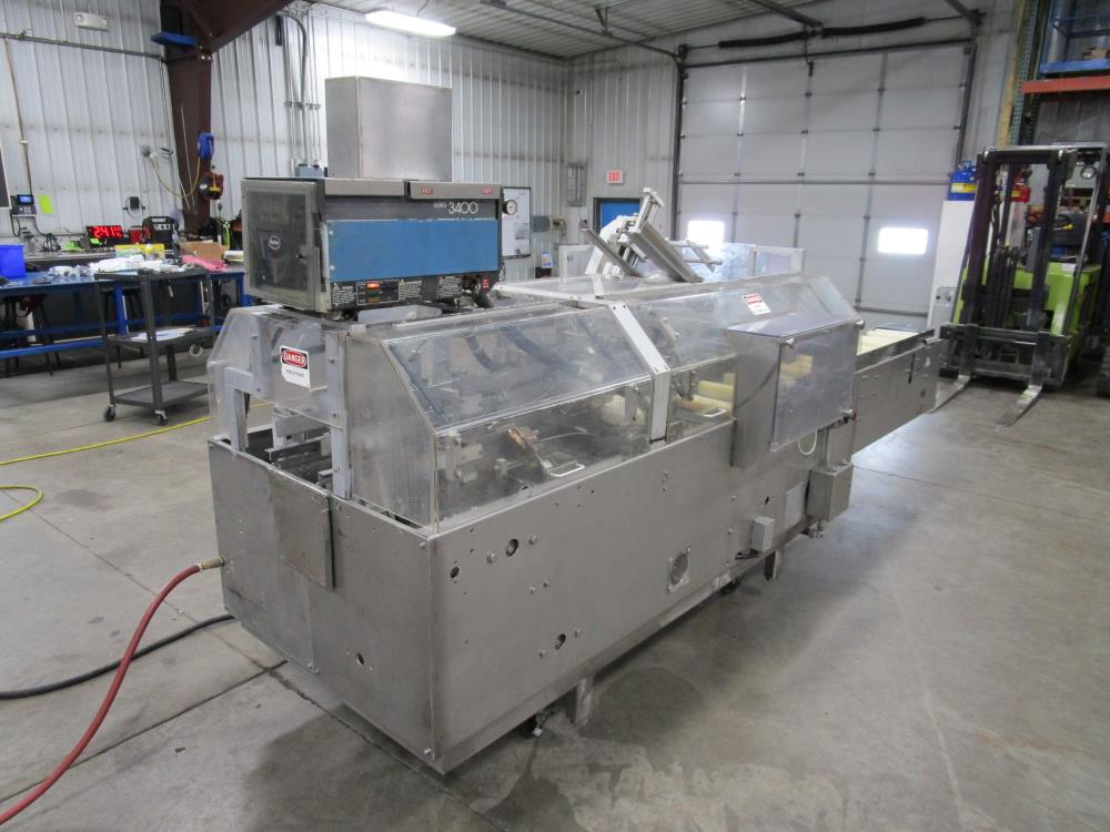 FMS cartoner. Model 2000B, SN 1289. Product infeed, lug spacing, 6.25 in. clearance in between lugs or 3.5 in. spacing between lugs x 2 in. tall. Side push infeed. Adjustable carton magazine 24 in. long, up to 15 in. wide, with 2 suction cups and vacuum pump. Cartoner chain is 12 in. on centers, 8 in. wide outside to outside lug. Nordson series 3400 gluer. Adjustable speed control. SS frame on casters. Electrical requirement 208-volt, 3 phase, 60 hz, 30 amp.