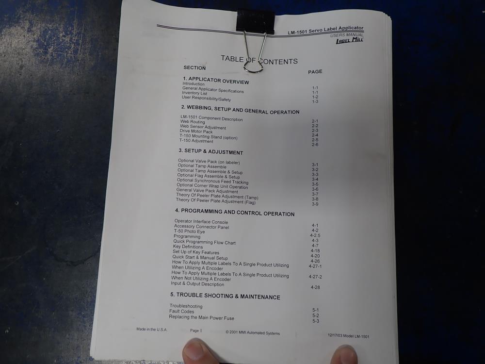 LabelMill servo label applicator. Model LM-1501, SN 223806C0AC. 6 in. tall label stand with 6 in. tall back plate. 8 in. diameter pacing wheel. Top hold down belt 24 in. long x 5/8 in. wide. Manual height adjustment. White plastic conveyor belt, 72 in. long x 5.5 in. wide x 32 in. tall. 8 in. color touch screen hmi. Low label indicator. Modular frame, on casters, with adjustable legs.